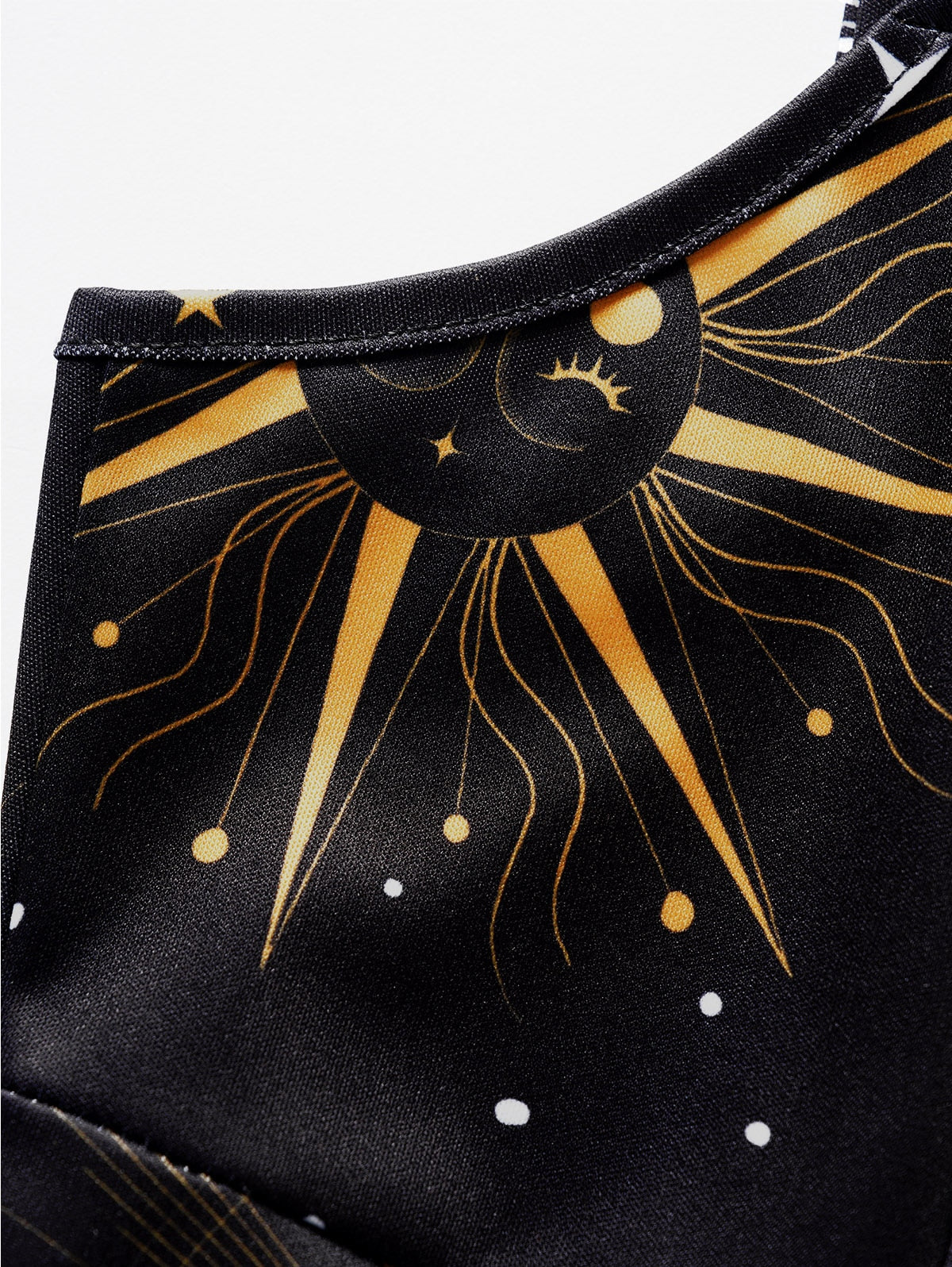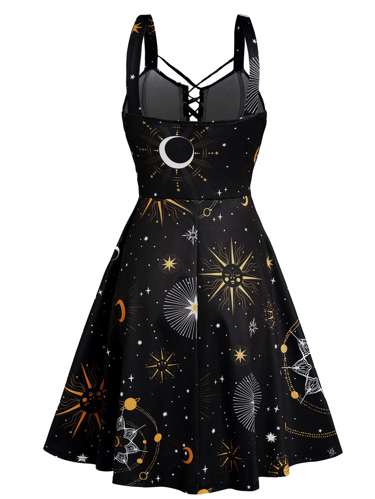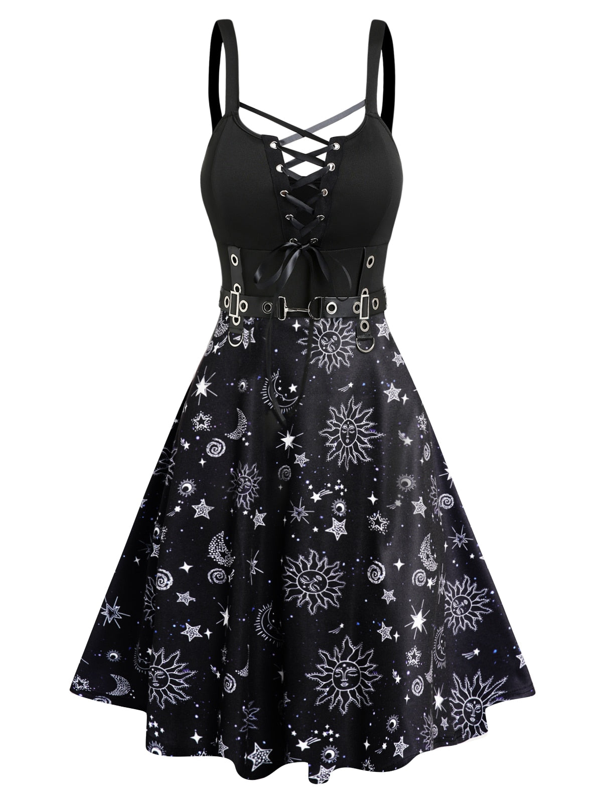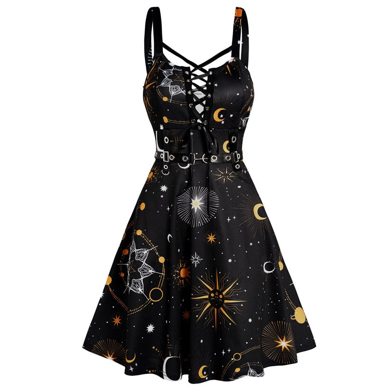 Getadme Summer Sun Moon Star Print Dress Lace Up Grommet Buckle Strap Crisscross High Waisted Fashion Mini Robe For Women
