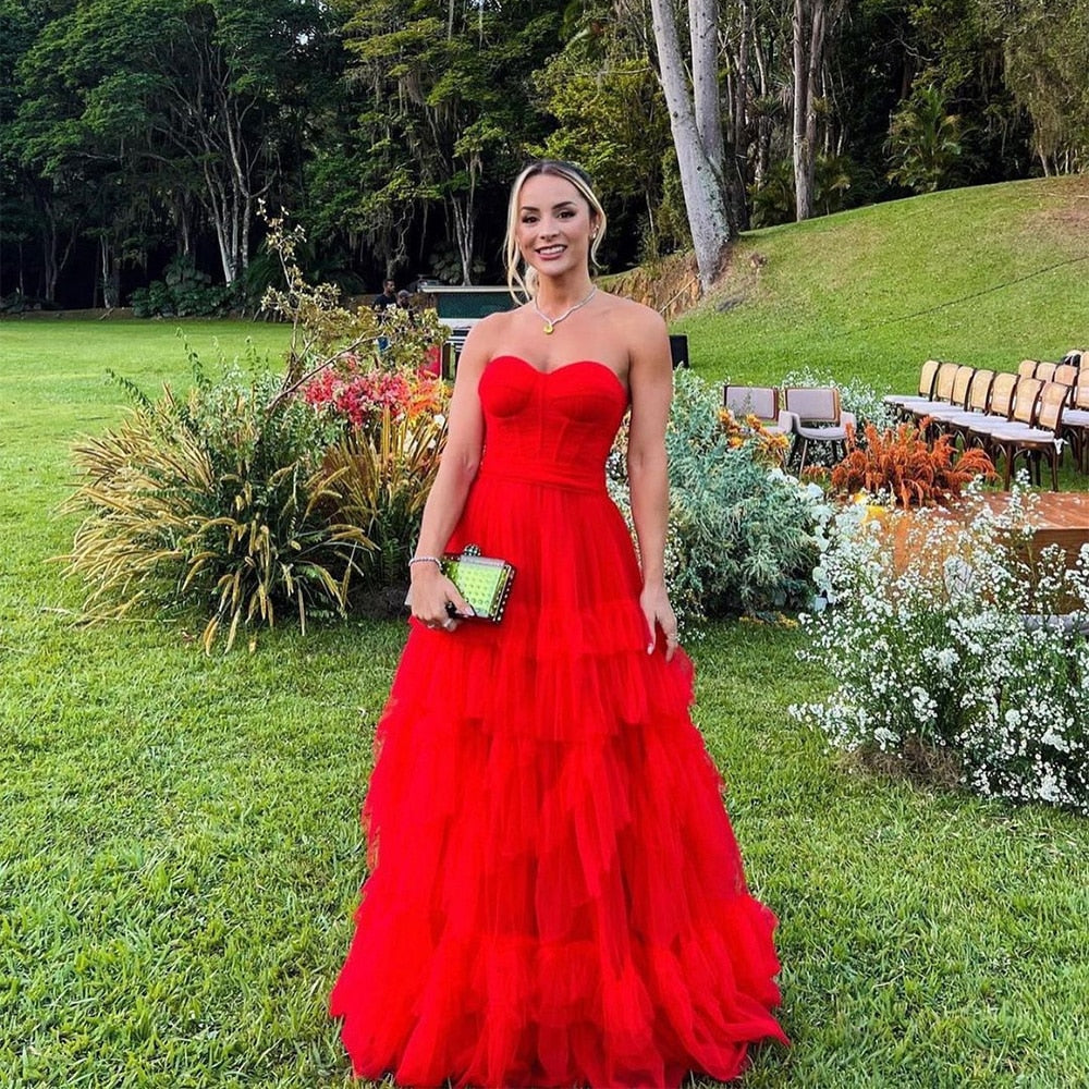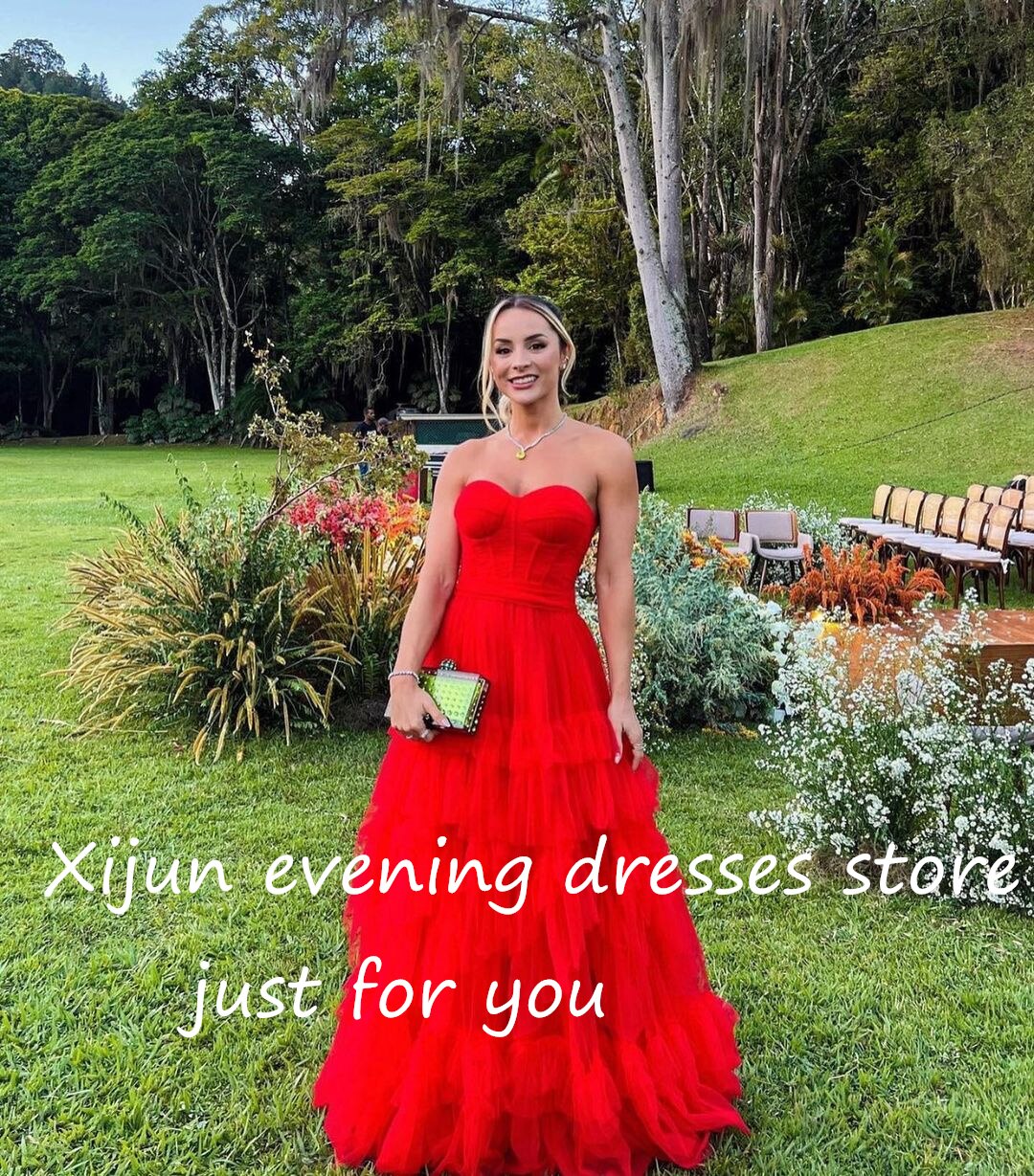 Getadme-Red Tiered Ruffles Tulle Evening Dresses Sweetheart Sleeveless A-Line Pleat Ruched Party Prom Gowns vestidos de festa