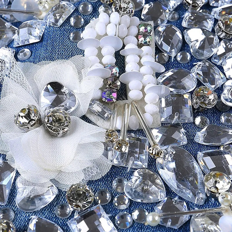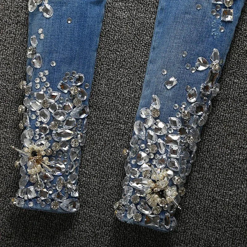 GETADME Fashion Vintage Women Luxury Embroidered Flares Diamond Denim Jeans Women Beaded Skinny Slim Fit Stretch Pencil Pants Trousers