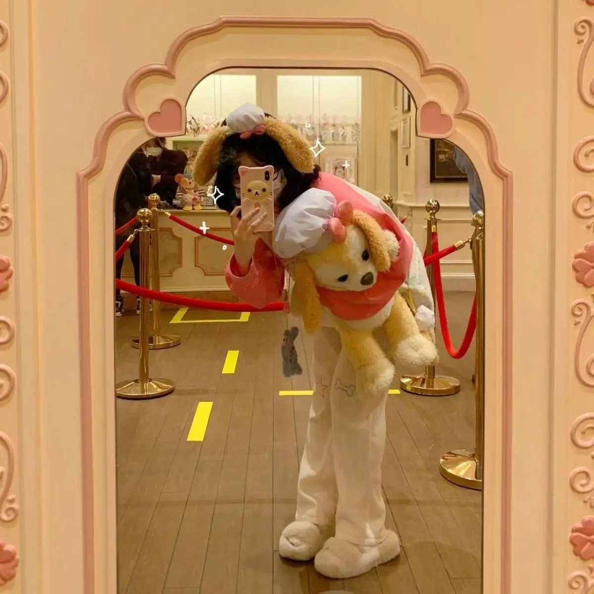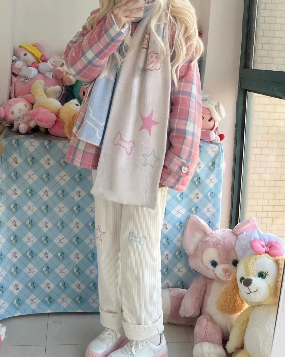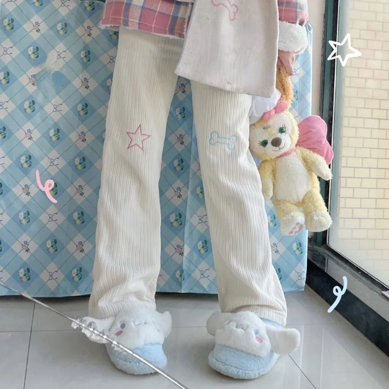 GETADME Harajuku Kawaii White Corduroy Pants Women Japanese Style Sweet Cute Wide Leg Trousers Embroidery Girly Fleece Pantalon