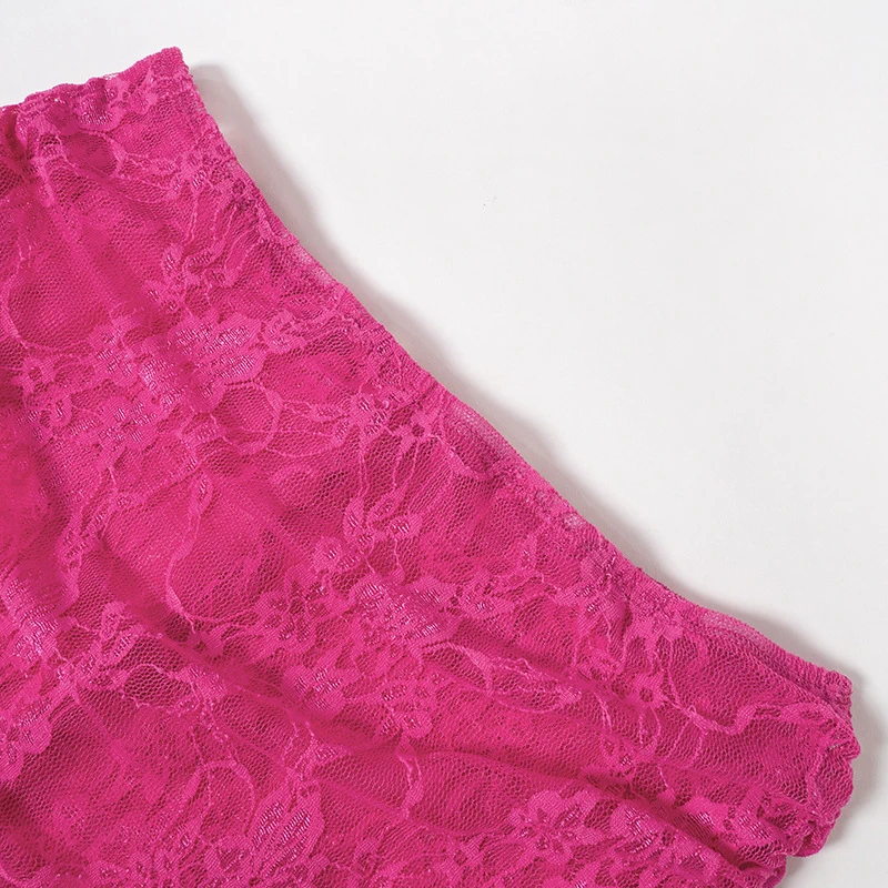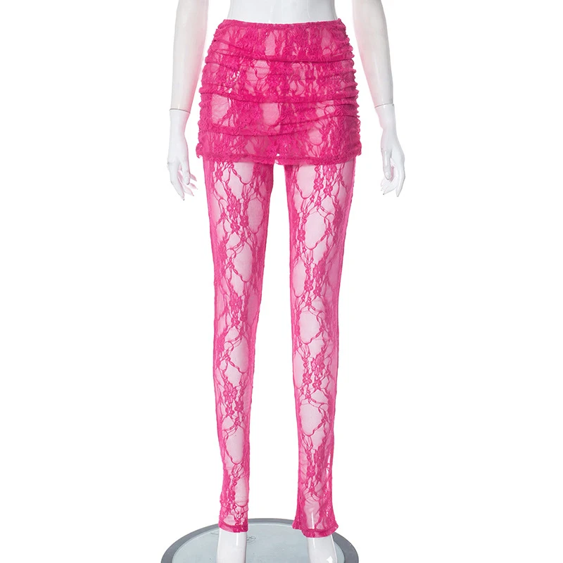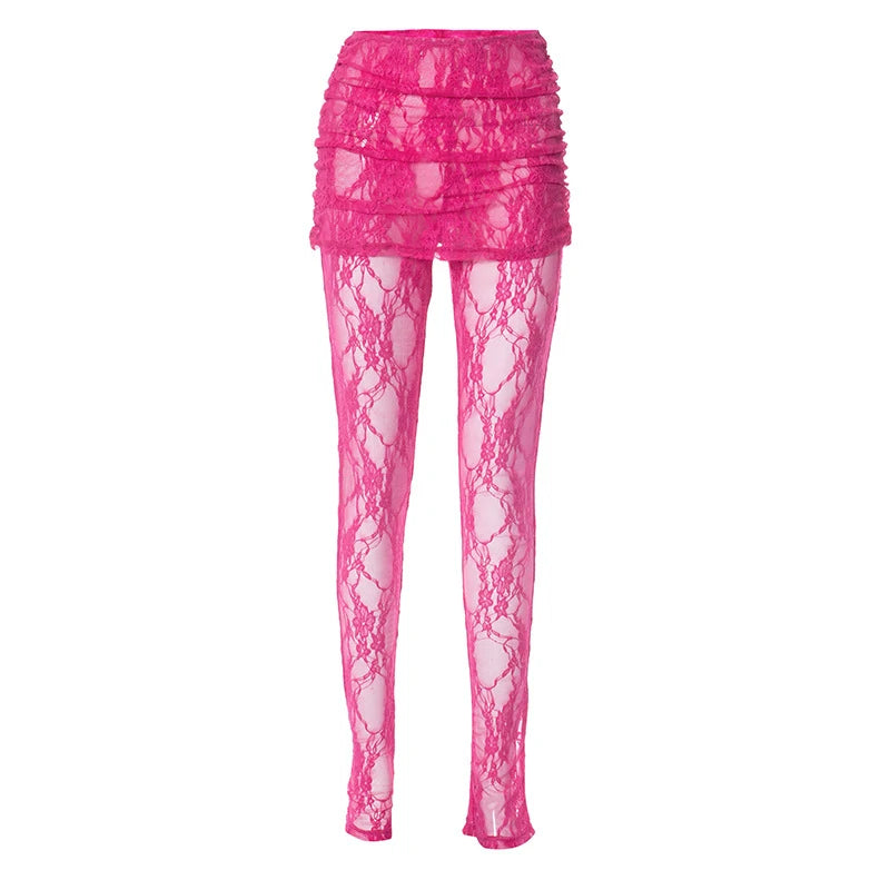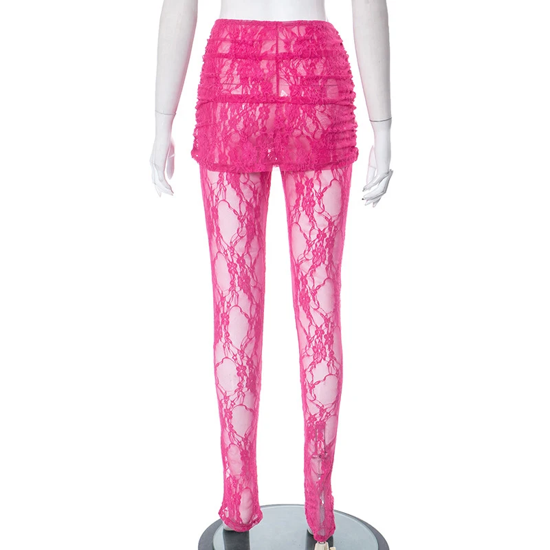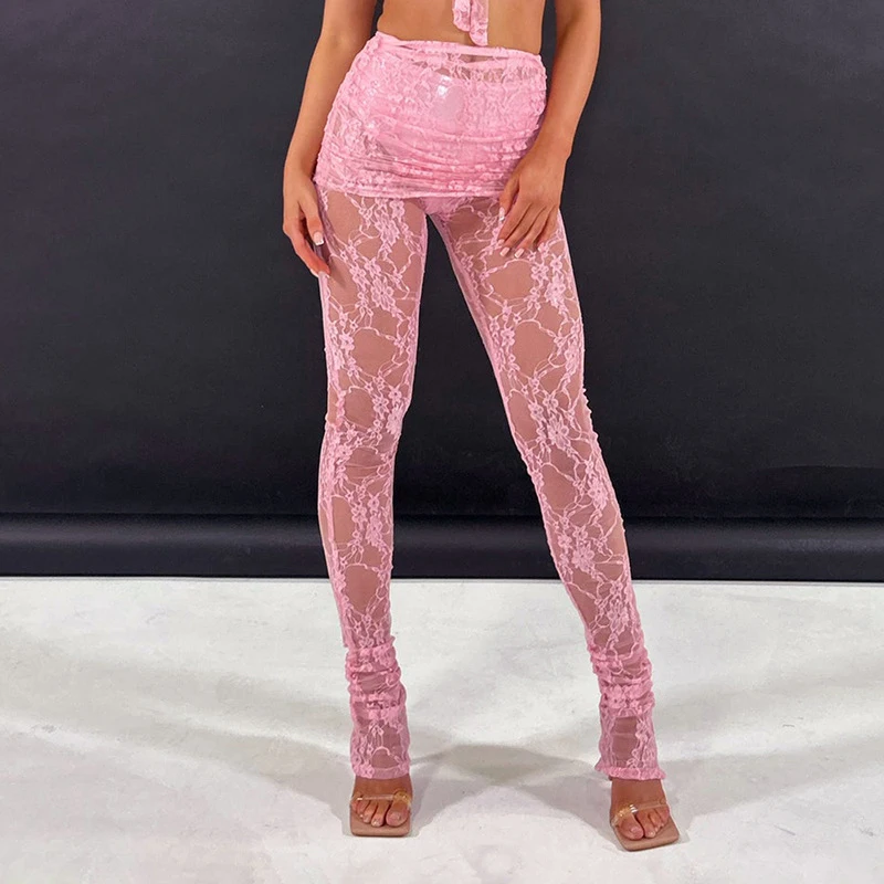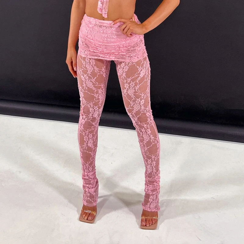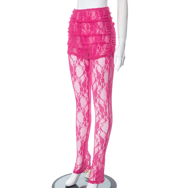 GETADME Sexy Lace Sheer Stacked Pants For Women Neon Pink High Waist Slim Night Club Trend Female Stunning Bottoms Streetwear Trousers