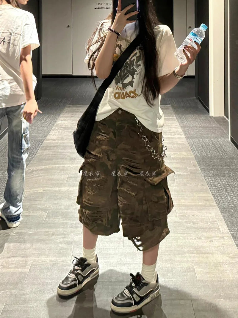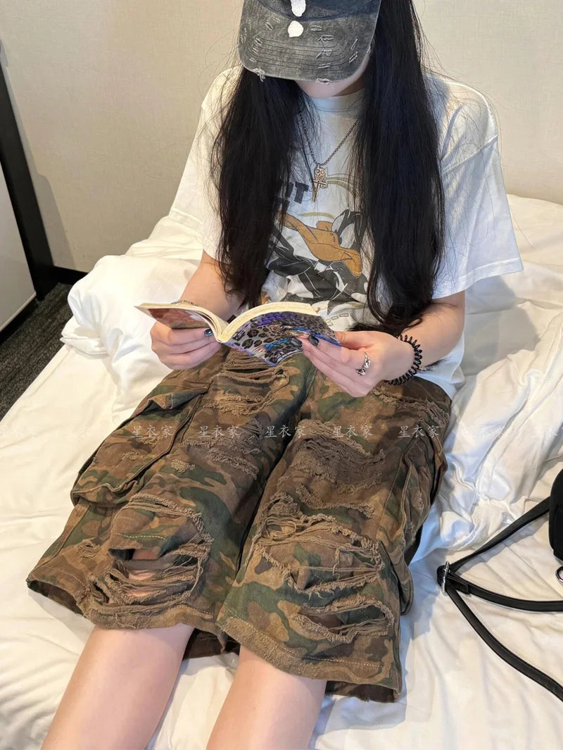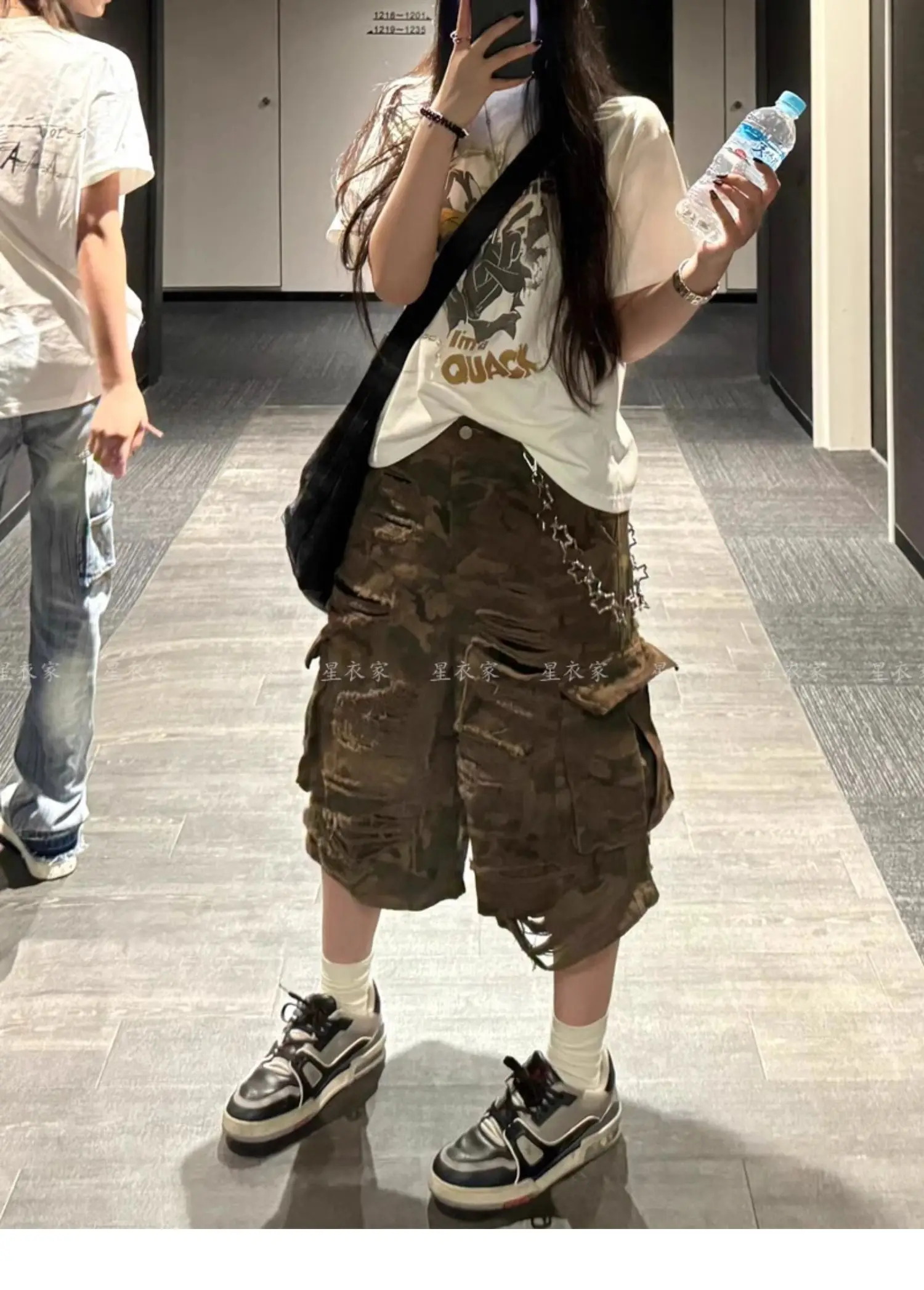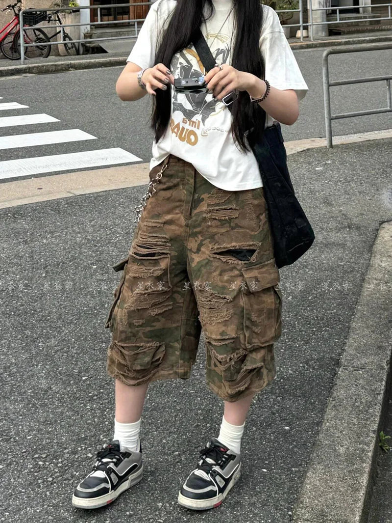 GETADME Women Y2K Streetwear Summer Camouflage Loose Capris Cargo Shorts Pocket Short Pants Bottom Acubi Trousers 2000s Alt Clothes
