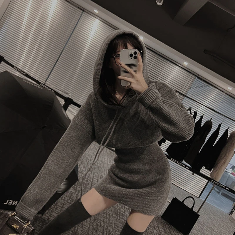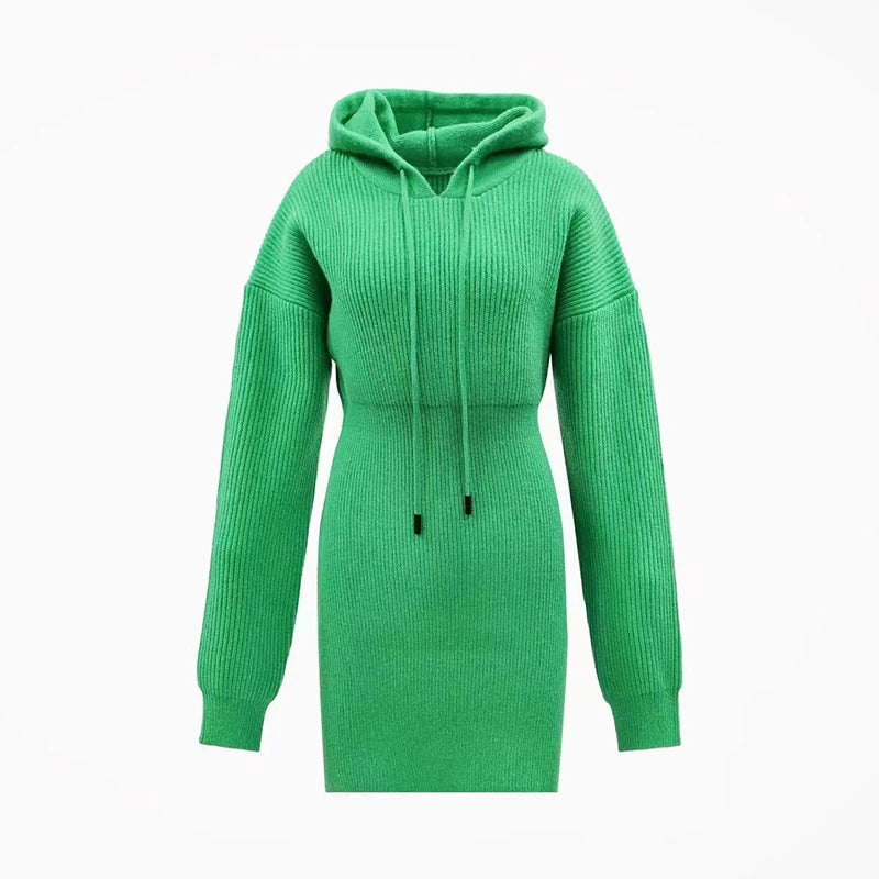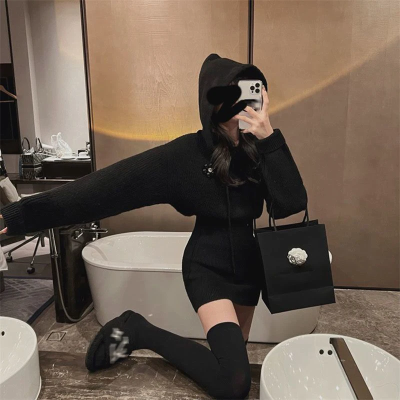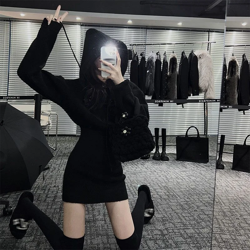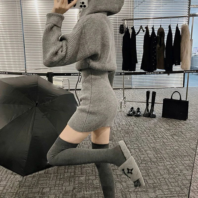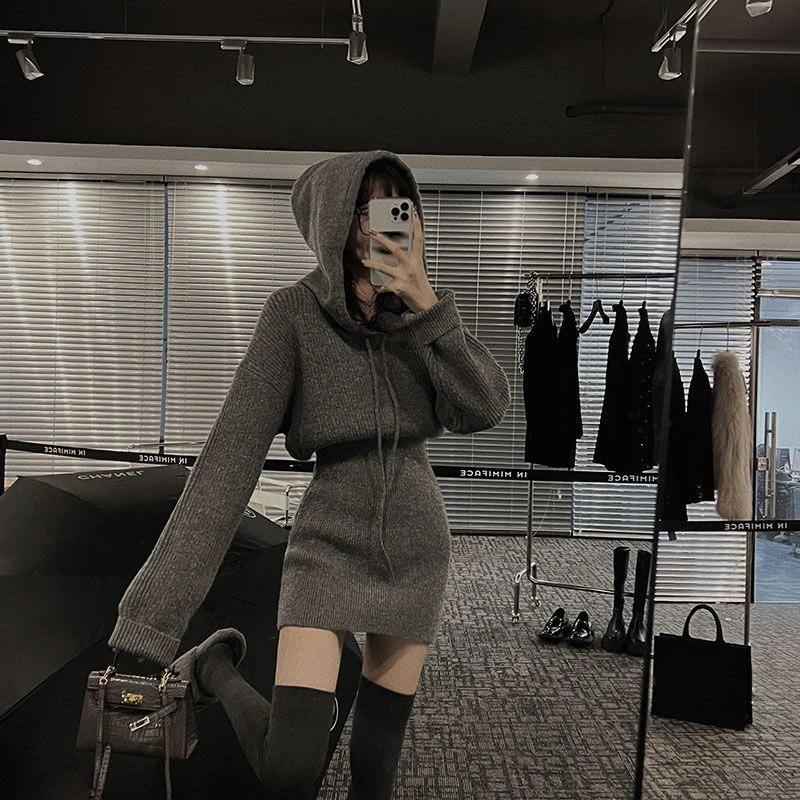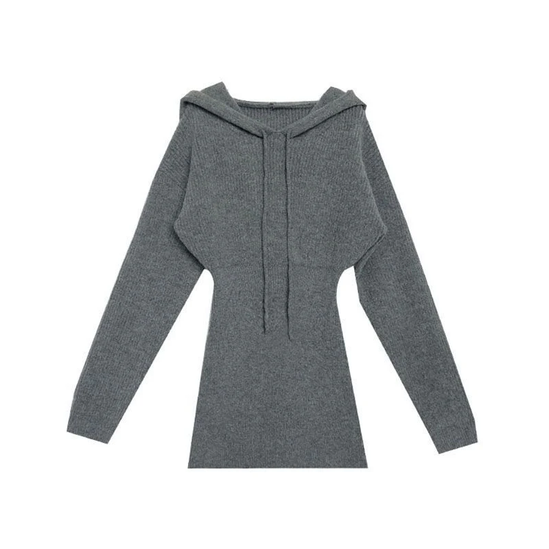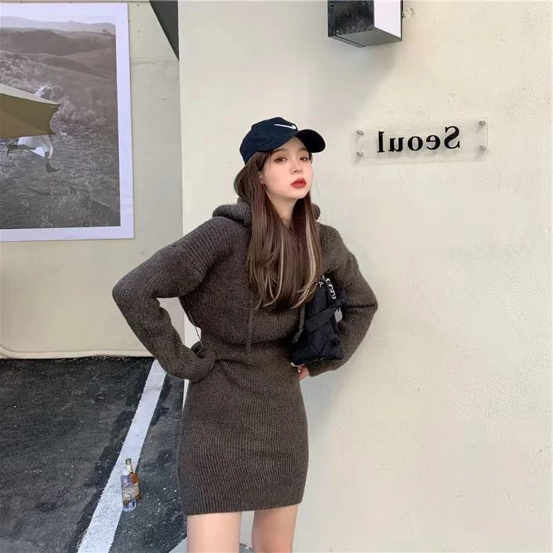 GETADME MEXZT Streetwear Knitted Mini Dress Women Hooded Sweater A Line Dresses Winter Korean Solid High Waist Slim Casual Vestidos New