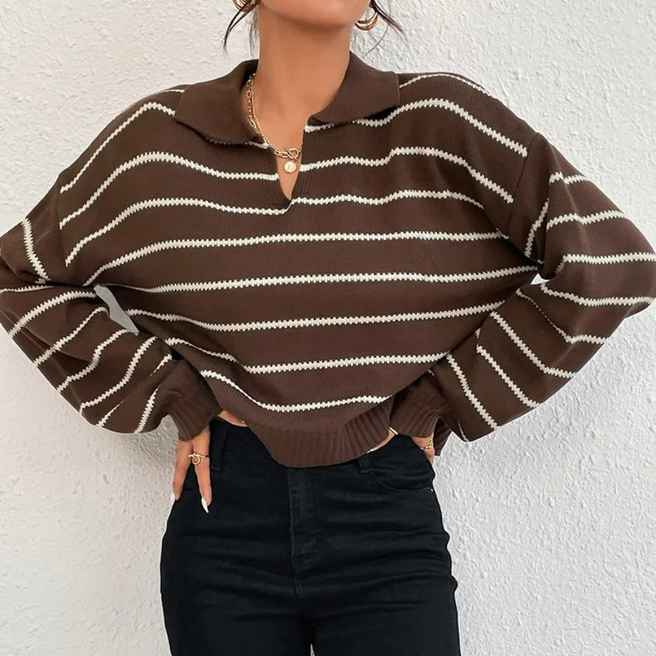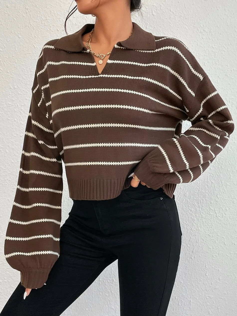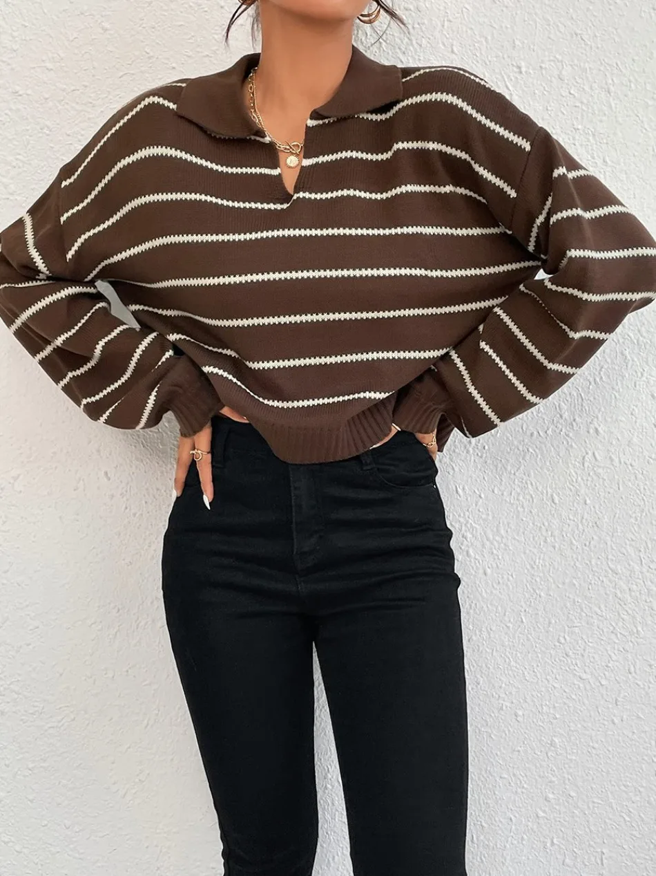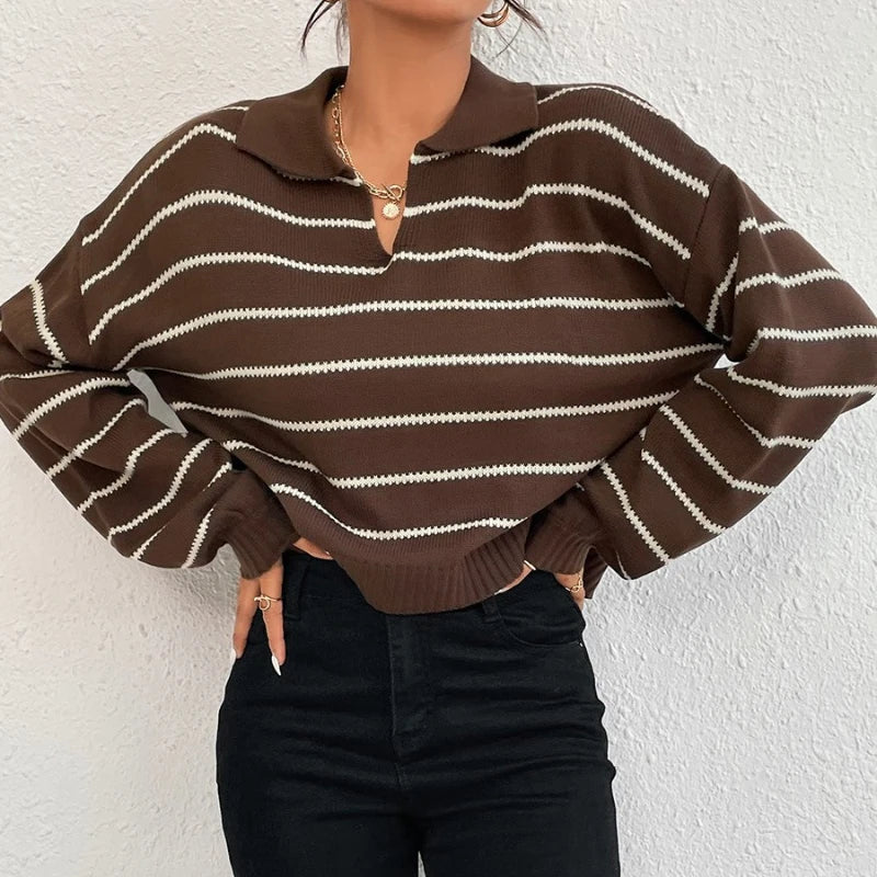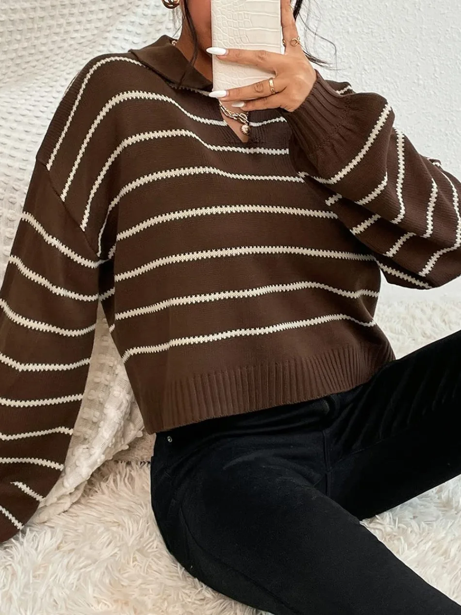 GETADME New European American POLO Collar Shoulder-sleeved Knitted Sweater Spring Autumn Casual Contrasting Striped Sweater Women