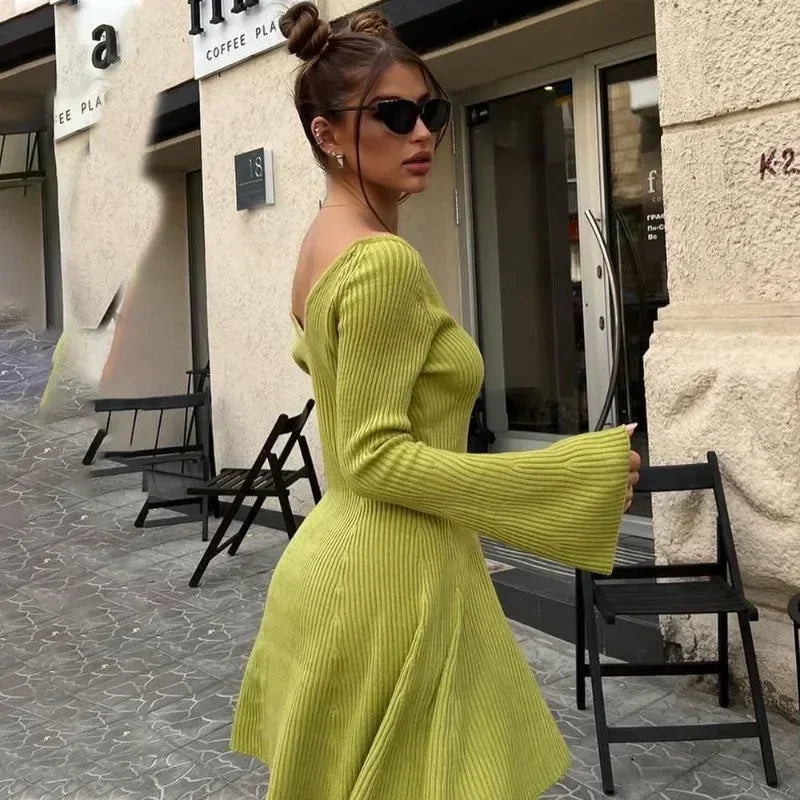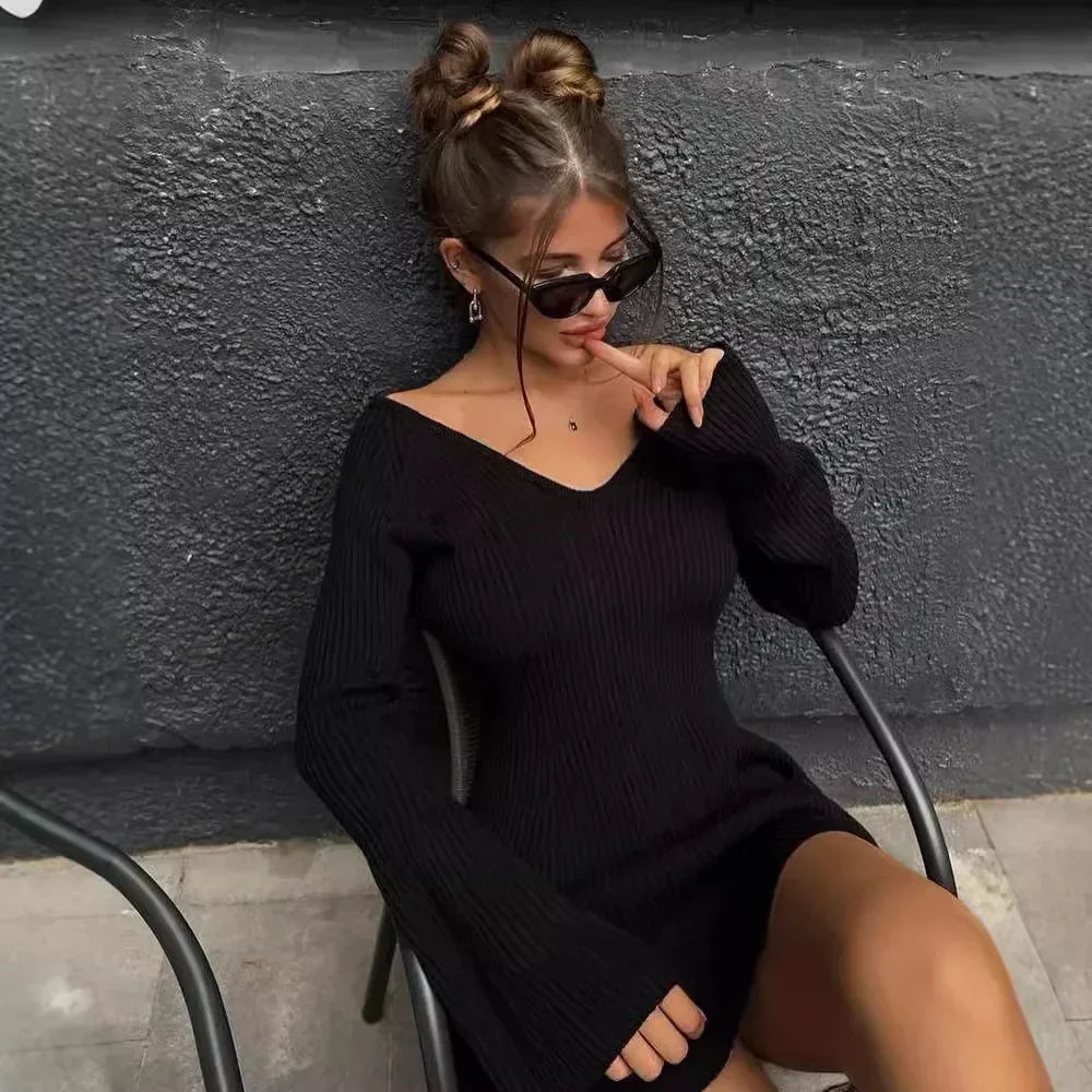GETADME Talenza Knitted Off Shoulder V Neck Mini Dress Women's Sexy High Waist Long Sleeve Dress White Knitted Sweater Dress Robe Women