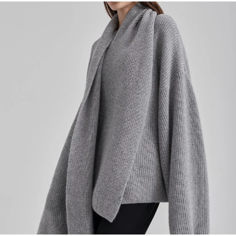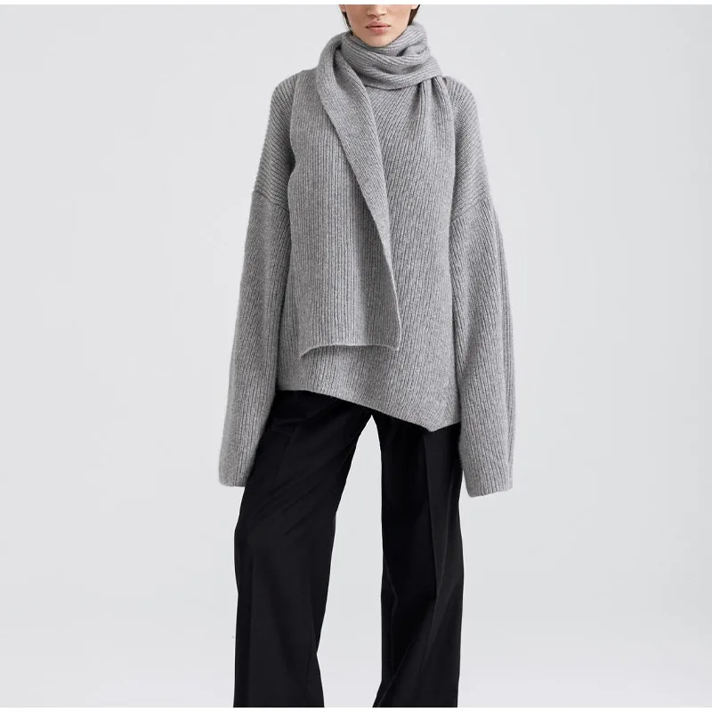 GETADME Women Fashion Grey Cropped Oversized Knitted Pullover Chic Scarf Collar Long Sleeve Loose Sweater 2024 Lady High Street Jumpers