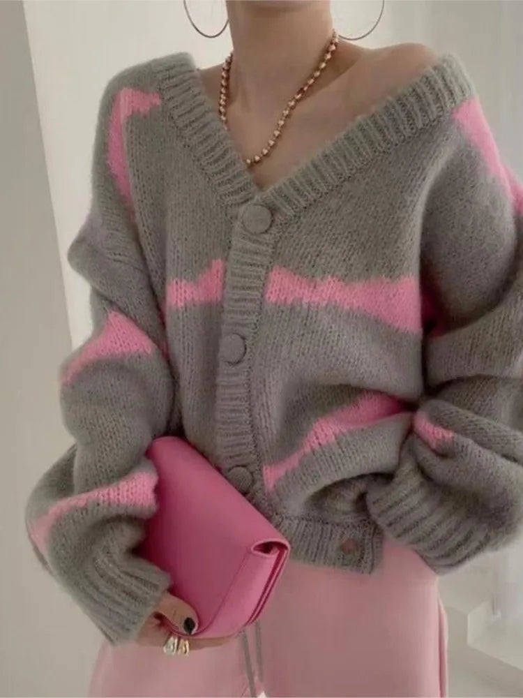 GETADME Women Loose Striped Sweaters Korea Loose V-neck Long Sleeve Knitting Cardigan Jacket Outfits Blusa Feminina Tops Mujer 2022