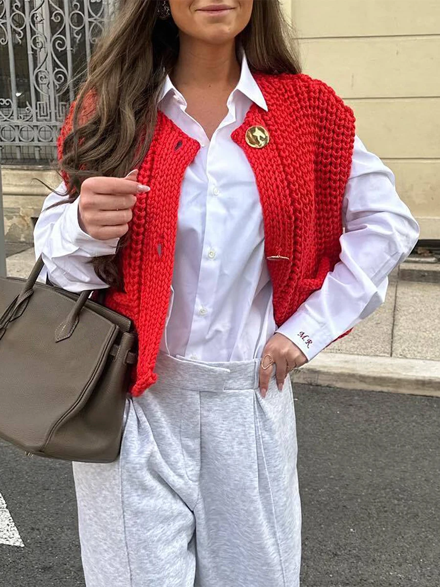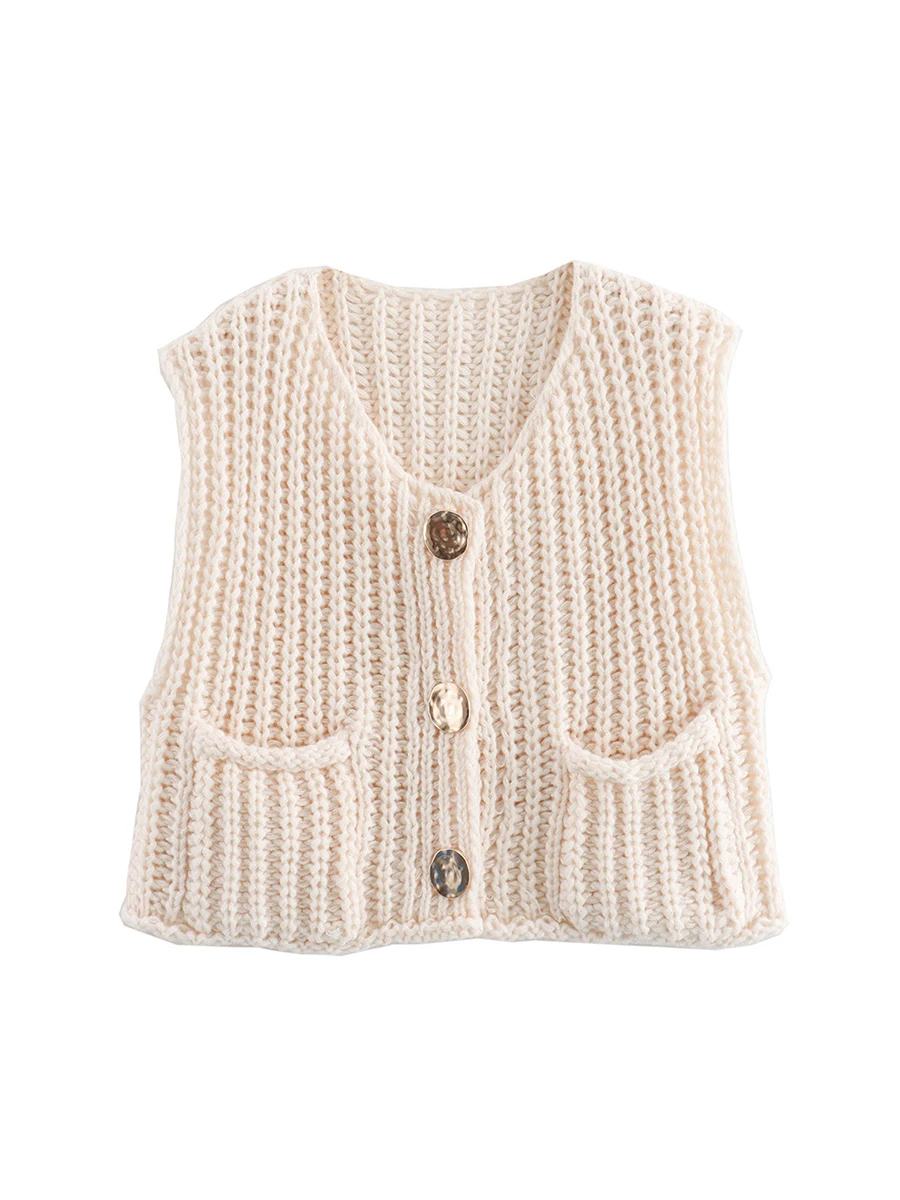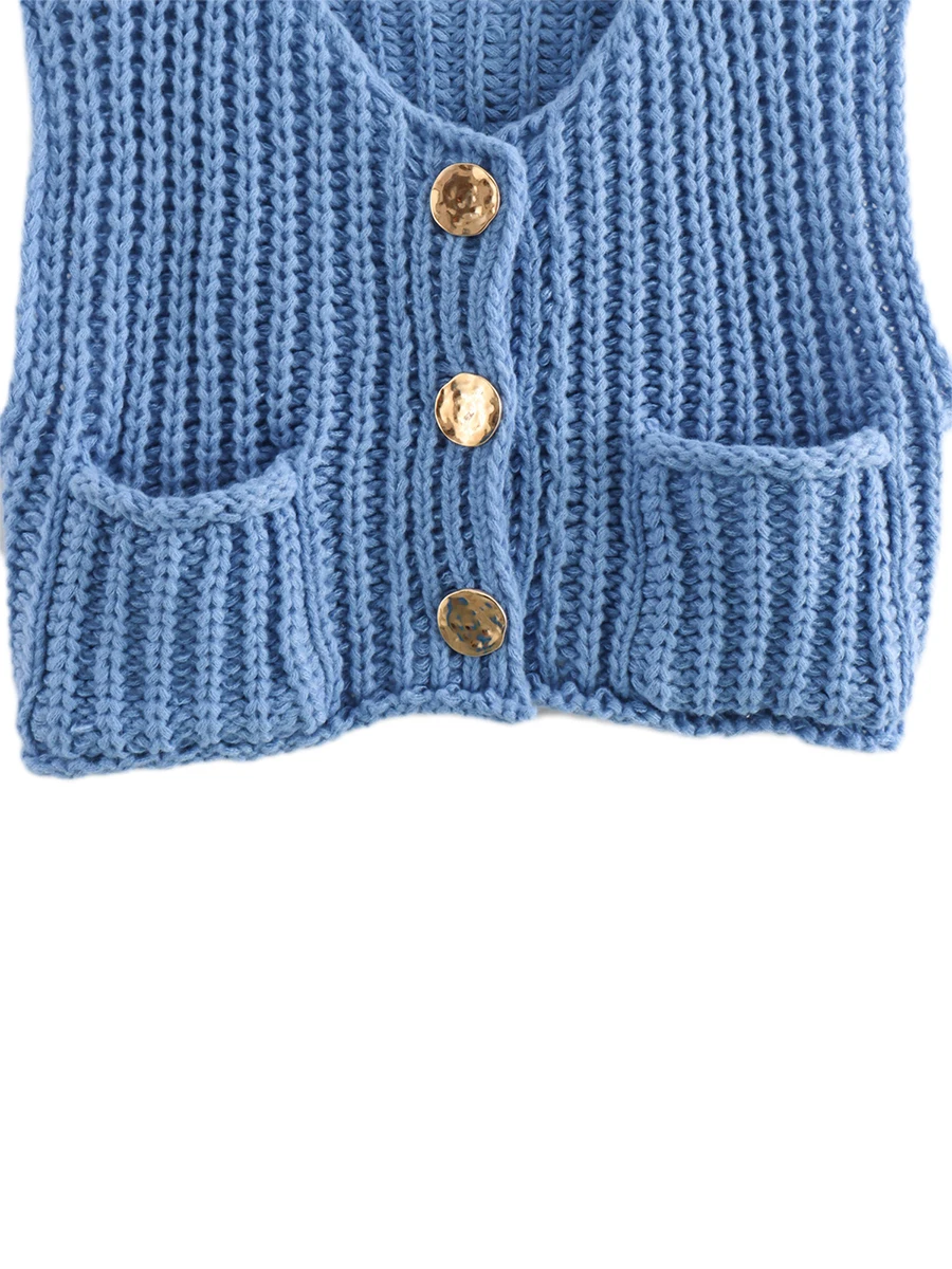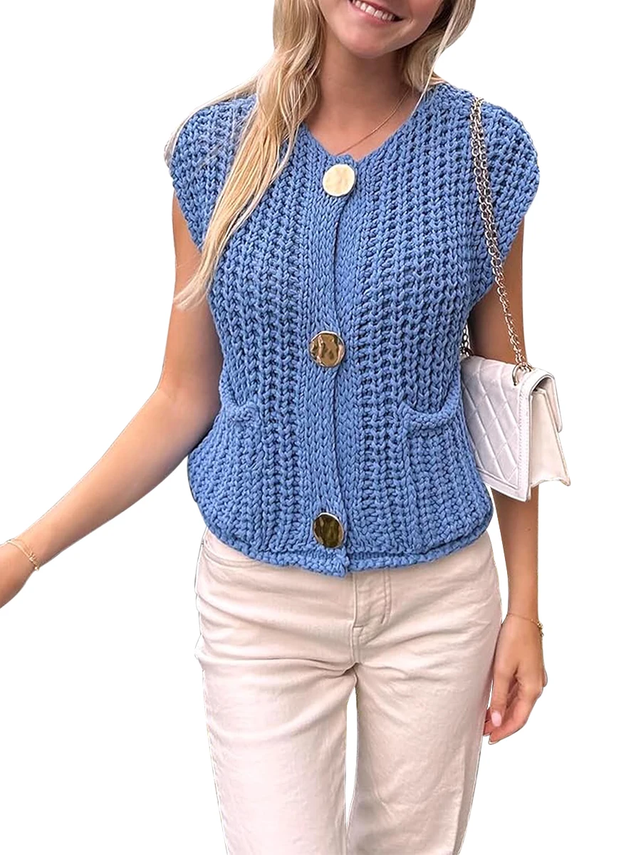 Women Sweater Tank Tops Solid Color Button Front V-Neck Knit Vest Sleeveless Knitwear Cardigan for Streetwear