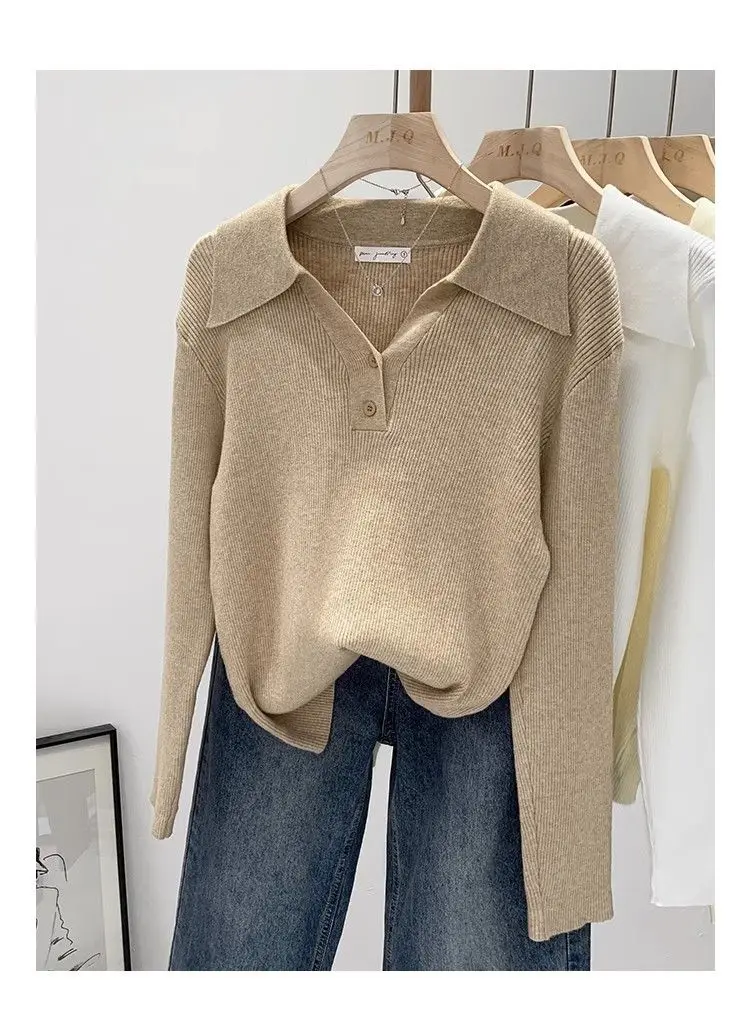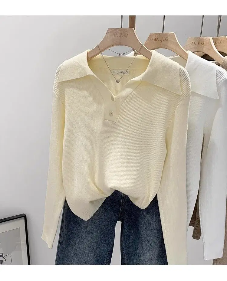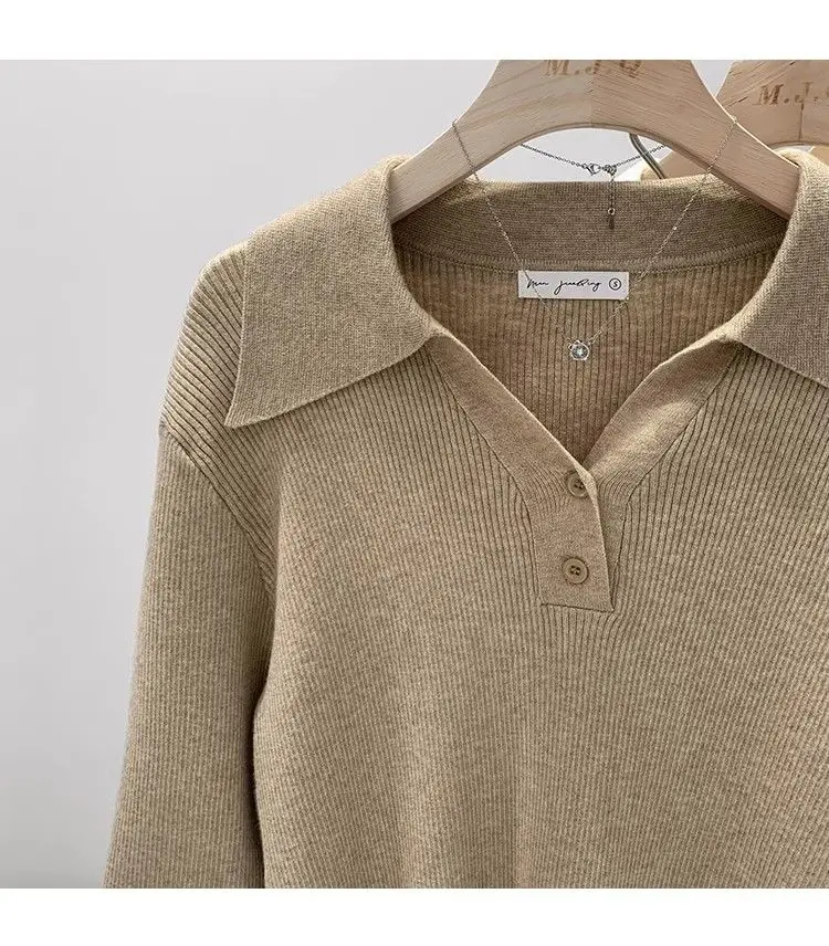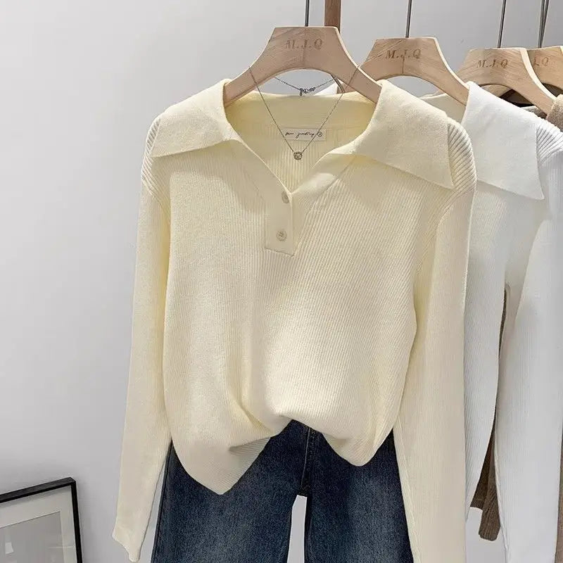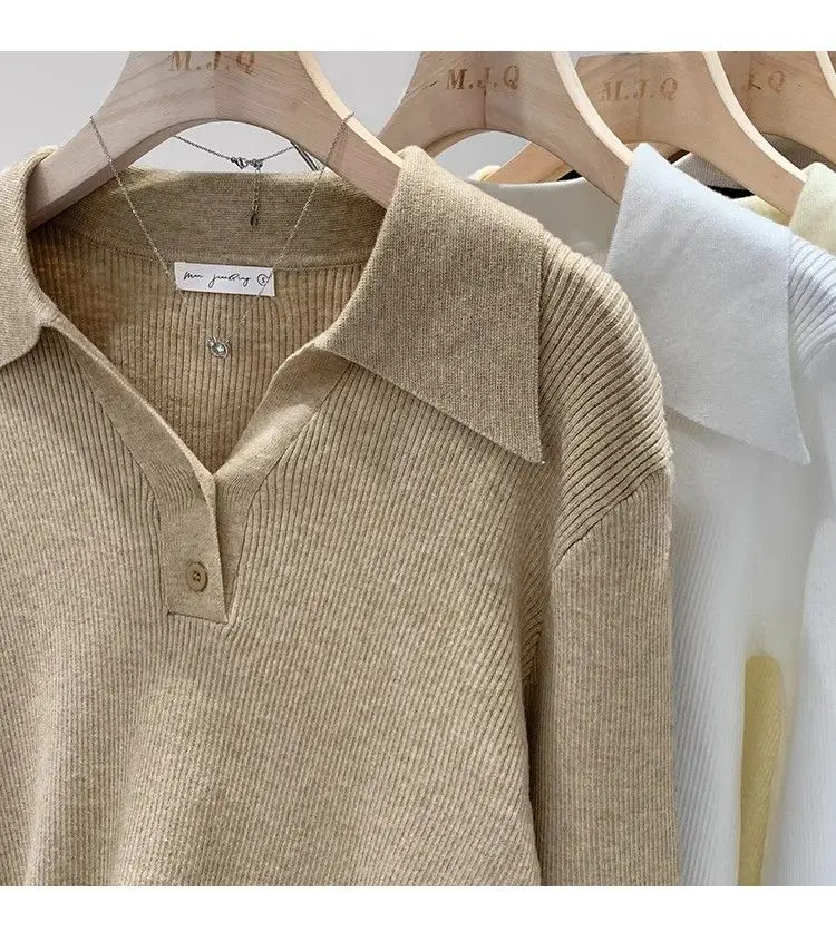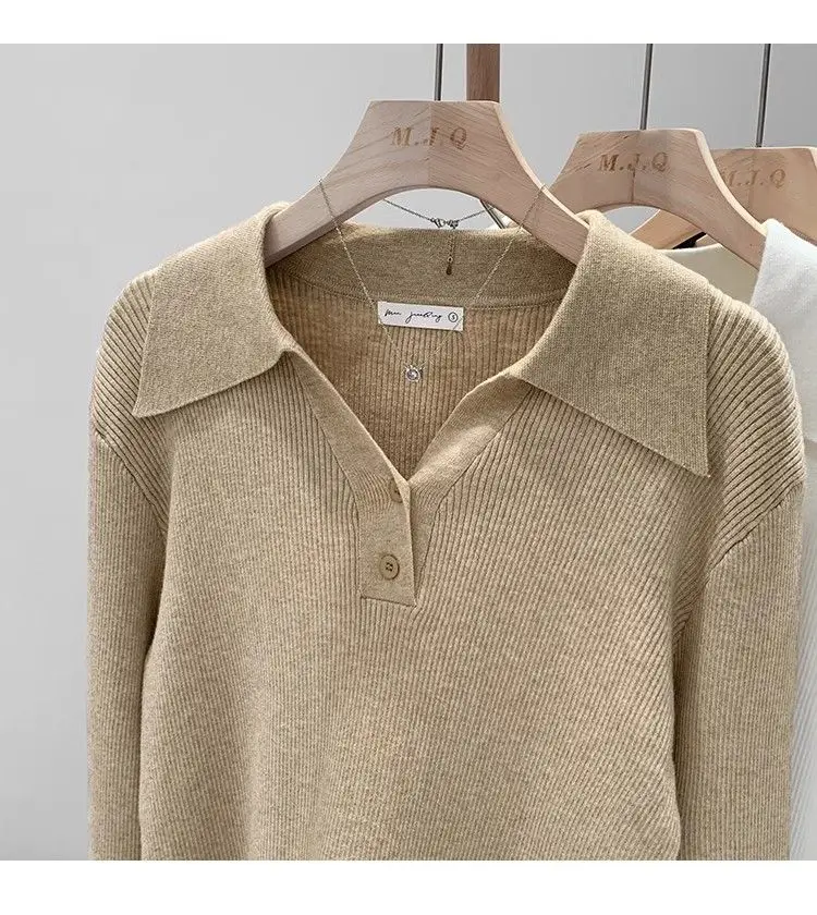 GETADME Women's Clothing Basic All-match Polo Collar Pullovers Autumn Winter Casual Loose Long Sleeve Sweaters Elegant Chic Button Tops