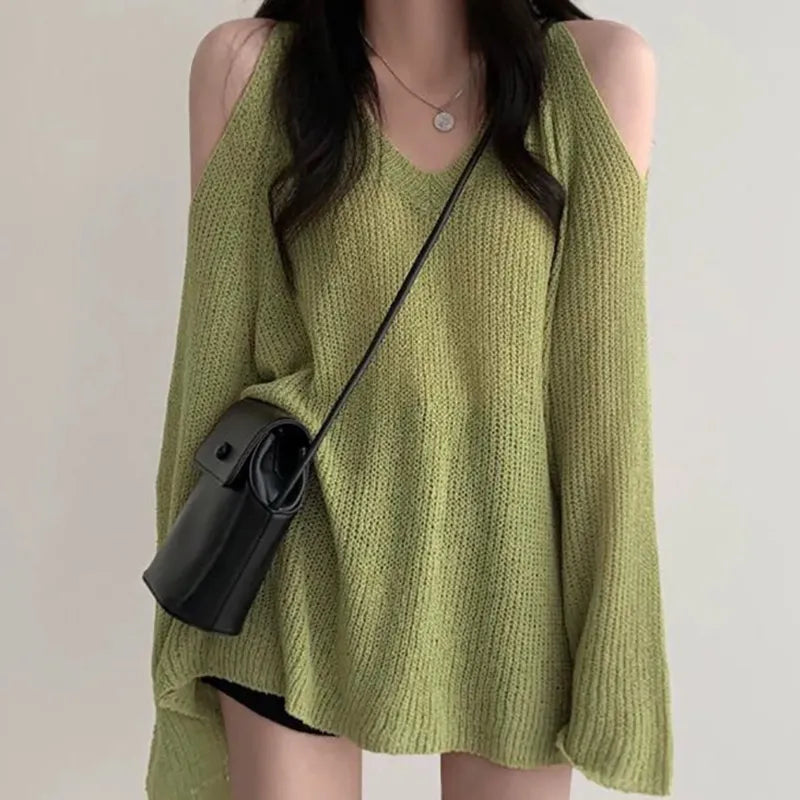 HELIAR Women V-Neck Off Shoulder Hollow Out Sweater Loose Long Sleeve Knit Thin Jumpers Streetwear Tops For Women Fall Winter