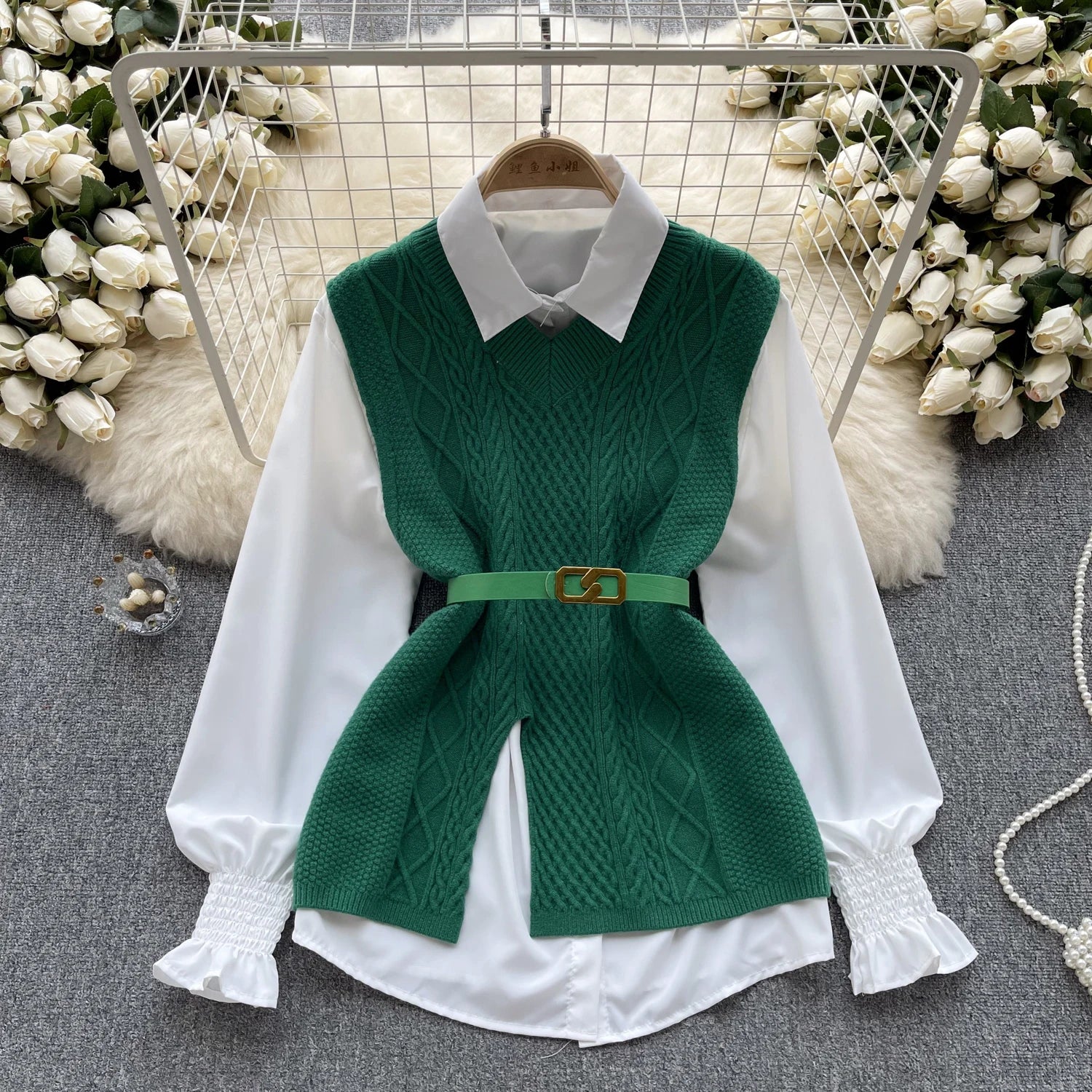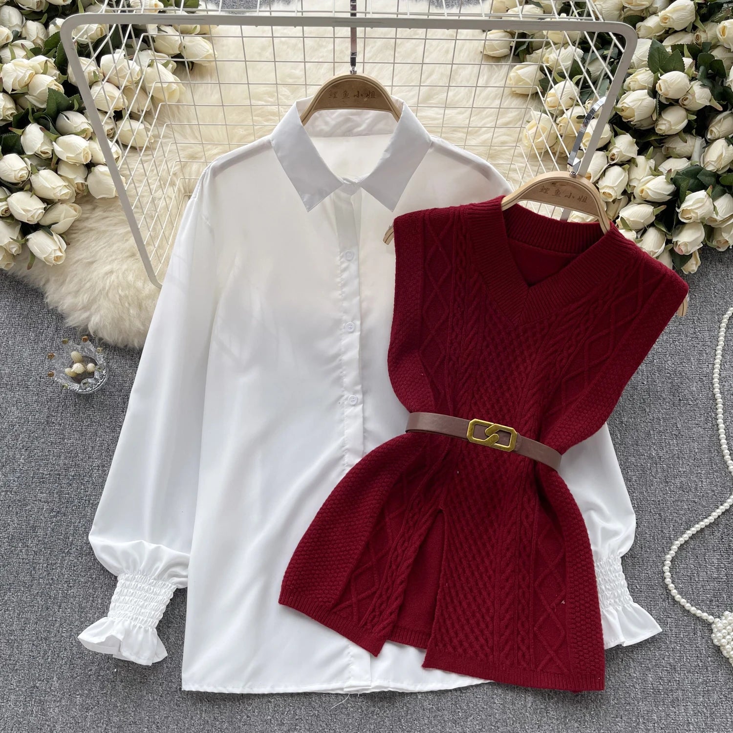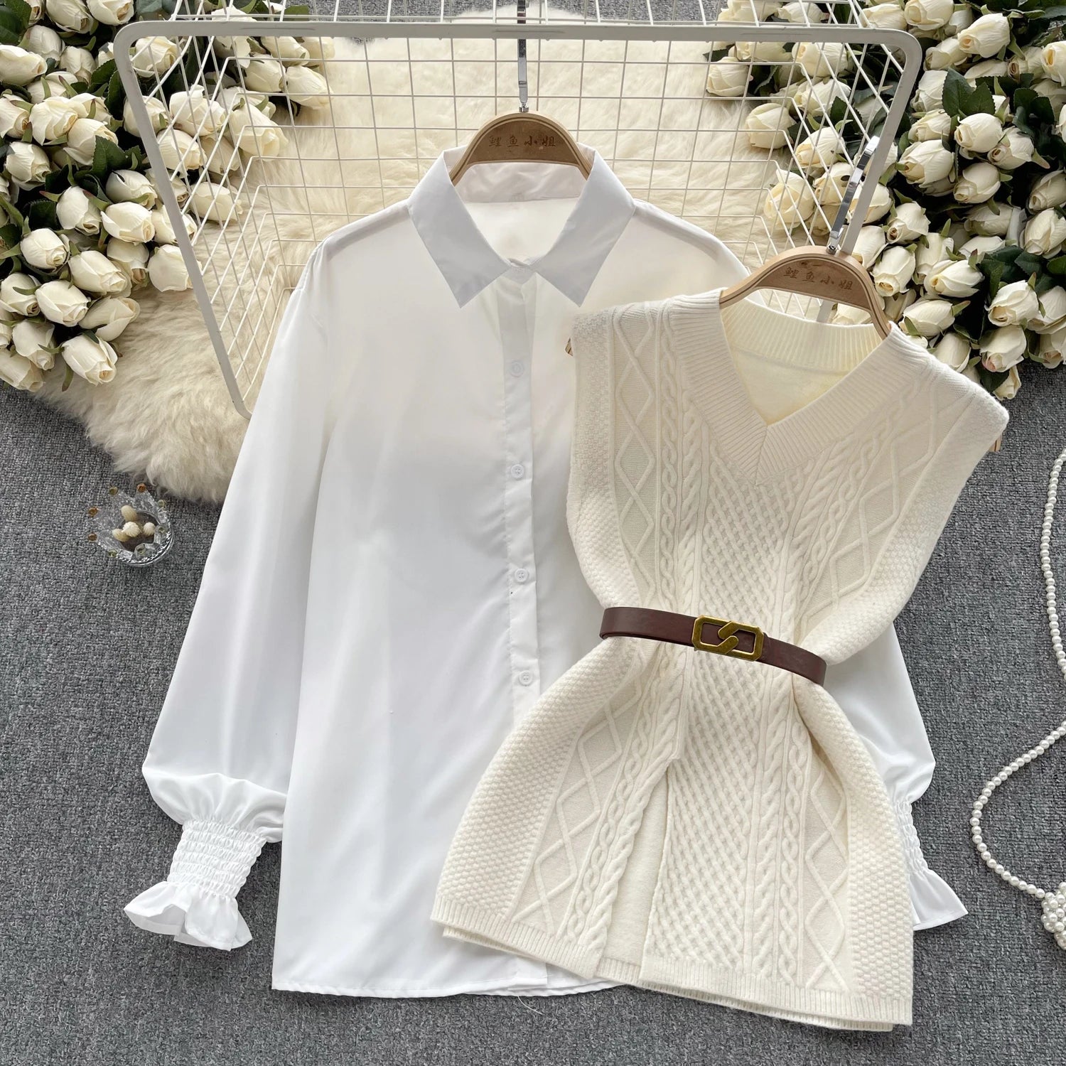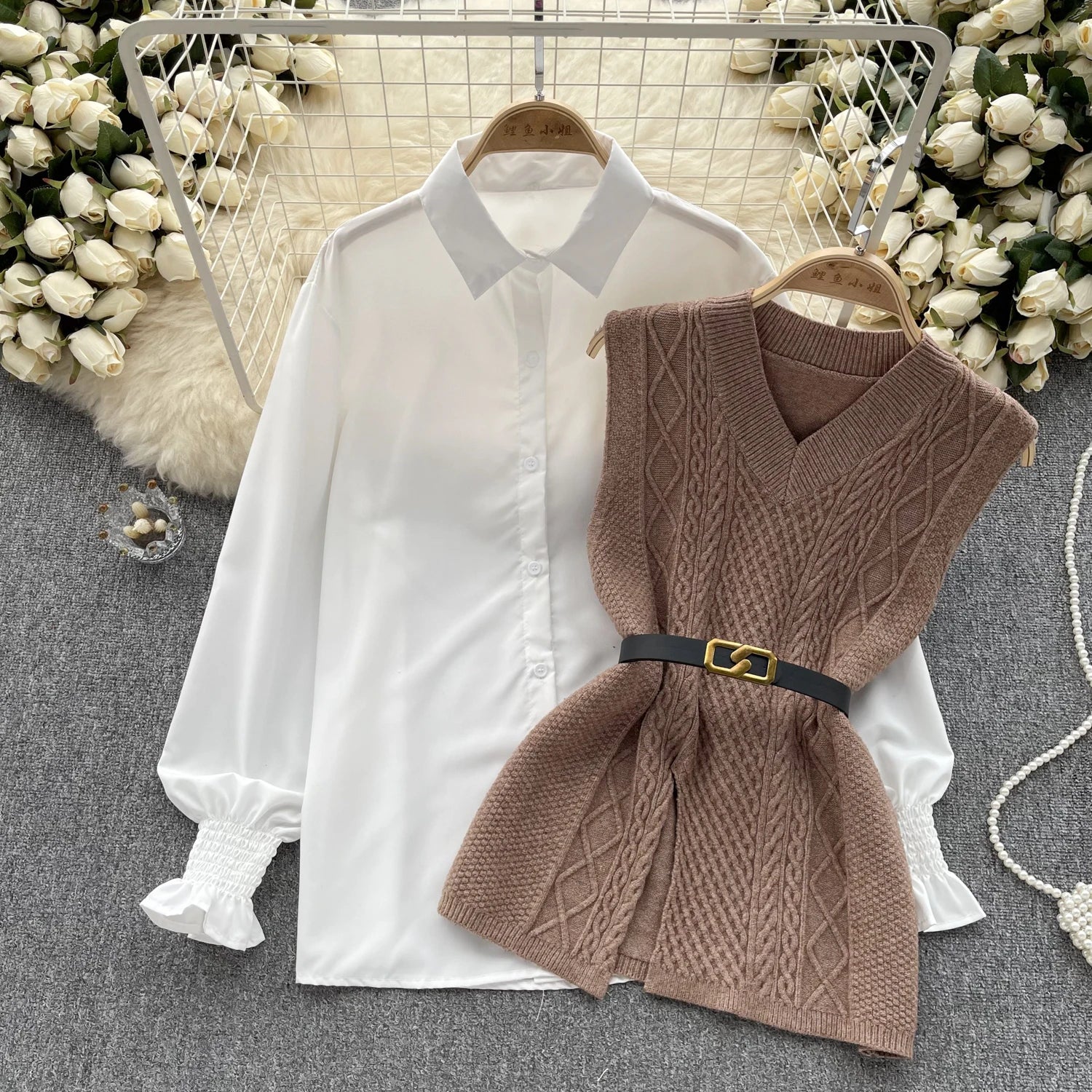Office Lady Knitted Sweater Warm Thick Knit Vest+Single Breasted Lantern Sleeve Blouse 2023 Women Pullover Shirt Suits