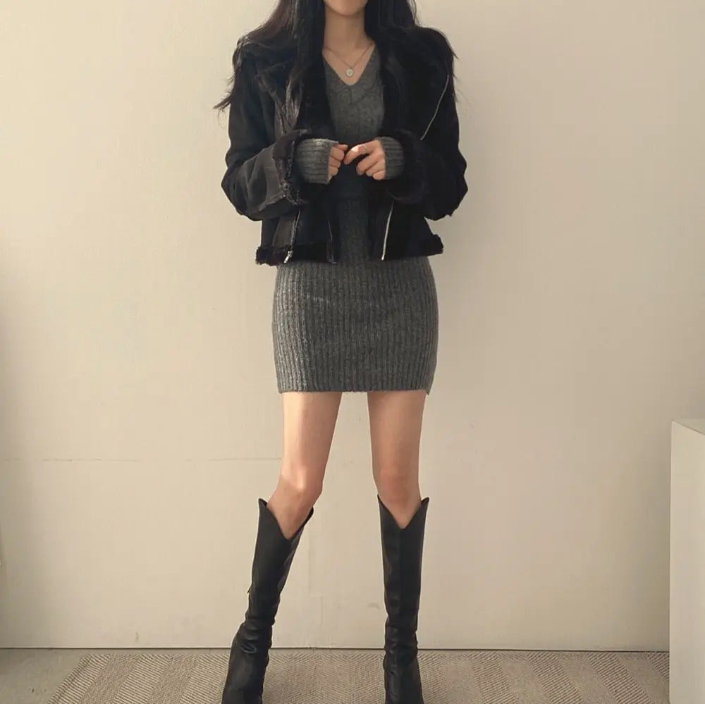 Getadme Women Knit Slim Sexy Bodycon Dress V-Neck Long Sleeve Dress Solid Casual Midi Sweater Dress For Women Autumn Winter