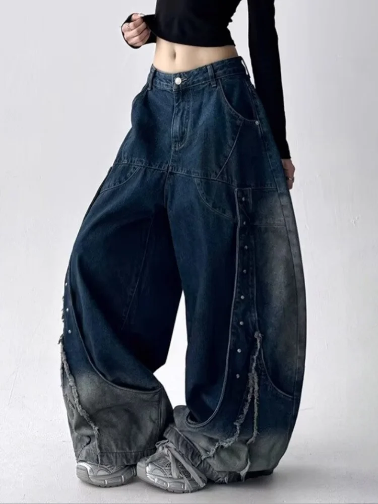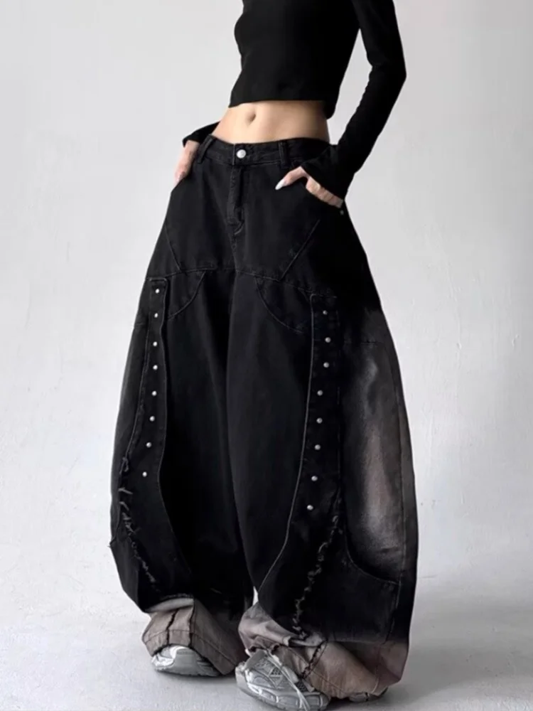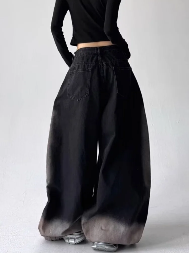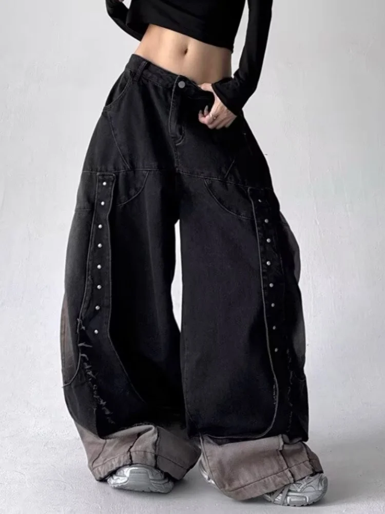 GETADME 2025 American Retro Y2K Style Patchwork Washed Black Baggy Women's Stacked Jeans Pants Woman Clothing Wide Leg Denim Trousers