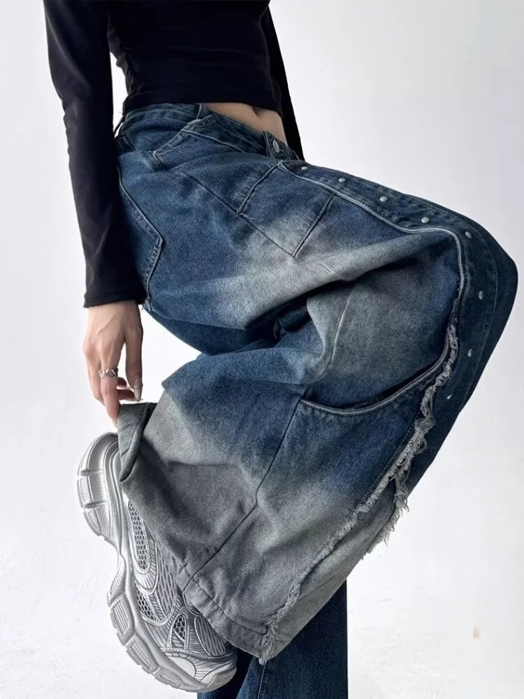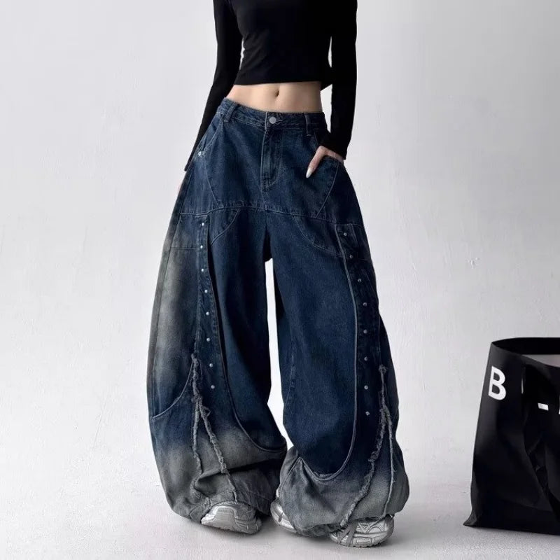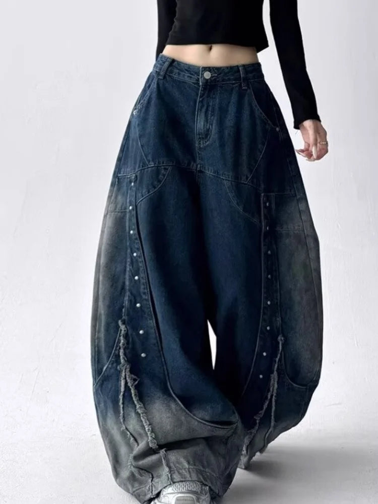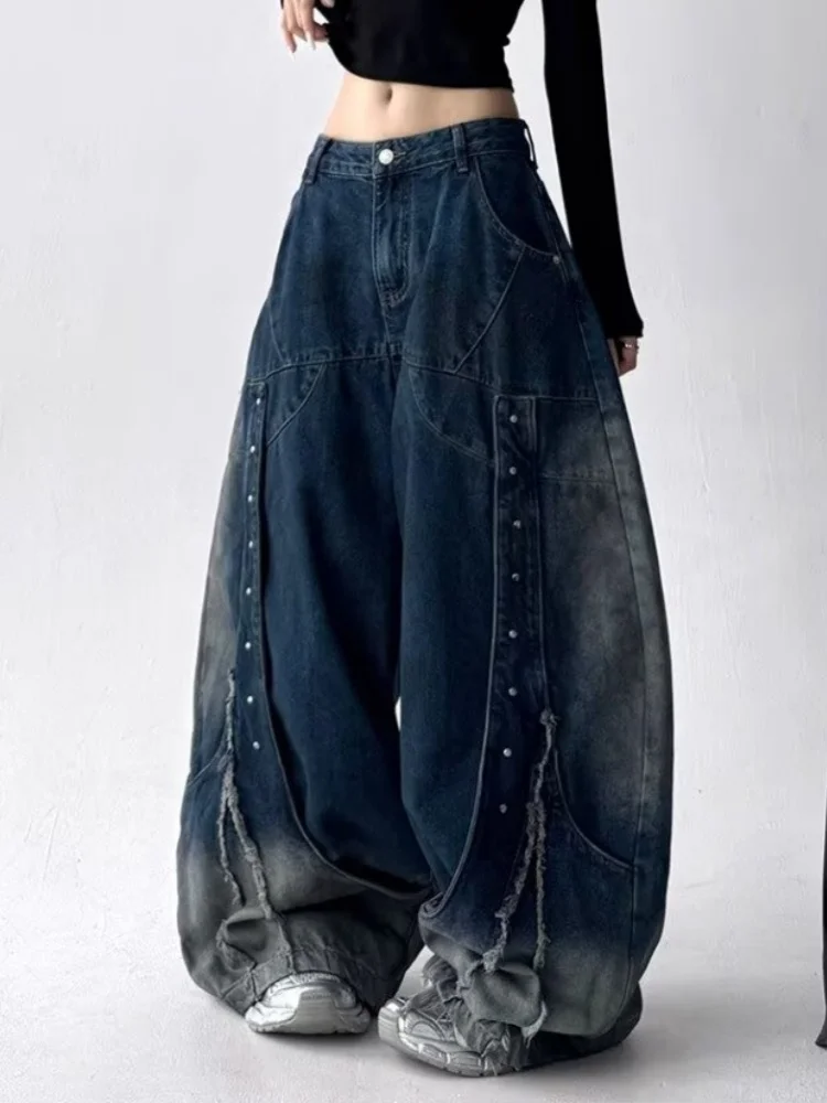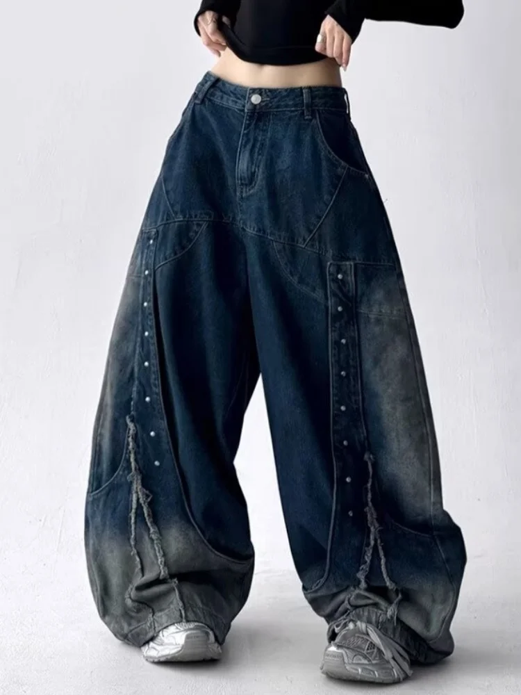GETADME 2025 American Retro Y2K Style Patchwork Washed Black Baggy Women's Stacked Jeans Pants Woman Clothing Wide Leg Denim Trousers