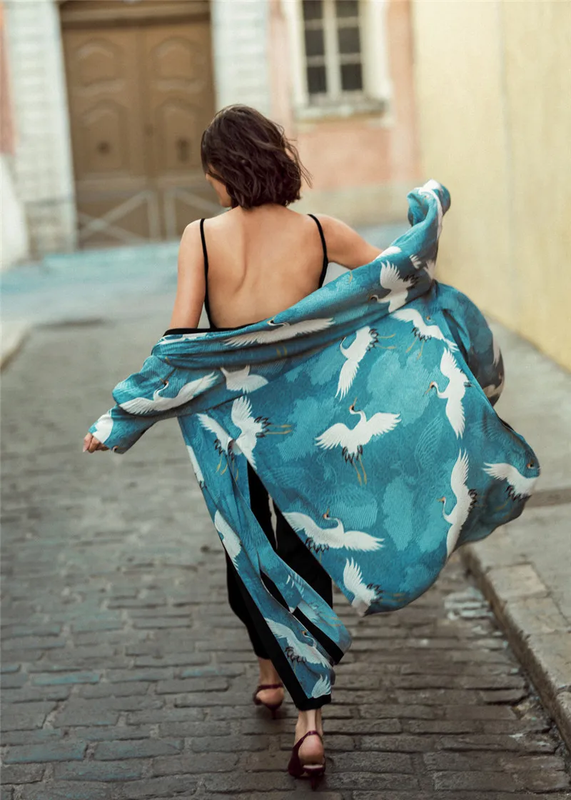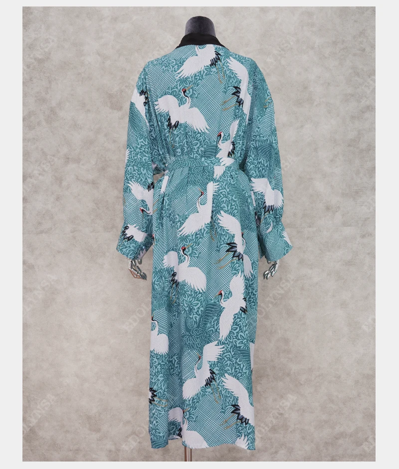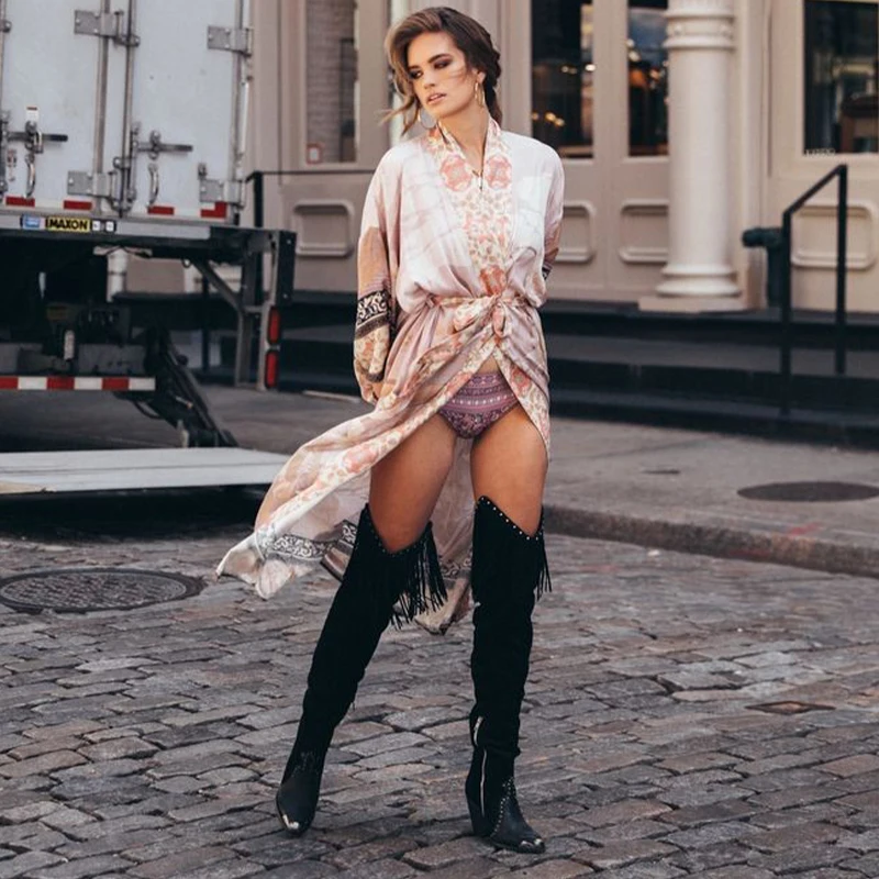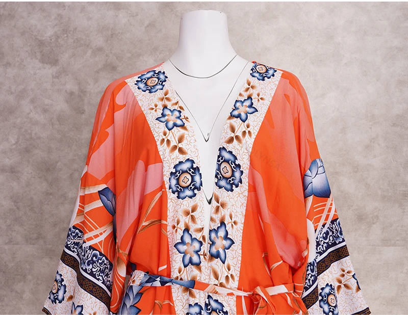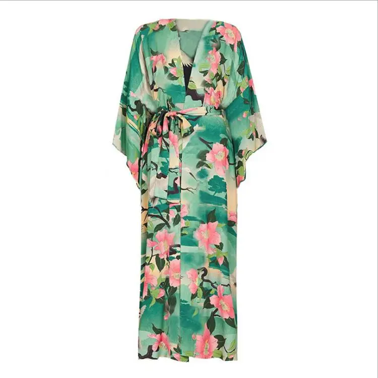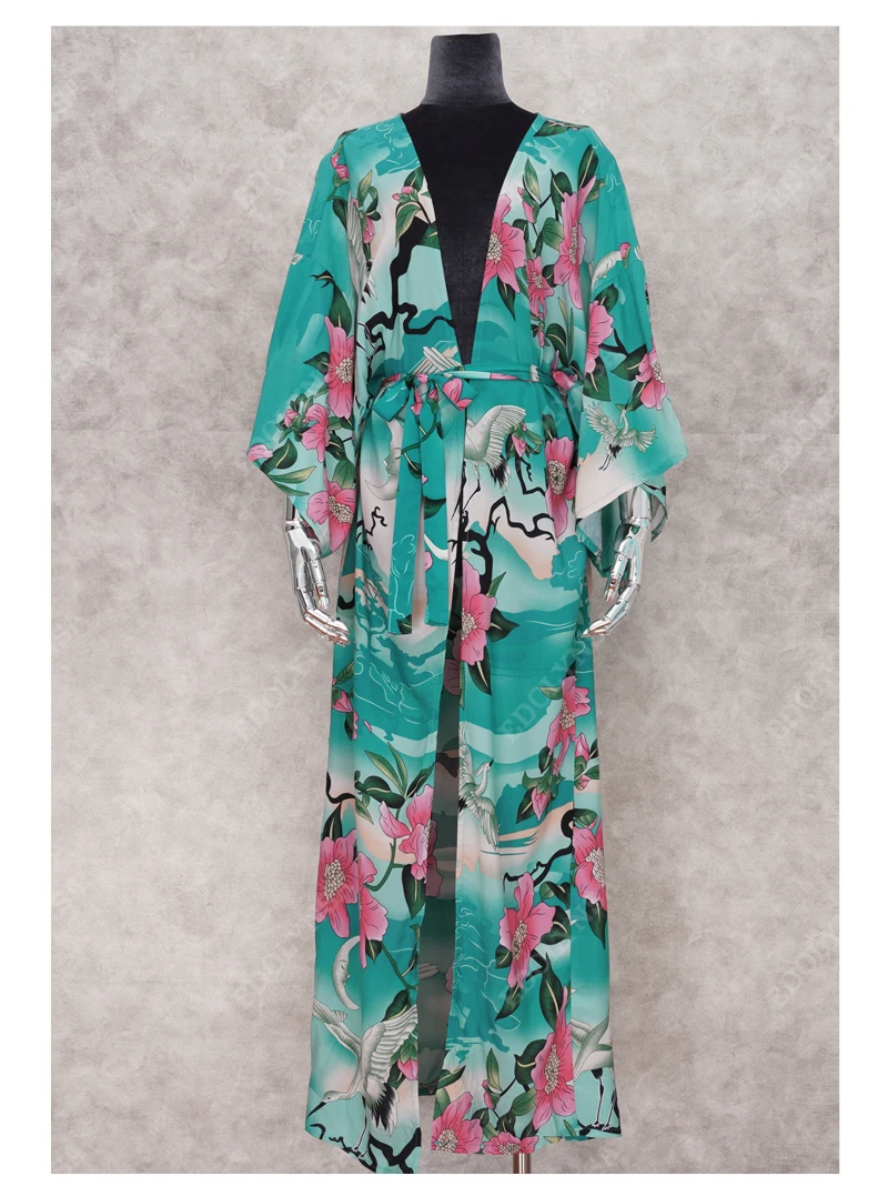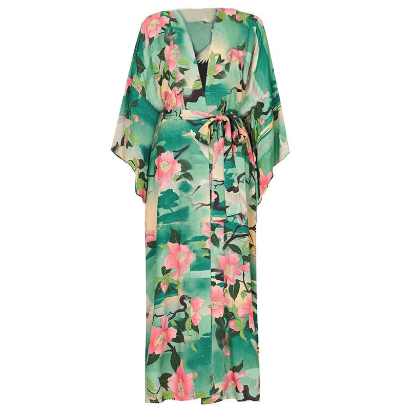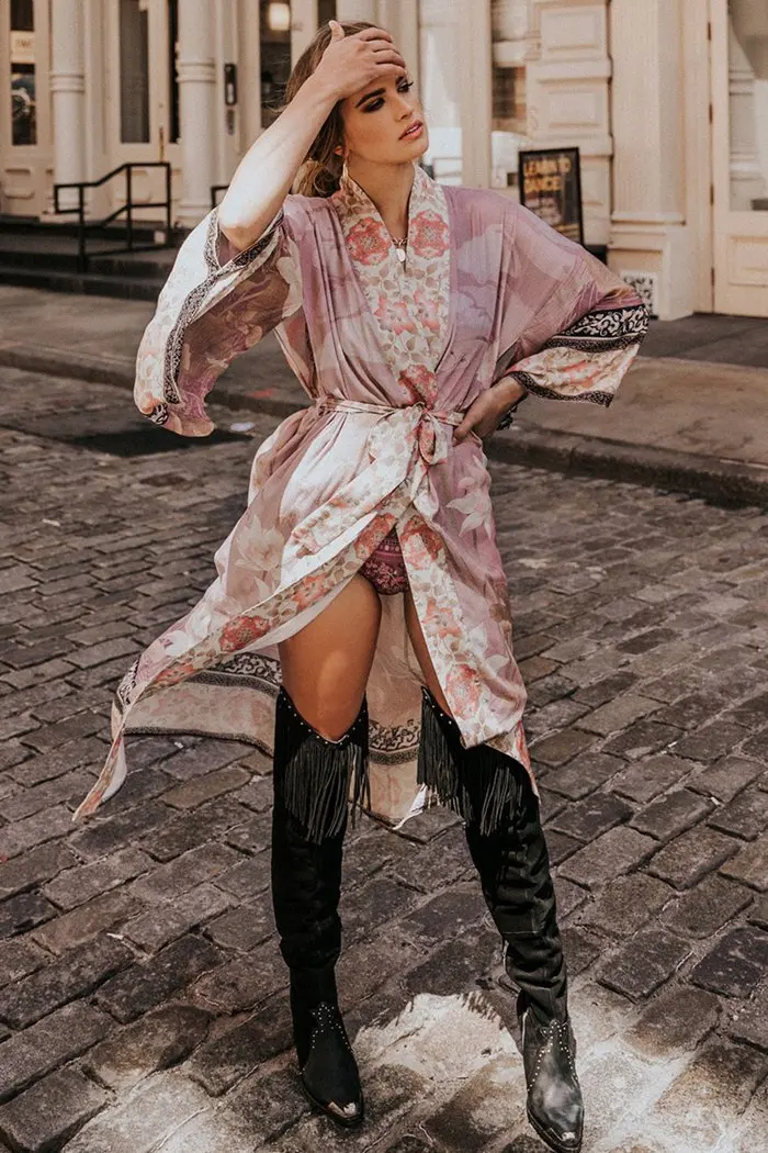 GETADME 2025 Bikini Cover-ups Pink Boho Print Self Belted Front Open Long Kimono Dress Beach Tunic Women Swim Suit Cover Up Q996