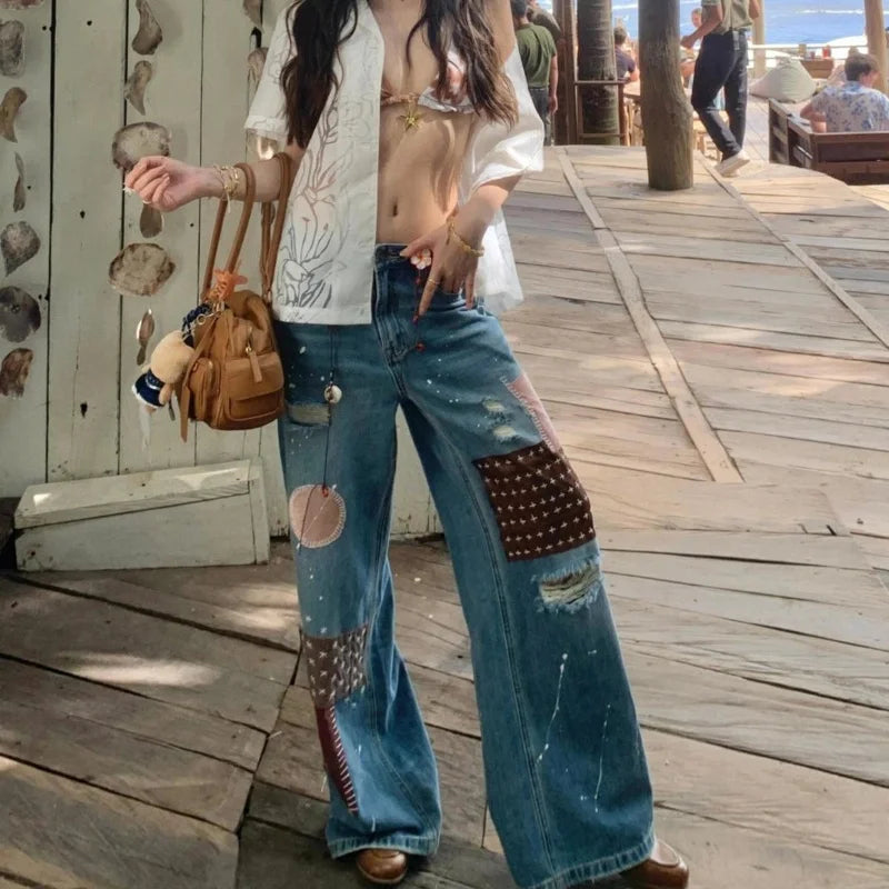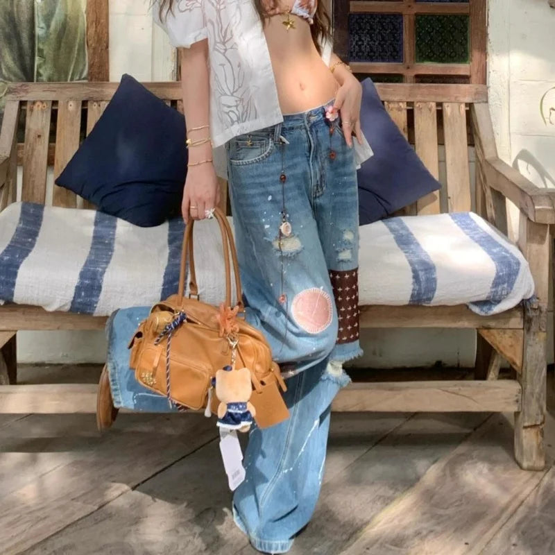 GETADME 2025 Grunge Y2K Streetwear Patchwork Baggy Ripped Stacked Jeans Pants For Women Clothing Wide Leg Punk Style Lady Denim Trousers