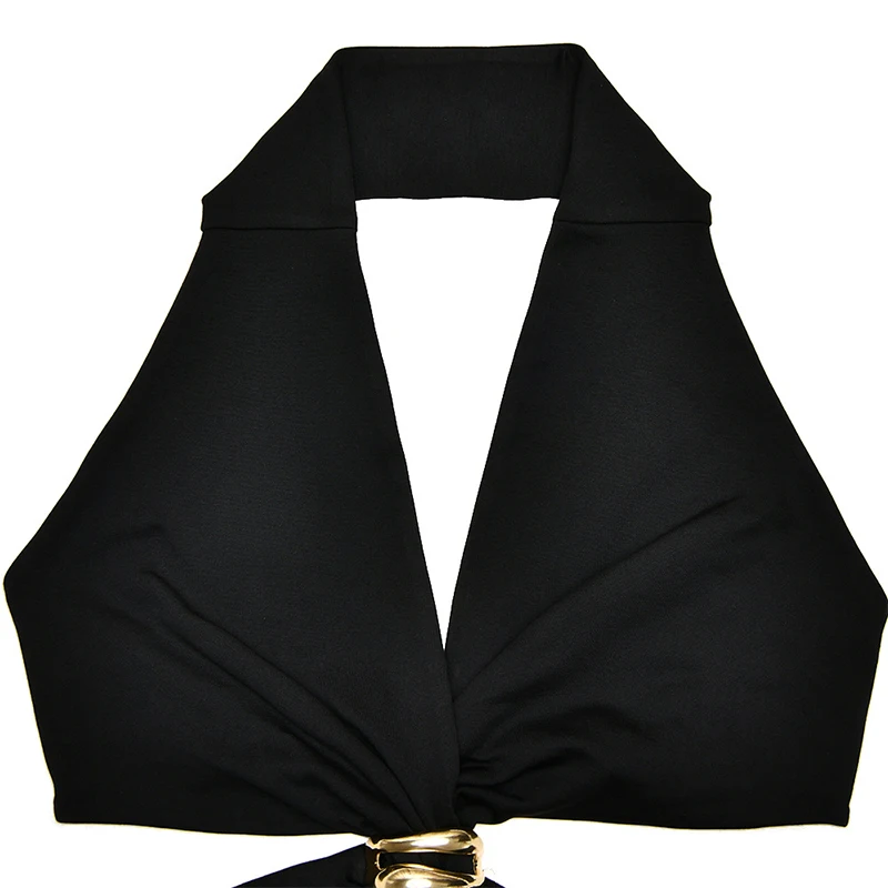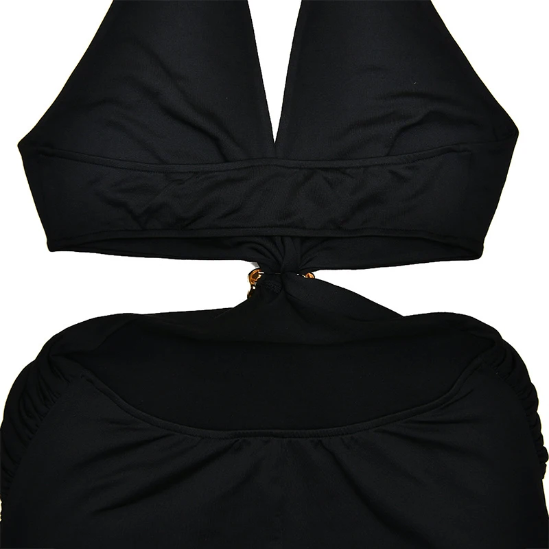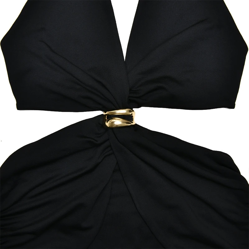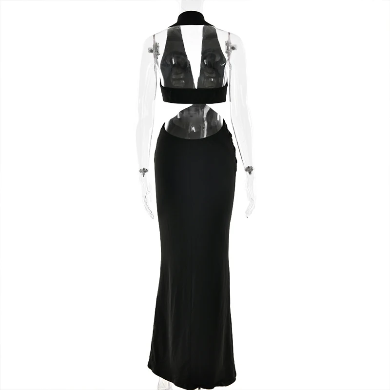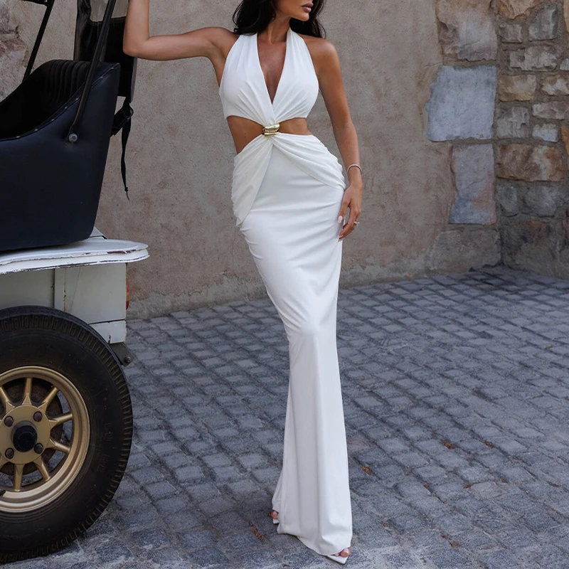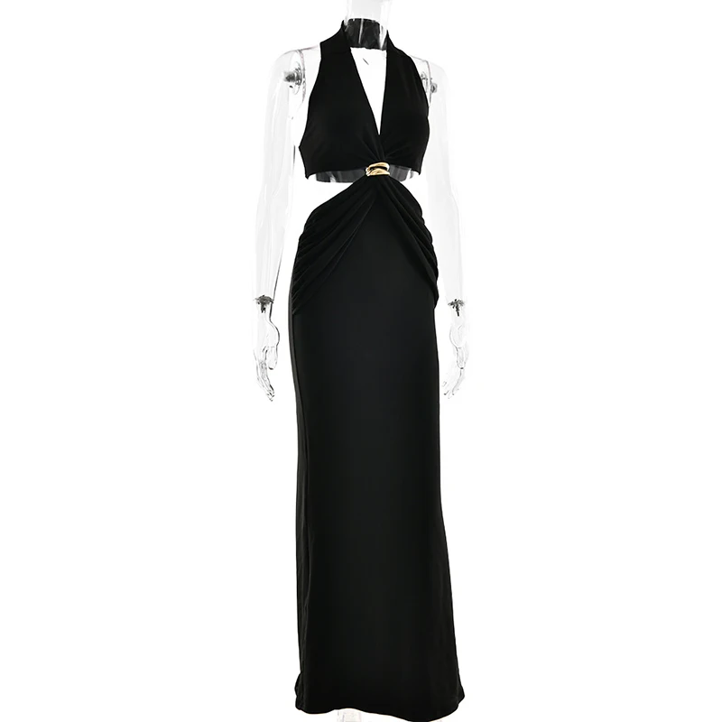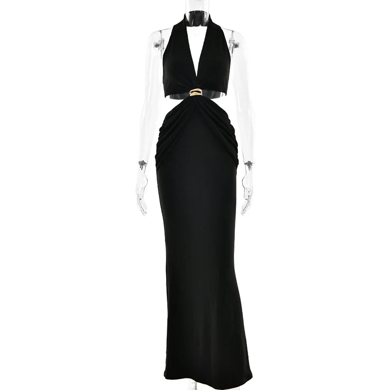 GETADME 2025 Ladies Elegant Sexy Halter Hollow Out Deep V Neck Solid Ruched Slimming Evening Party Maxi Backless Dresses Clubwear