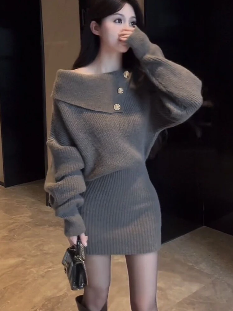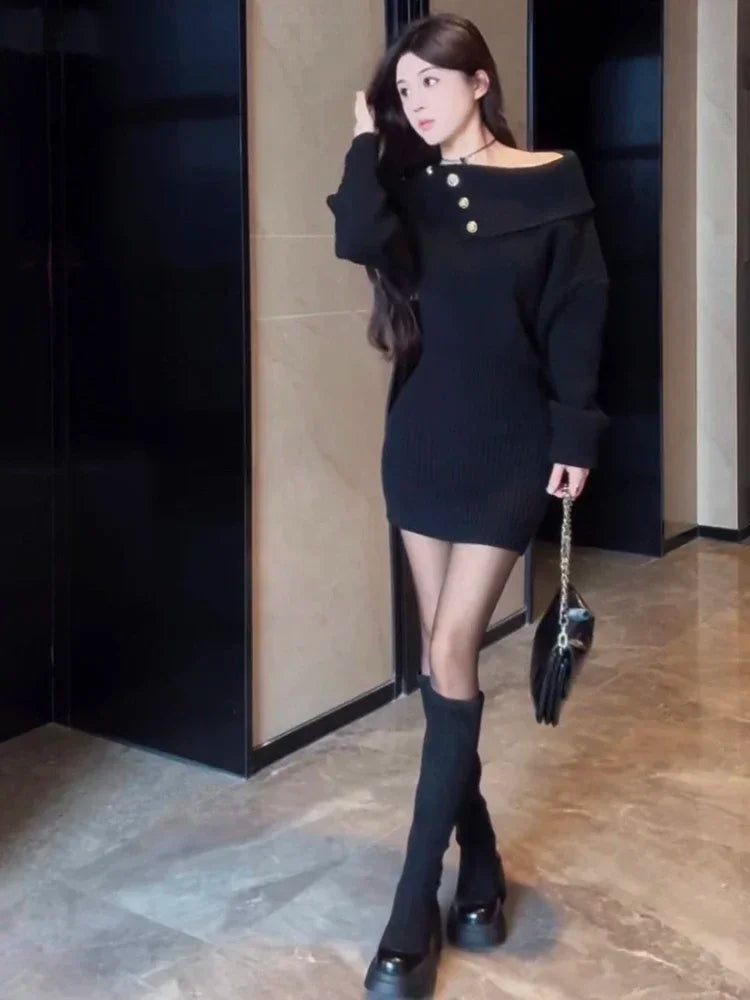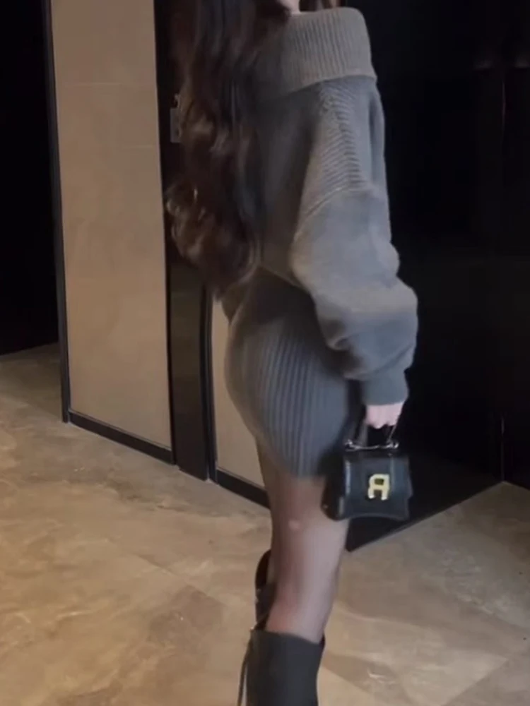 GETADME 2025 New Autumn/Winter Women's Knitted Dress Black Grey Mini Fashion Off Shoulder Bag Hip Sweater Dress A118