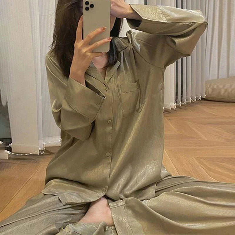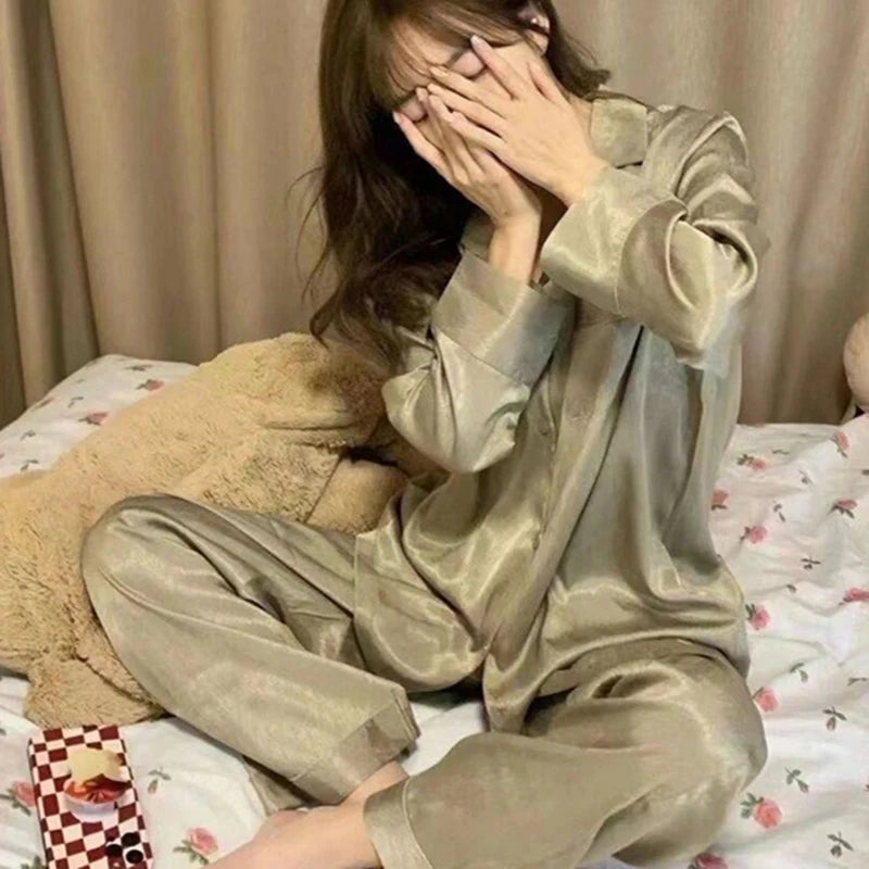 GETADME 2025 New Spring and Autumn Ice Silk Pajamas Women Long sleeve Thin Silk Summer Women Set Home wear