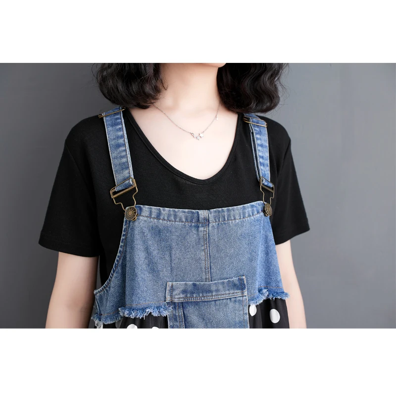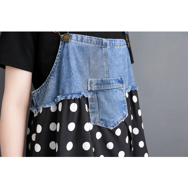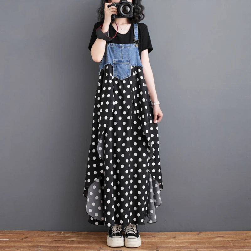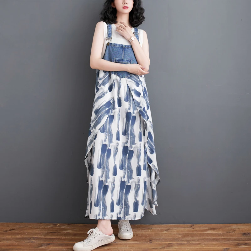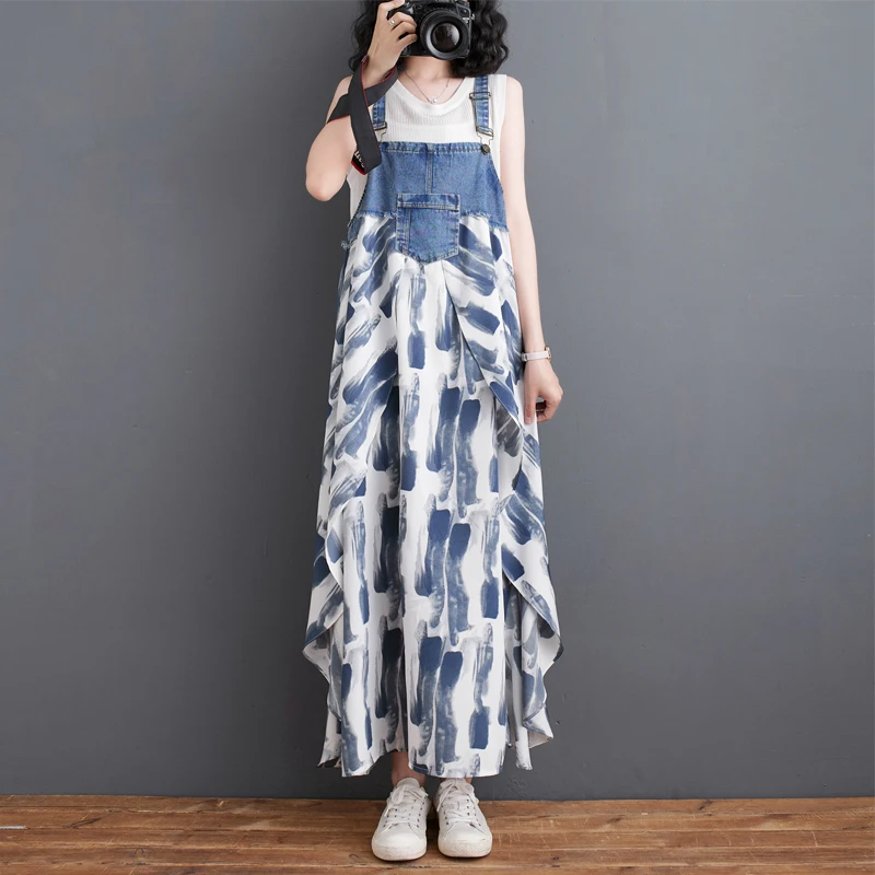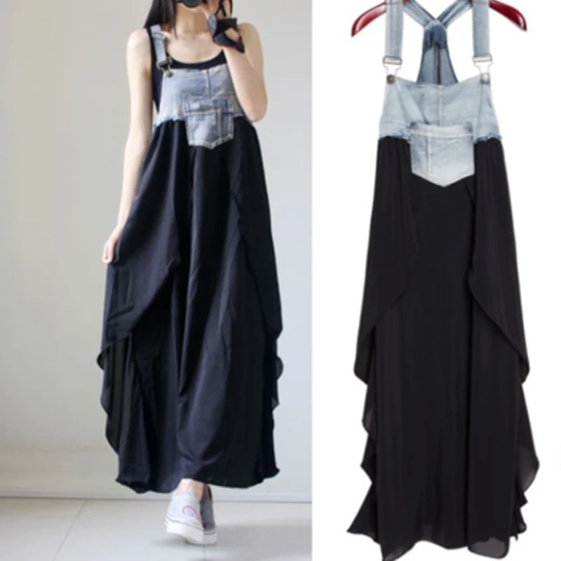 GETADME 2025 Summer New Elegant Women's Dress Loose Denim Patchwork Chiffon Overalls Sexy Suspender Dress Spaghetti Strap Robe KE903