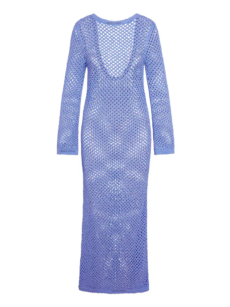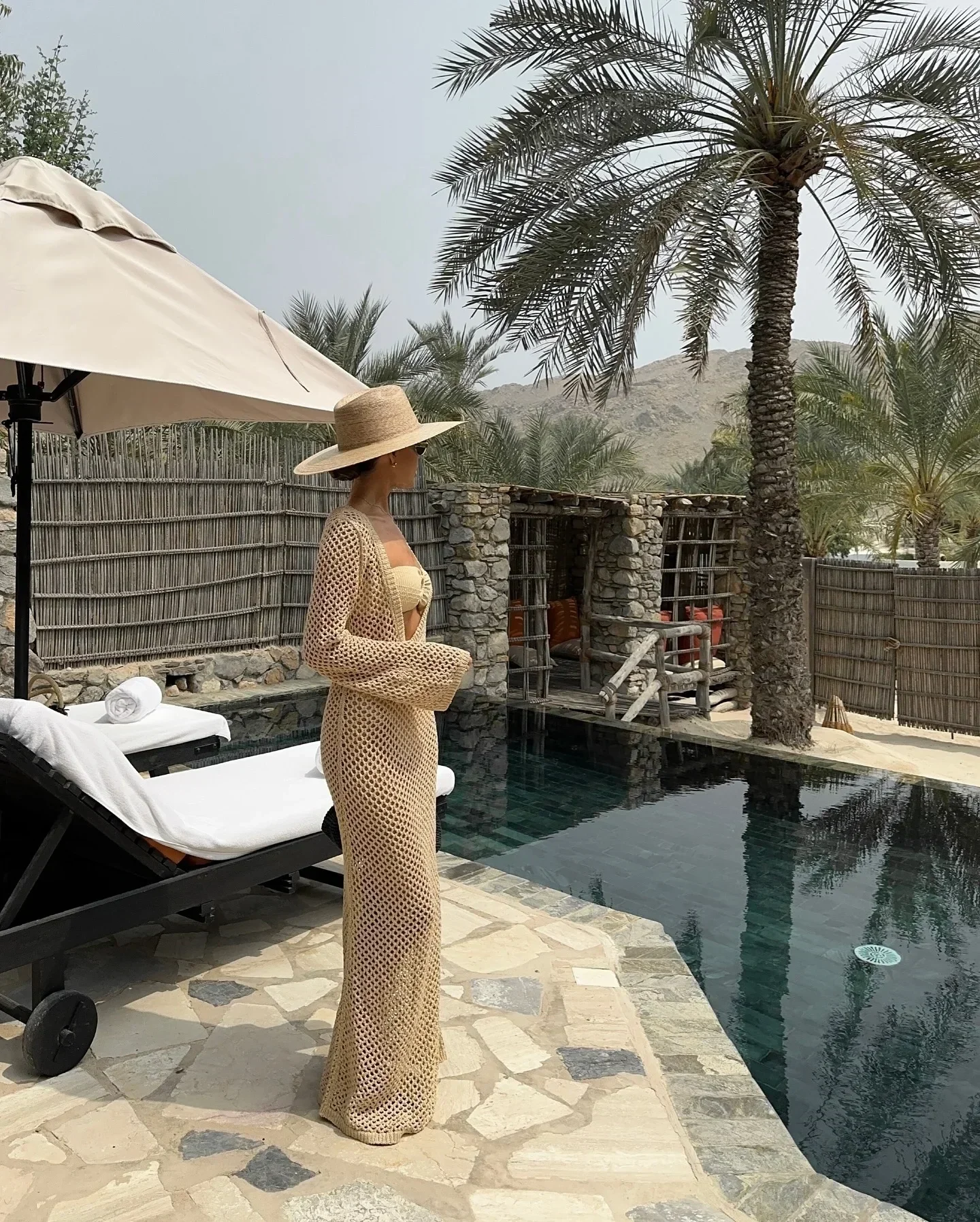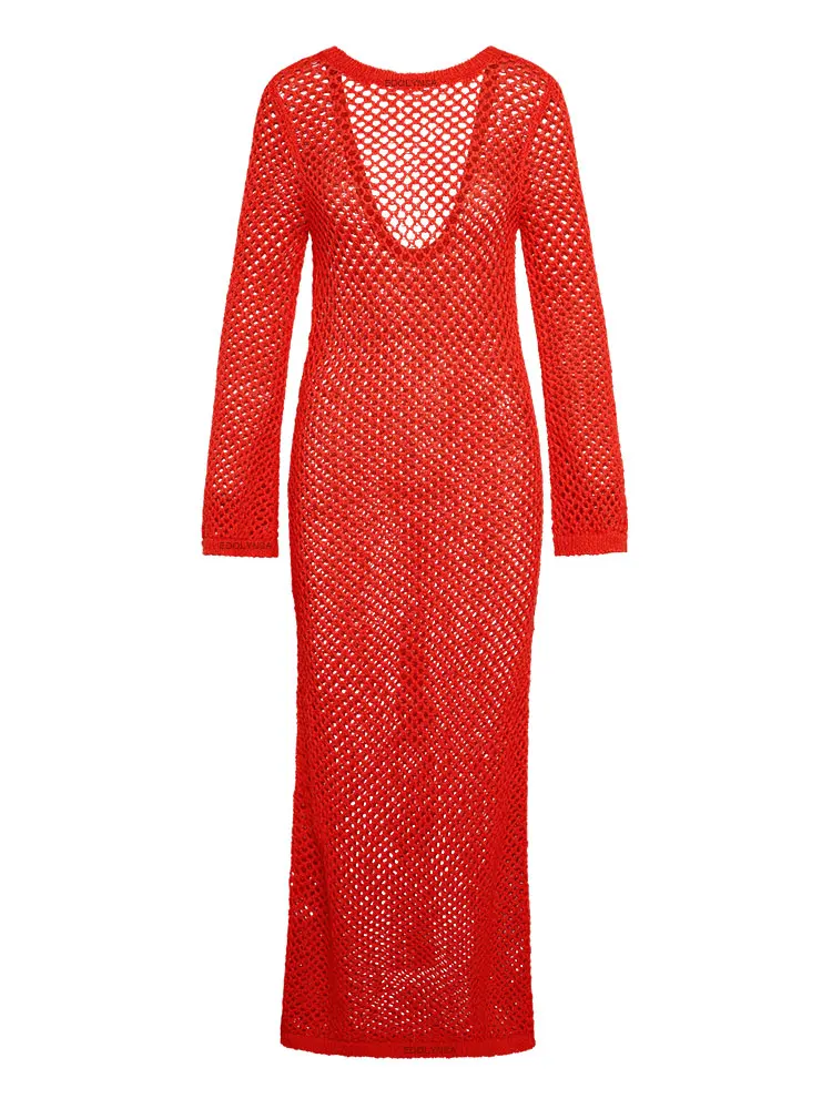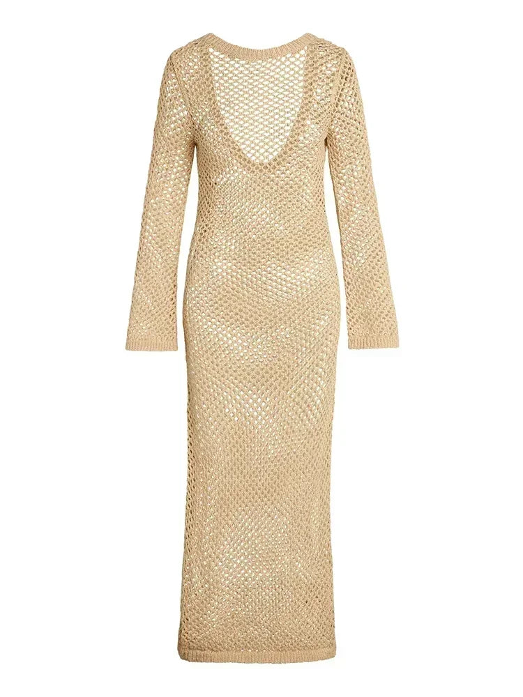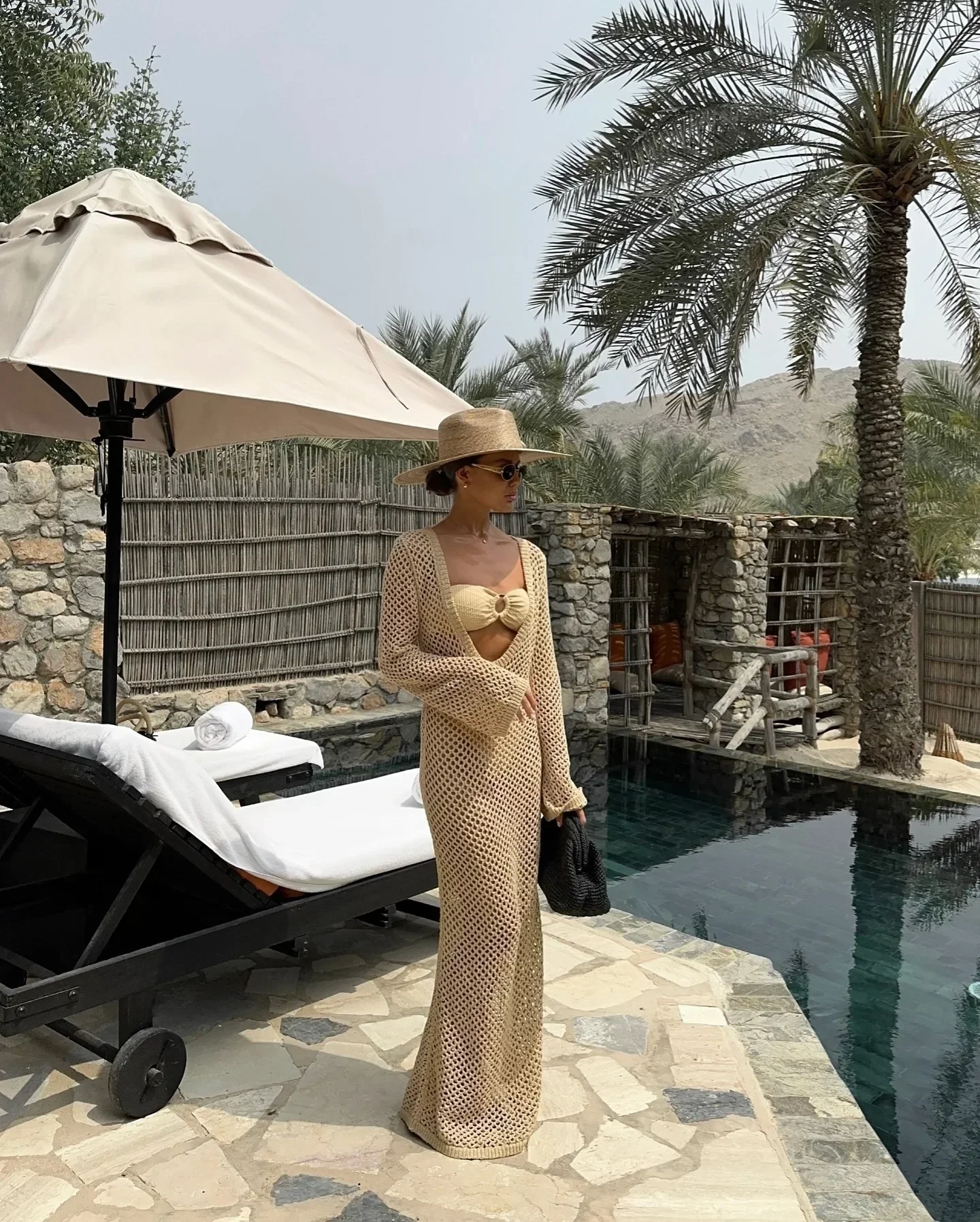 GETADME 2025 Summer Sexy U-neck Bell Sleeve Knit Maxi Dress Women Swimwear Feminine Bikinis Cover-ups Holiday Crochet Beach Dresses K21