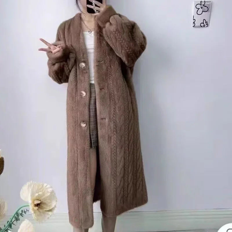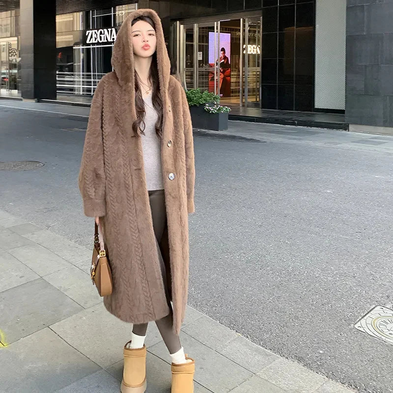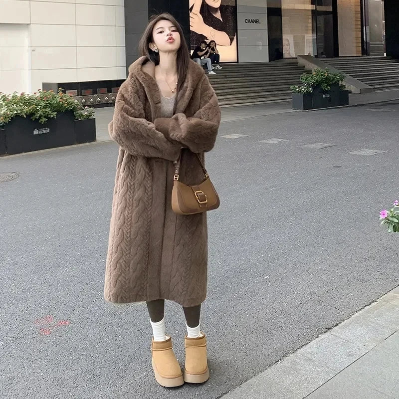 GETADME 2025 Winter New Thick Women's Long Imitation Mink Plush Cardigan With Integrated Fur Eco-Friendly Hooded Fur Coat Solid Color