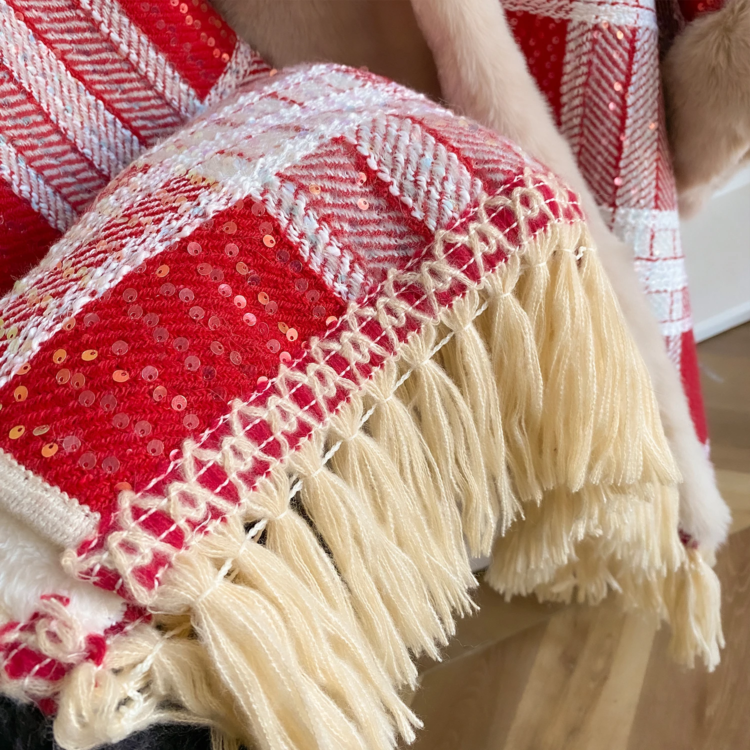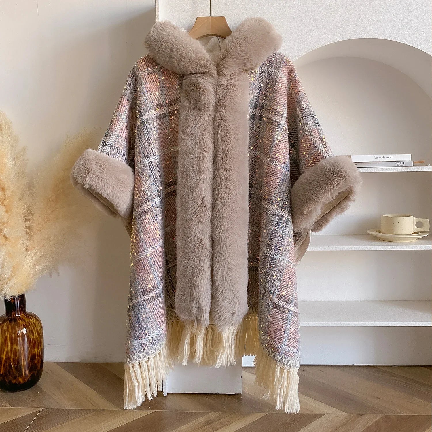 GETADME 2025 Winter Thicken Fleece Collar Cape Coat With Hat Elegant Beautiful Faux Fur Long Tassels Women Party Dress Cloak Warm Wraps