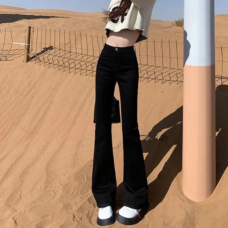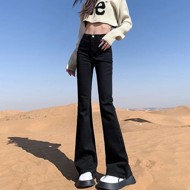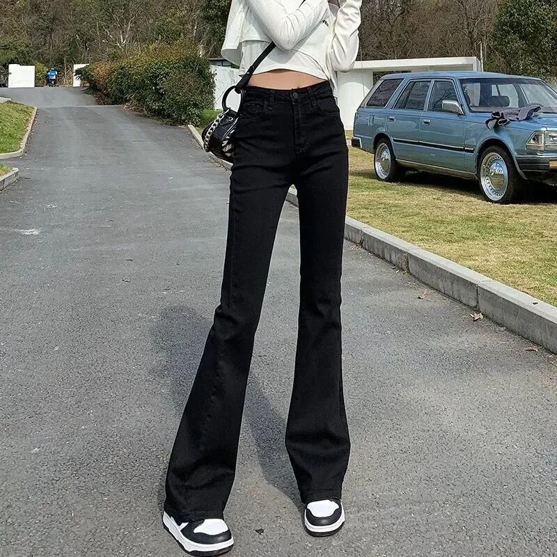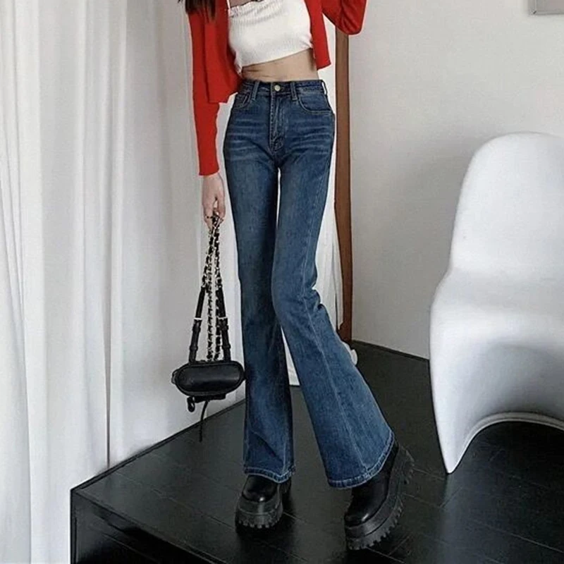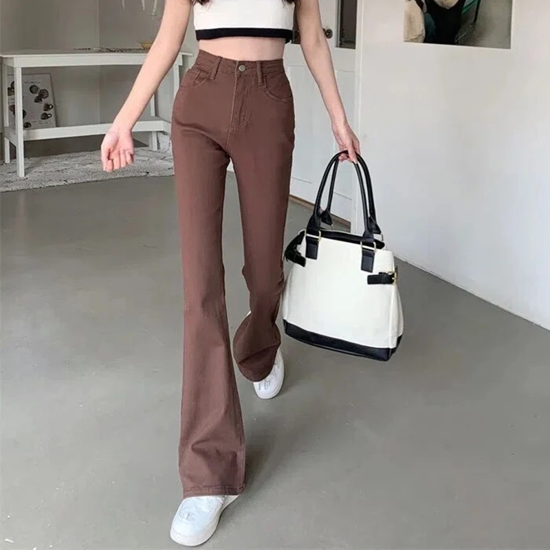 GETADME 2025 Woman High Waist Vintage Flare Jeans Female Elastic Bell Bottom Pants Girls Black Brown Deep Blue Light Blue Denim Trousers