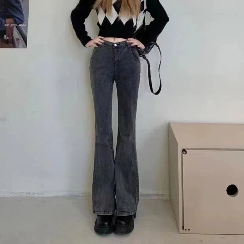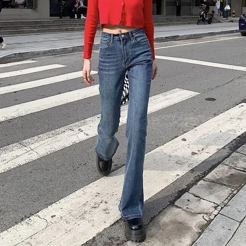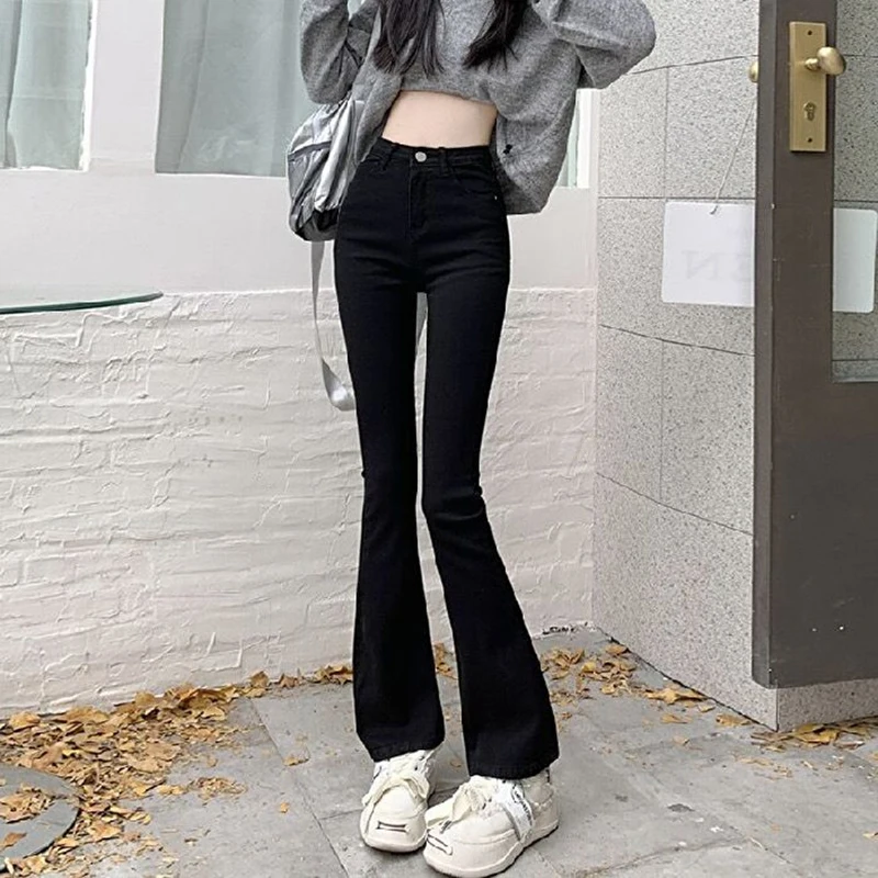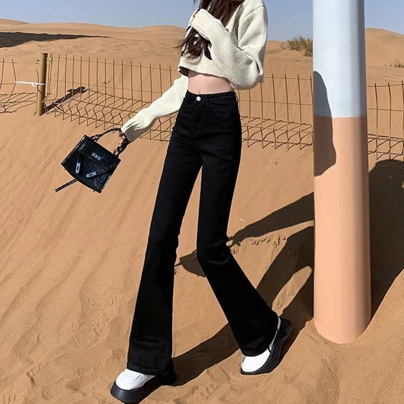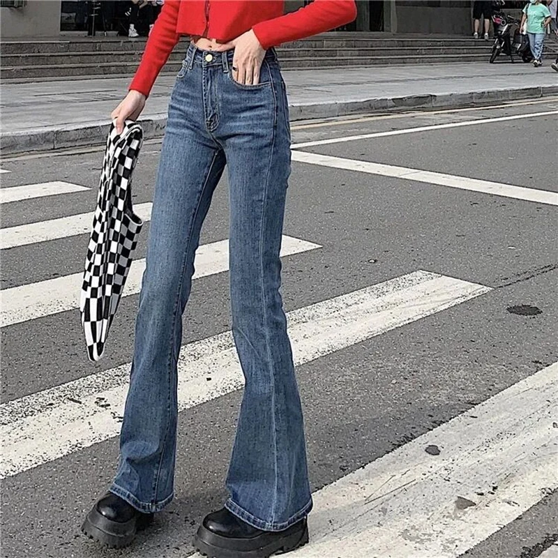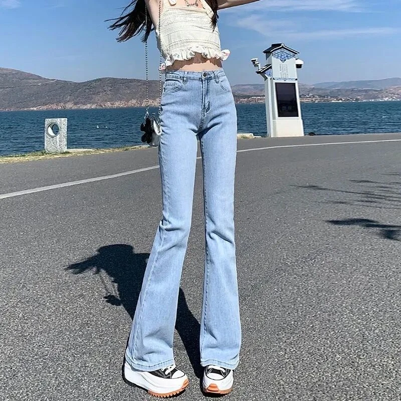 GETADME 2025 Woman High Waist Vintage Flare Jeans Female Elastic Bell Bottom Pants Girls Black Brown Deep Blue Light Blue Denim Trousers