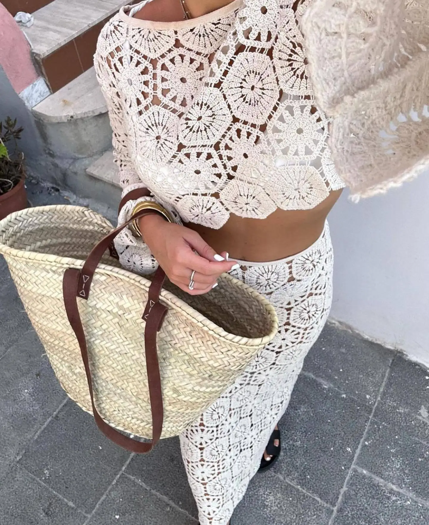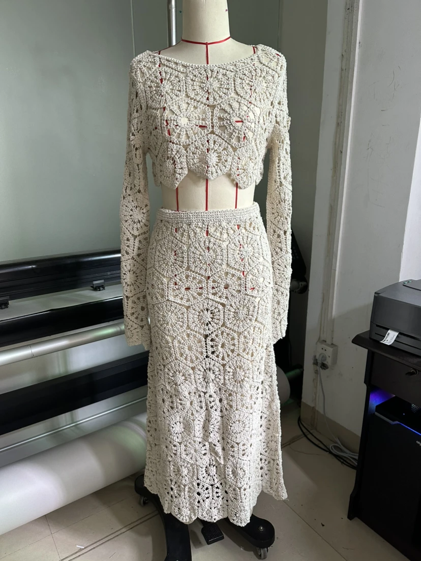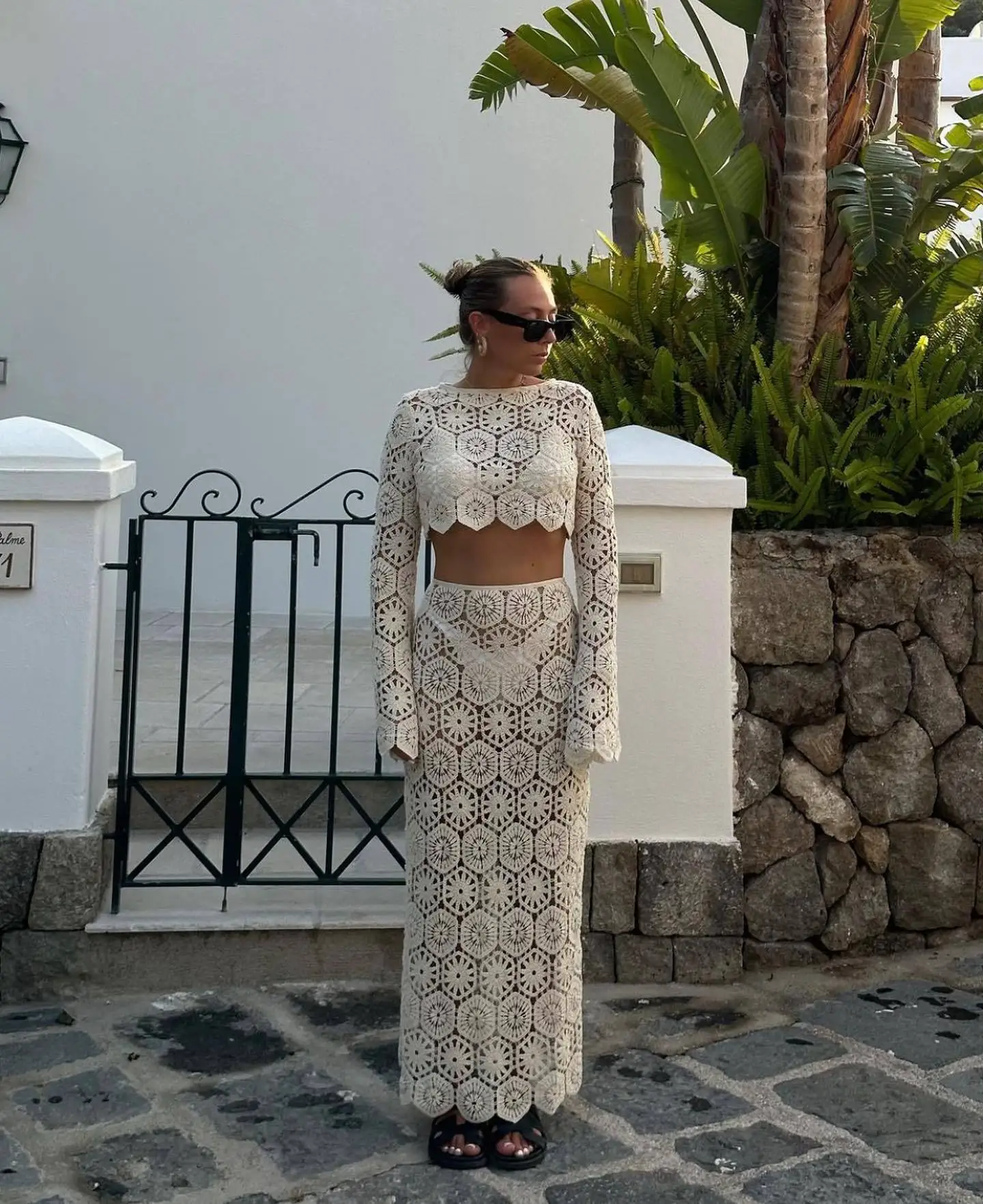 GETADME Black Beach Skirt Sets Women Sexy Hollow Out Slim Holiday Two Piece Set Autumn Long Sleeve Crop Top and Maxi Skirt Outfits 2025