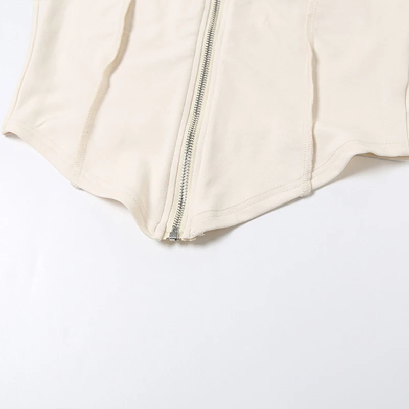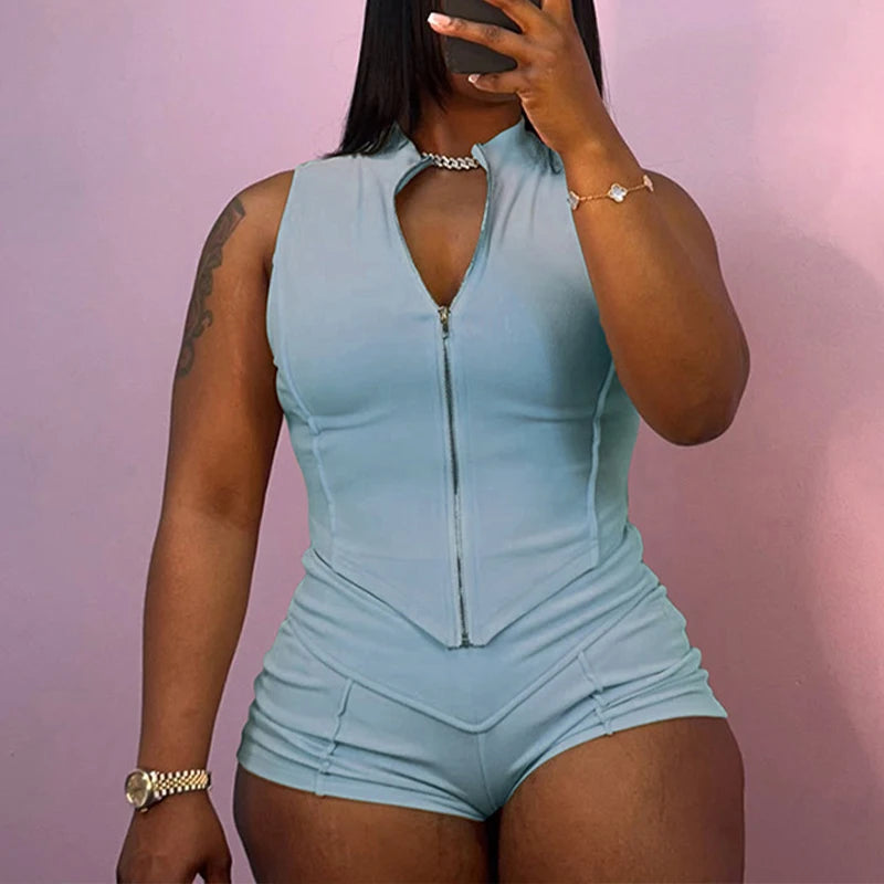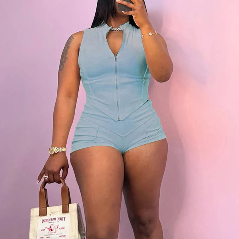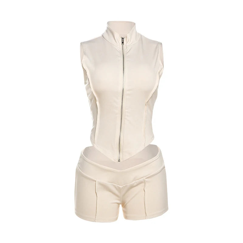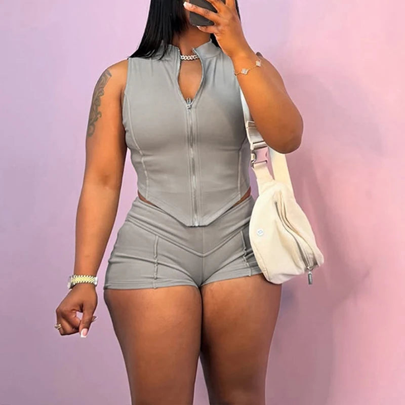 GETADME Casual Women Solid Sets Stand Collar Sleeveless Zip Up T-shirt and Elastic Low Waist Fitness Shorts Workout Outfits 2025