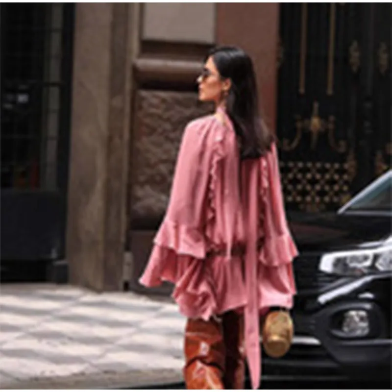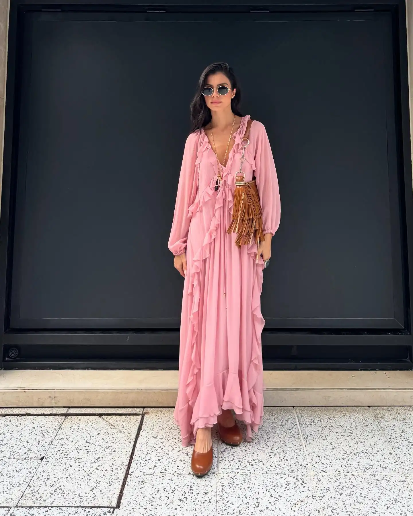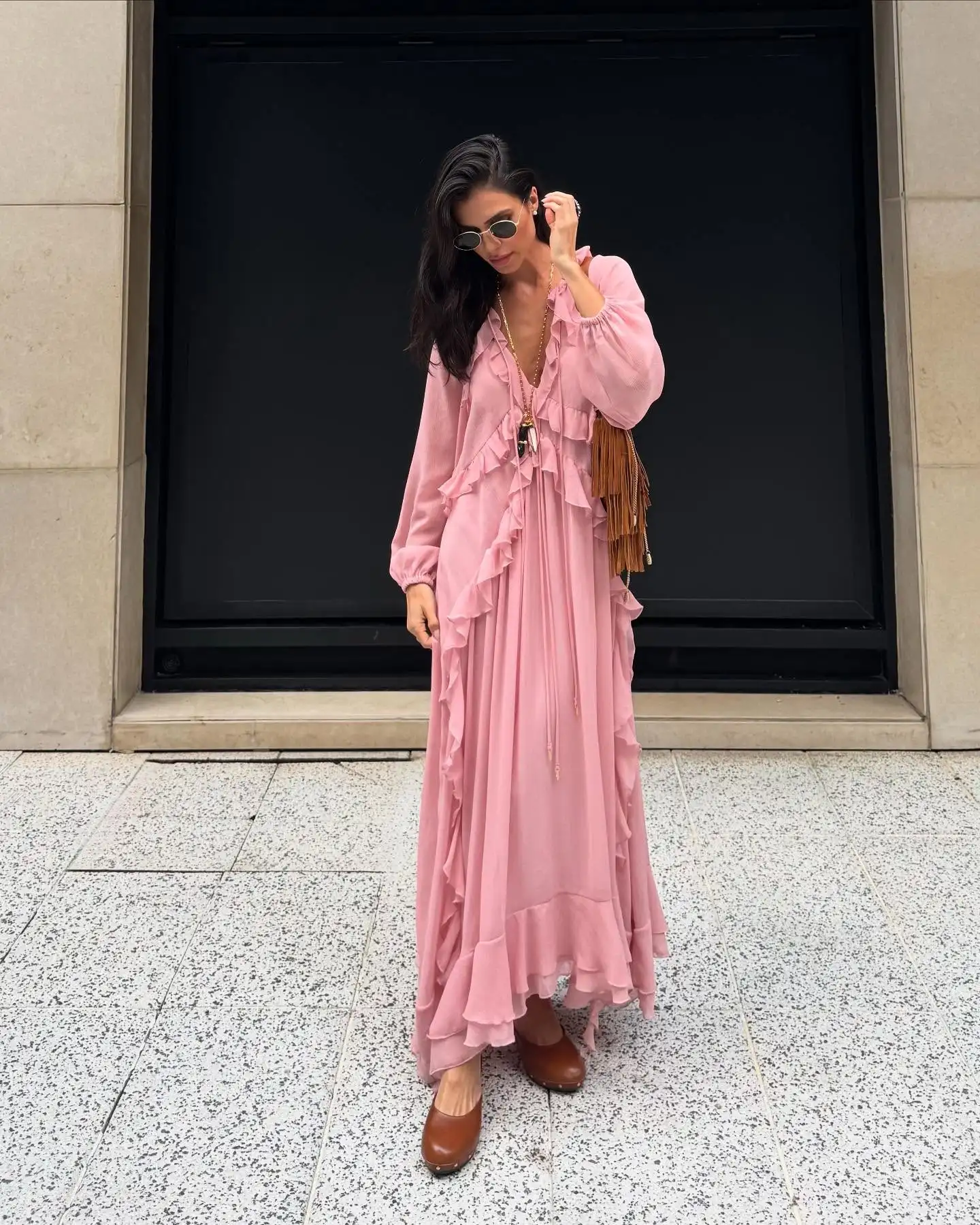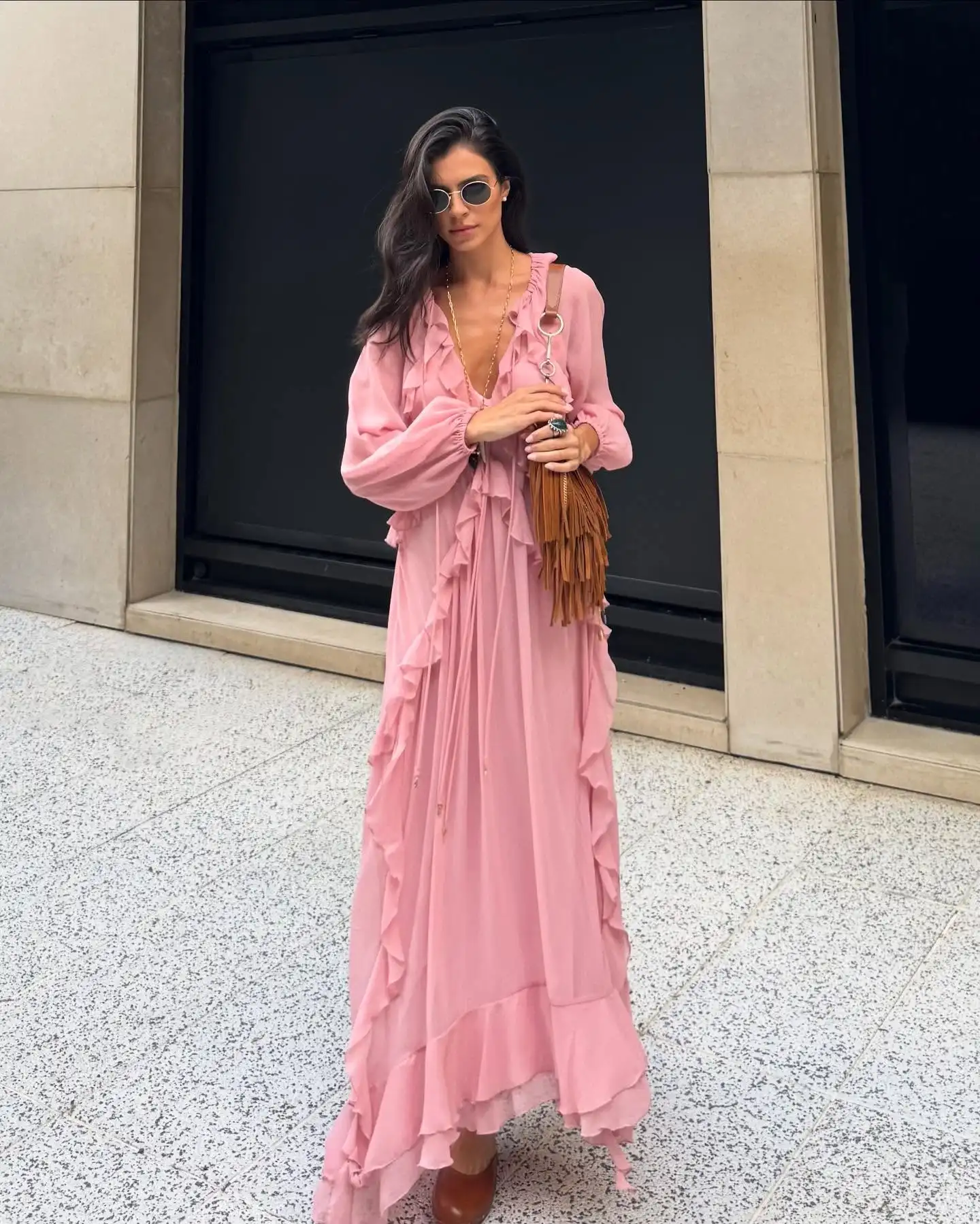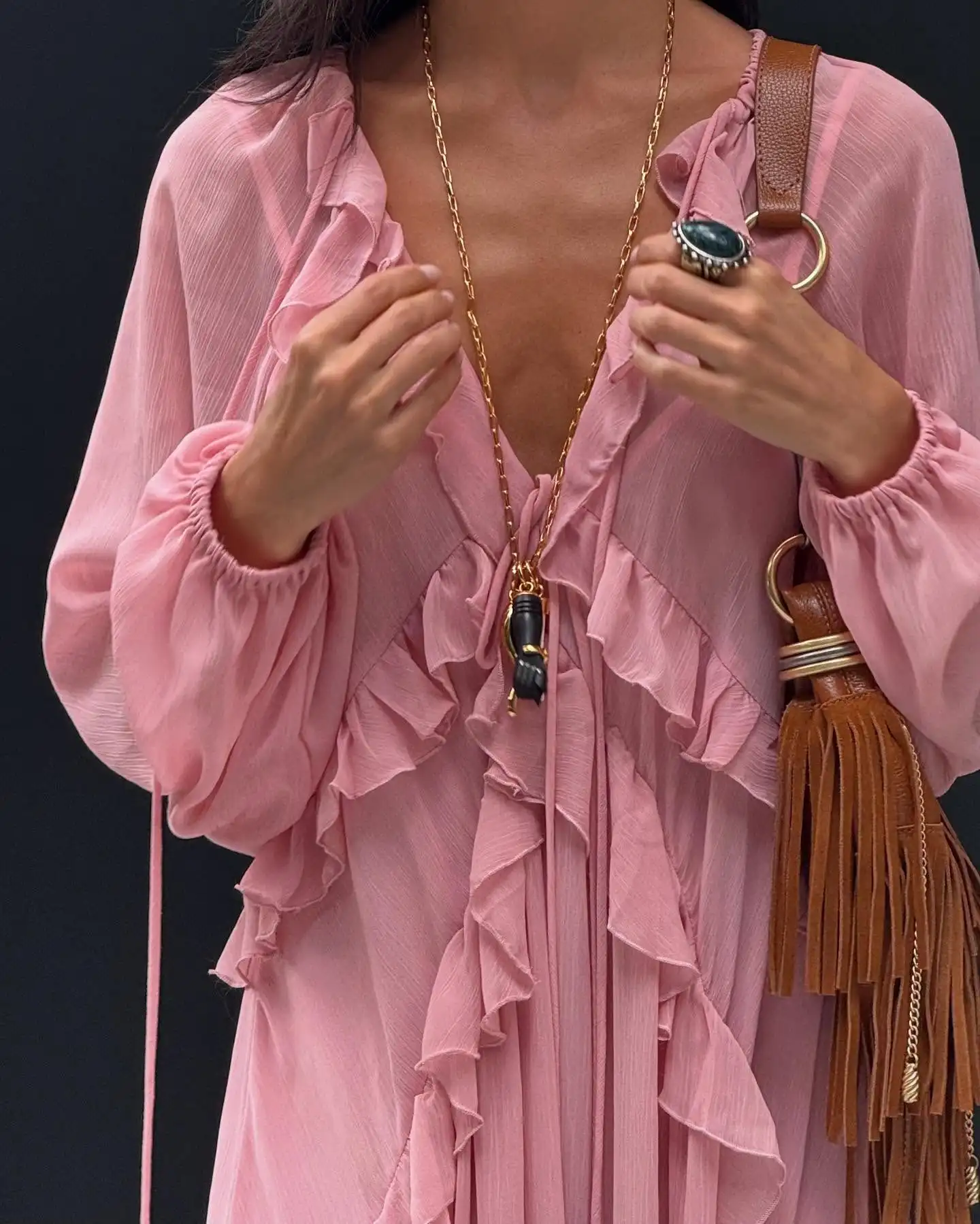 GETADME Elegant Solid Multiple Flounces Lace Up Dresses Chic Loose V Neck Full Sleeve Robes New Lady Summer Commute Vacation Gown 2025