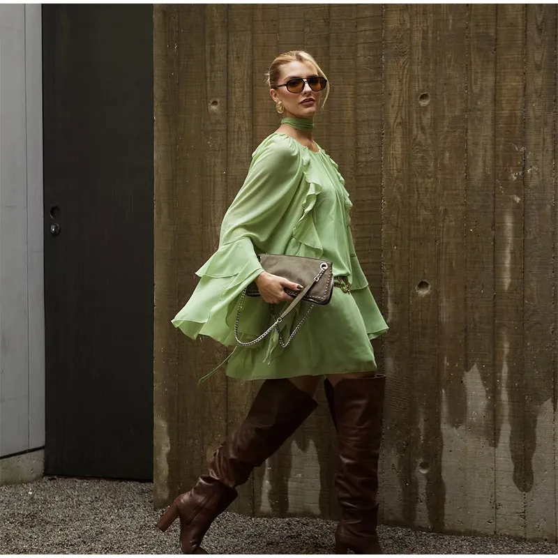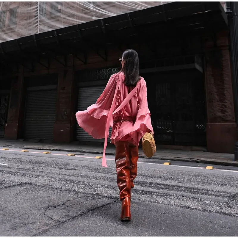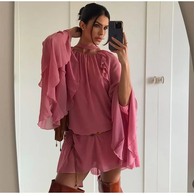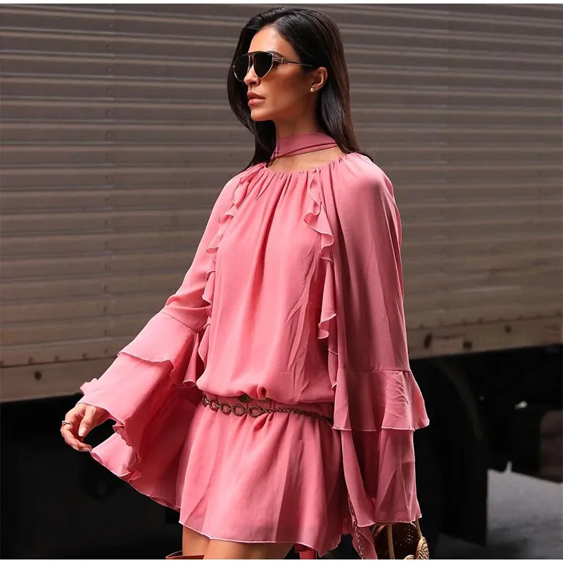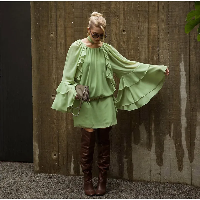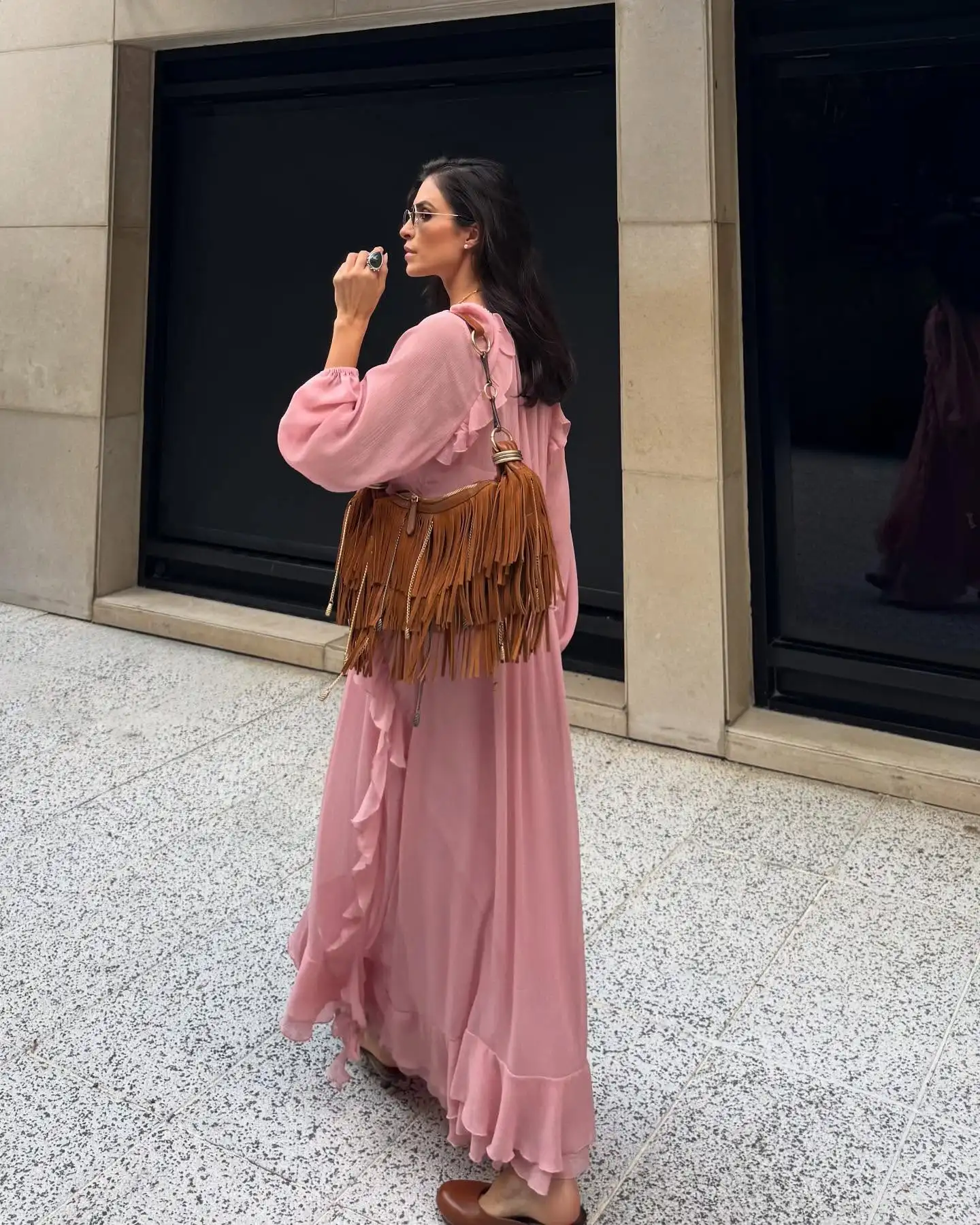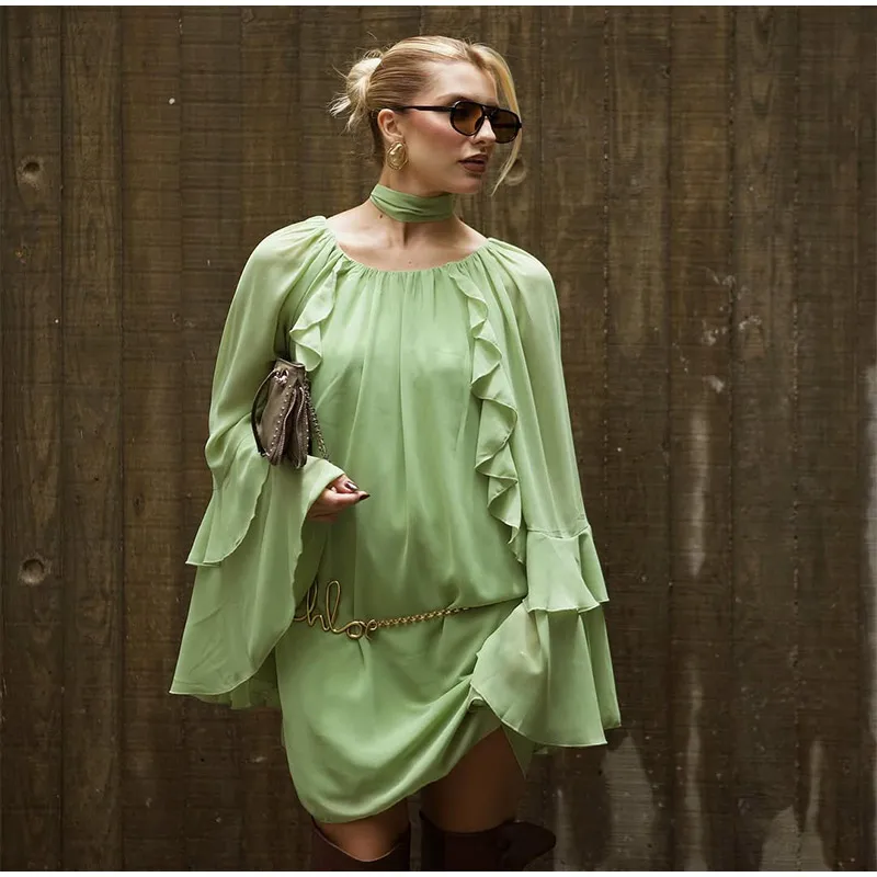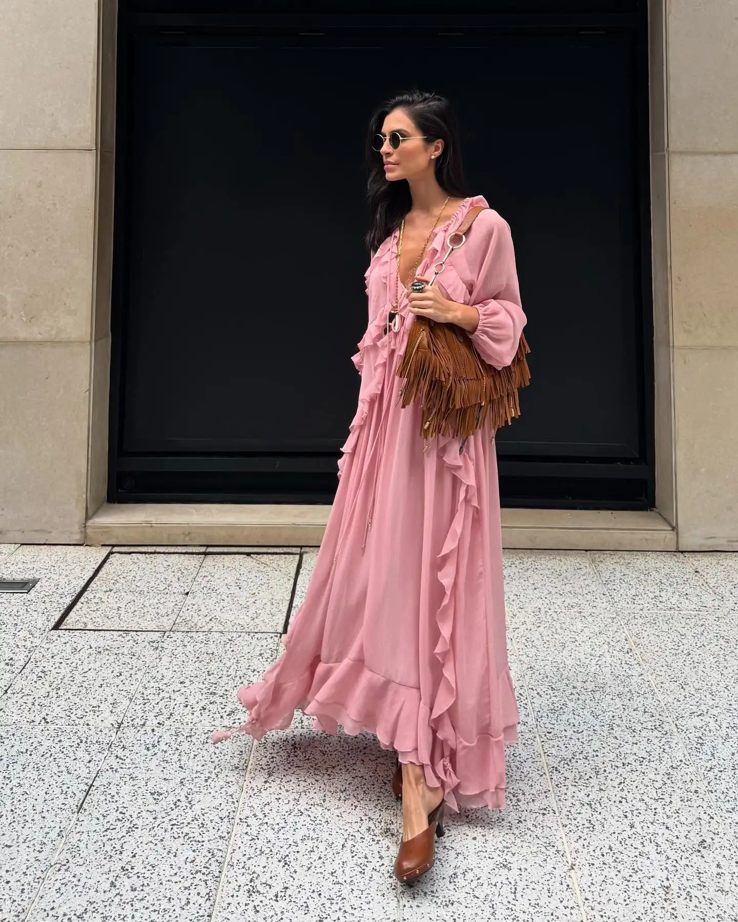 GETADME Elegant Solid Multiple Flounces Lace Up Dresses Chic Loose V Neck Full Sleeve Robes New Lady Summer Commute Vacation Gown 2025