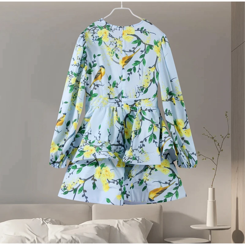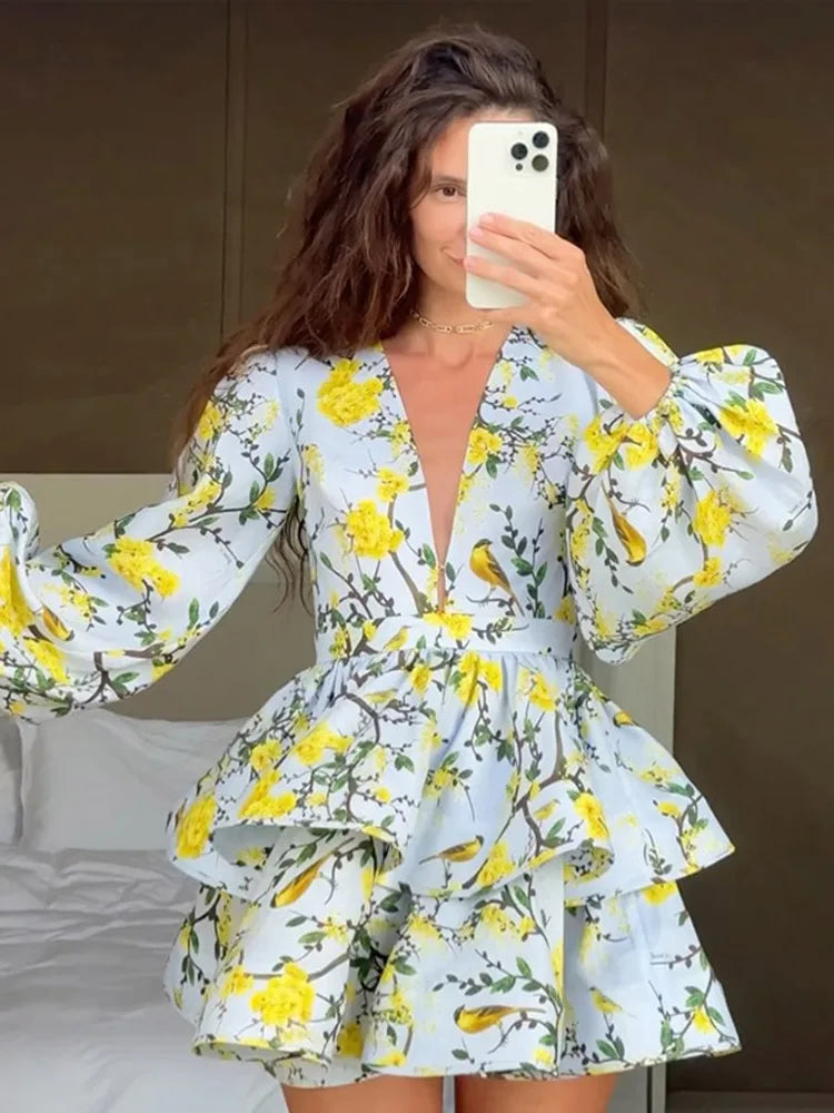 GETADME Fashion Print Ruffles Dress For Women V-neck Flare Sleeve Ball Gown Zipper Mini Dresses 2025 Summer Lady Elegant Party Vestidos