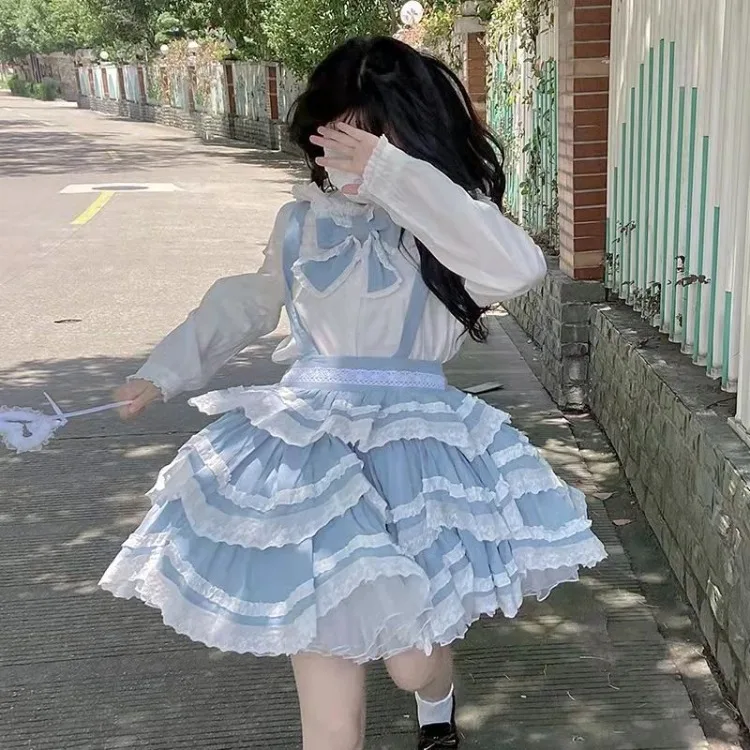 GETADME Harajuku Sweet Detachable Blue Strap Skirts 2025 Summer New A-line Skirt for Women Y2k Slim Waist Lace Ruched Faldas Mujer