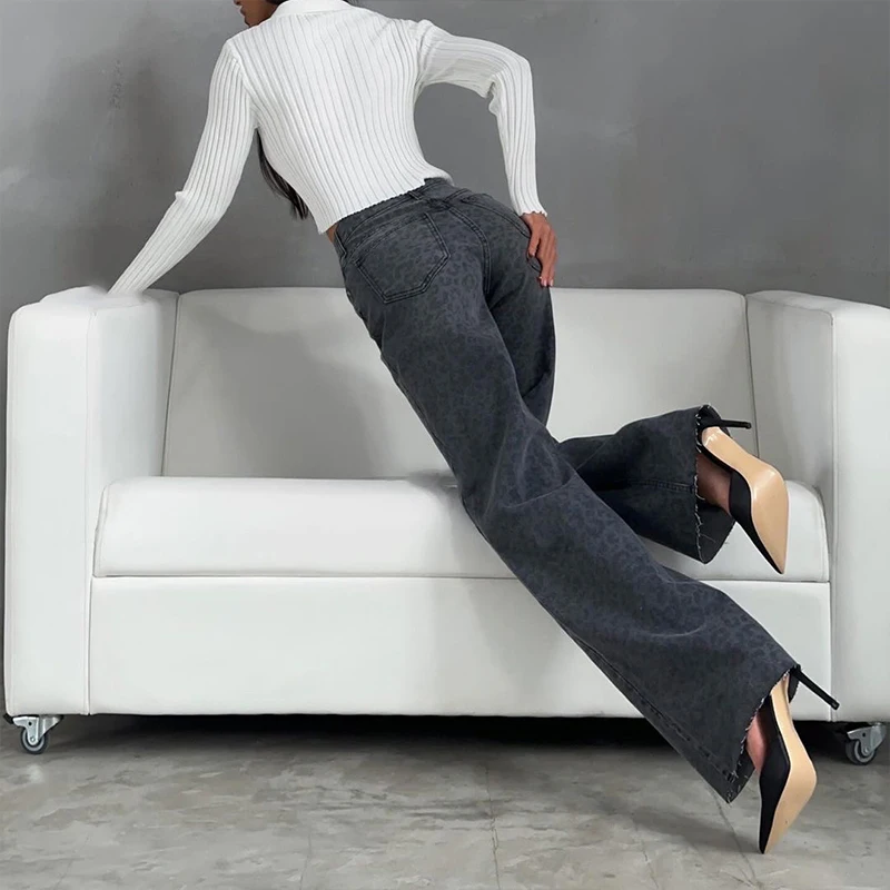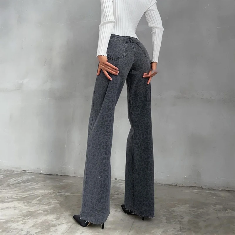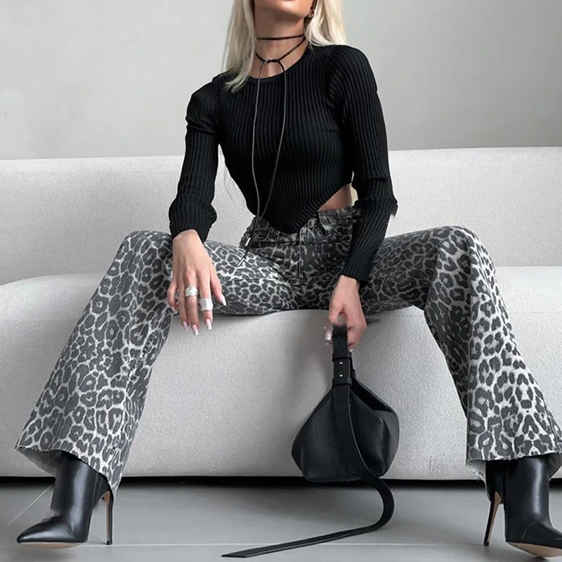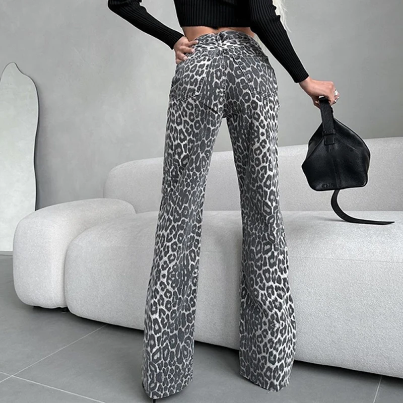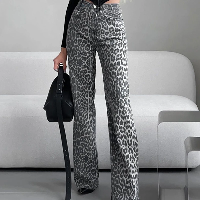 GETADME High Quality Gray Leopard Printed Pockets Straight Trousers Autumn&Winter Trend Club Slim Streetwear Long Pants Ladies 2025