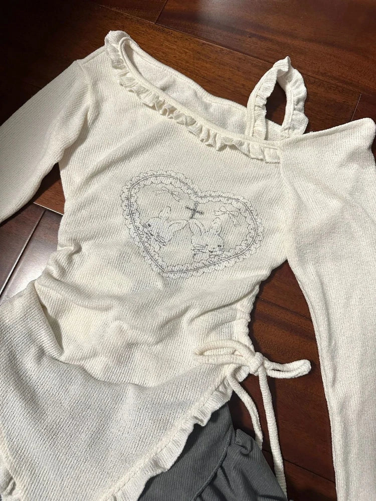GETADME Japanese Kawaii Two Piece Set Women Sweet Rabbit Print Cute Skirt Suit Female Korean Slim Tops+Princess Cake Skirt 2025 Autumn