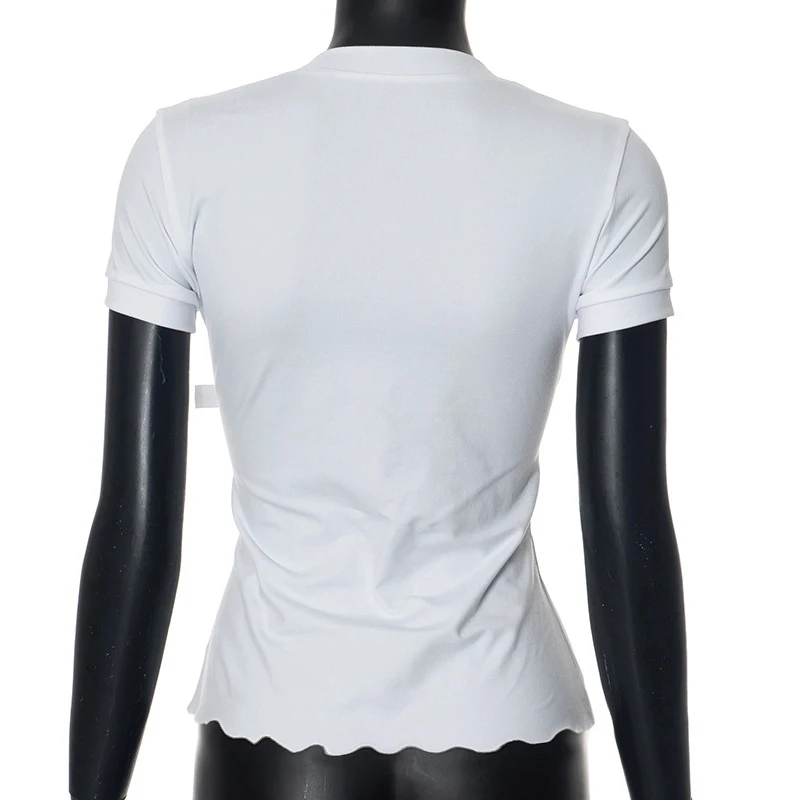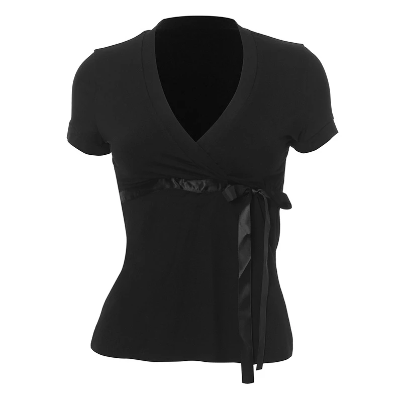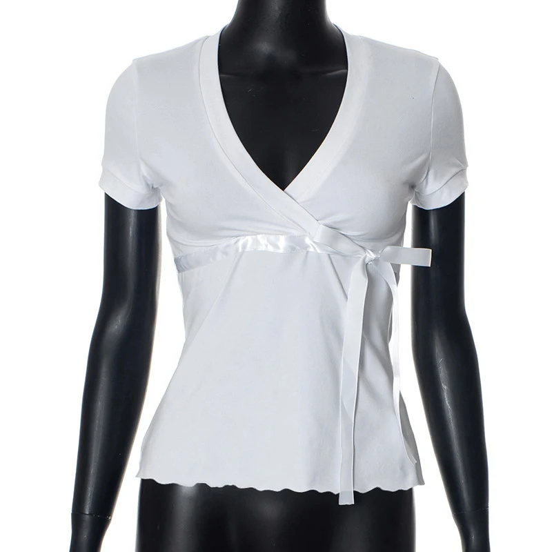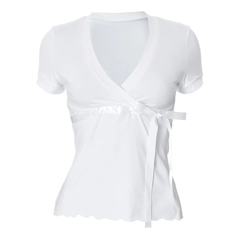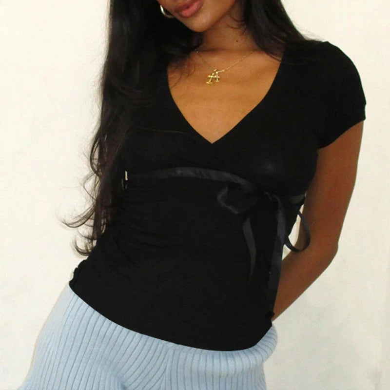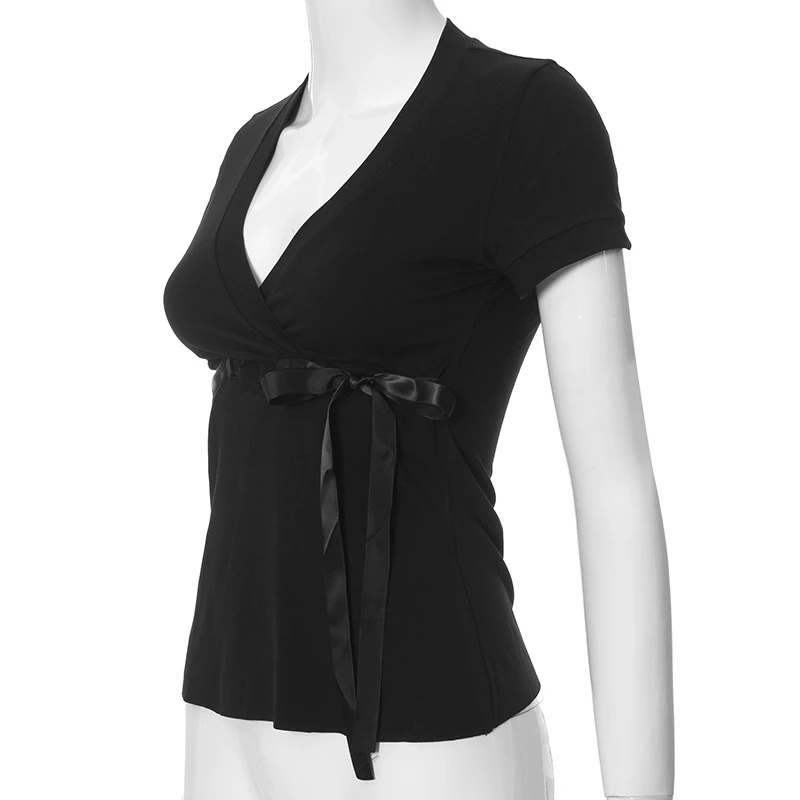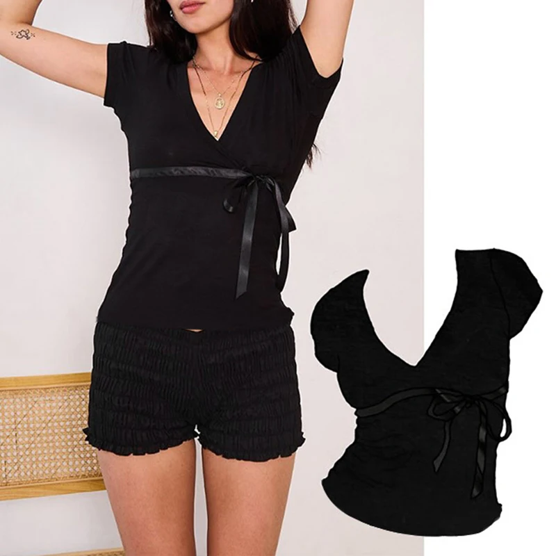 GETADME Lady Deep V Neck Solid Color Bowknot Sweet Girl's Summer Skinny Lace Up T shirts Short Sleeve Sexy Pullover Top 2025 Clubwear
