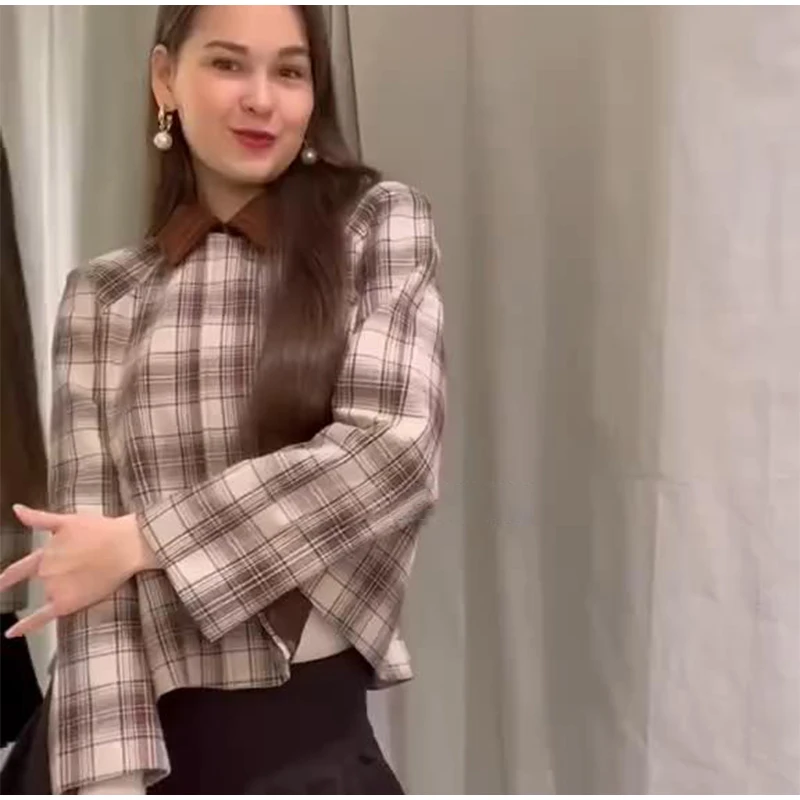 GETADME Panelled Plaid Turn-Down Collar Jackets Women Casual Loose Long Sleeve Short Jacket Female 2025 Spring Temperament Outwear Tops