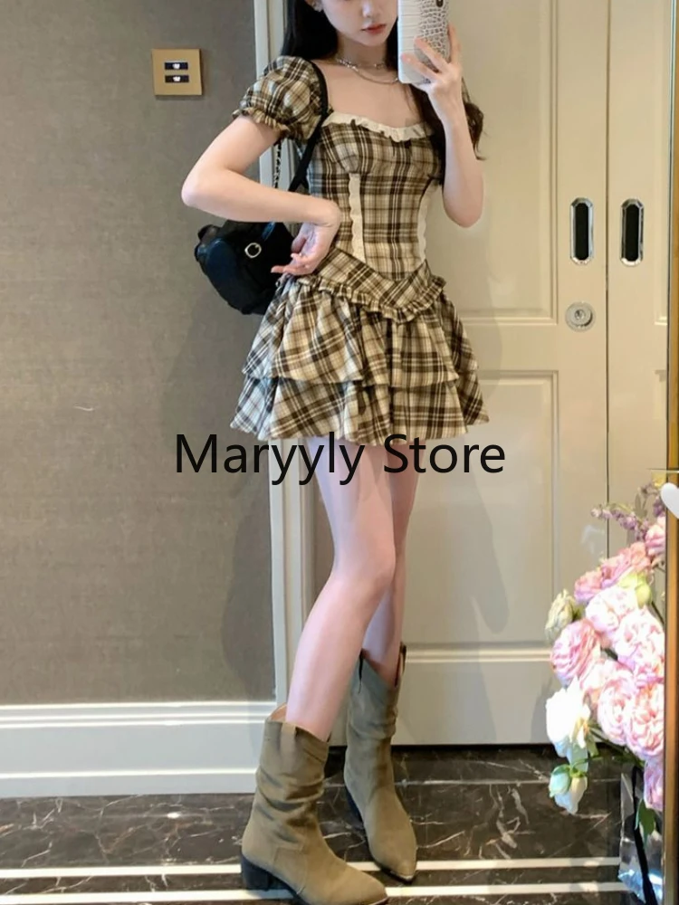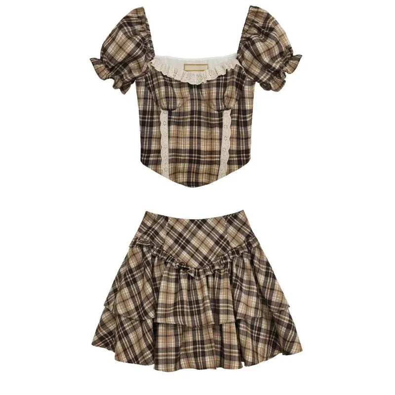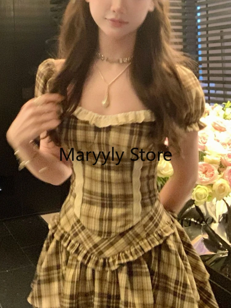 GETADME Plaid Retro Elegant 2 Piece Dress Set Female French Y2k Crop Tops + High Waist Mini Skrits 2025 Summer Korean Fashion Suits