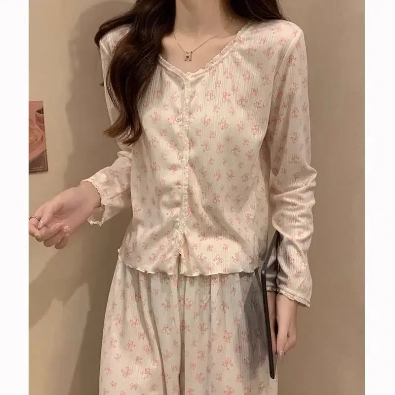 GETADME Princess Style Long Sleeved Pajamas Women Spring Autumn 2025 New Sleepwear Cardigan Round Neck Floral Homewear Two-piece Set