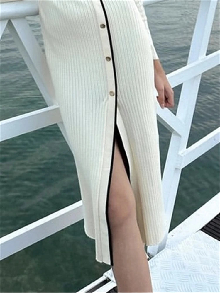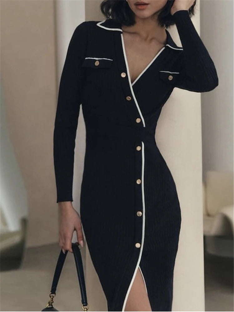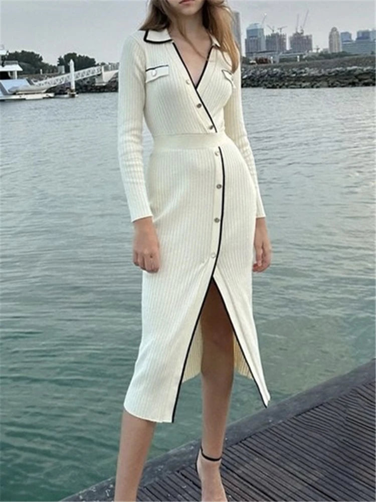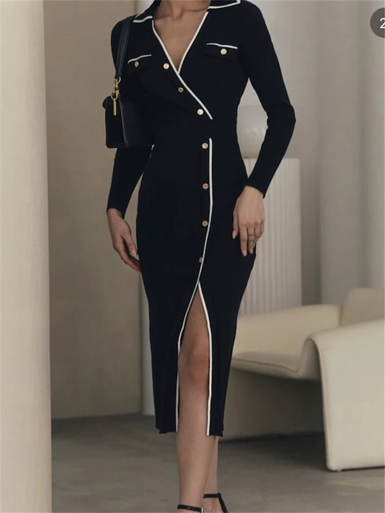 GETADME REALEFT Spring 2025 New Elegant Cross V-Neck Women's Knitting Dresses Female Single Breasted Straight Long Sleeve Midi Dress
