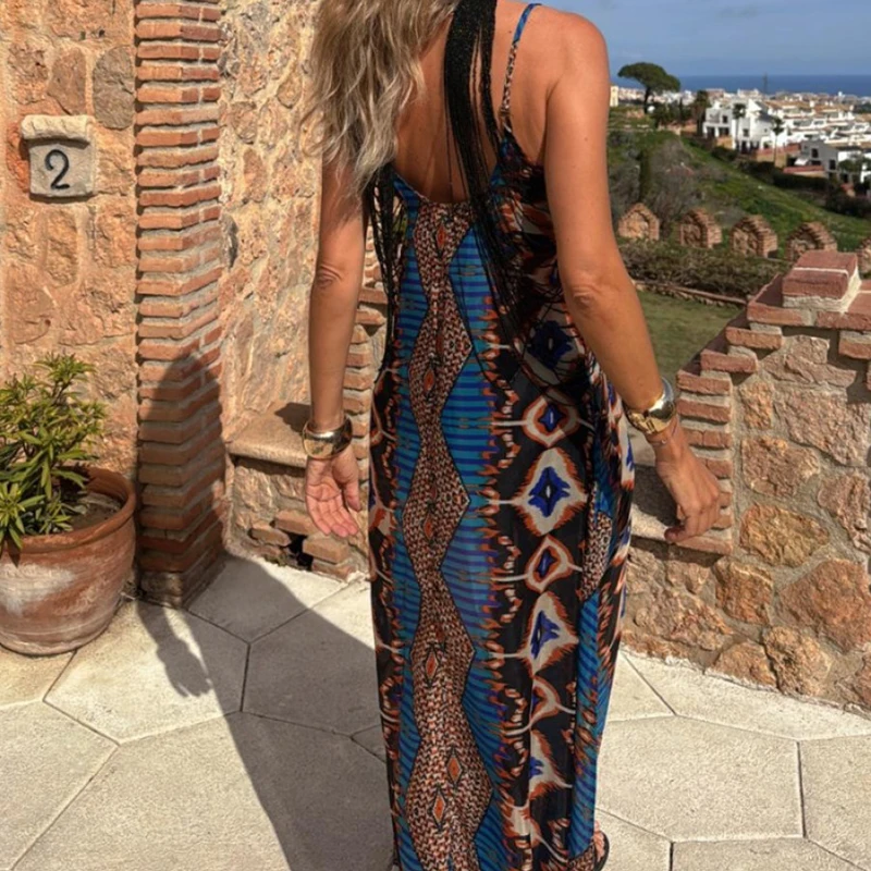 GETADME Sexy Lady V-neck Sleeveless Suspender Dress Casual Off Shoulder Bohemian Beach Dress 2025 Retro Pattern Printed Loose Long Dress
