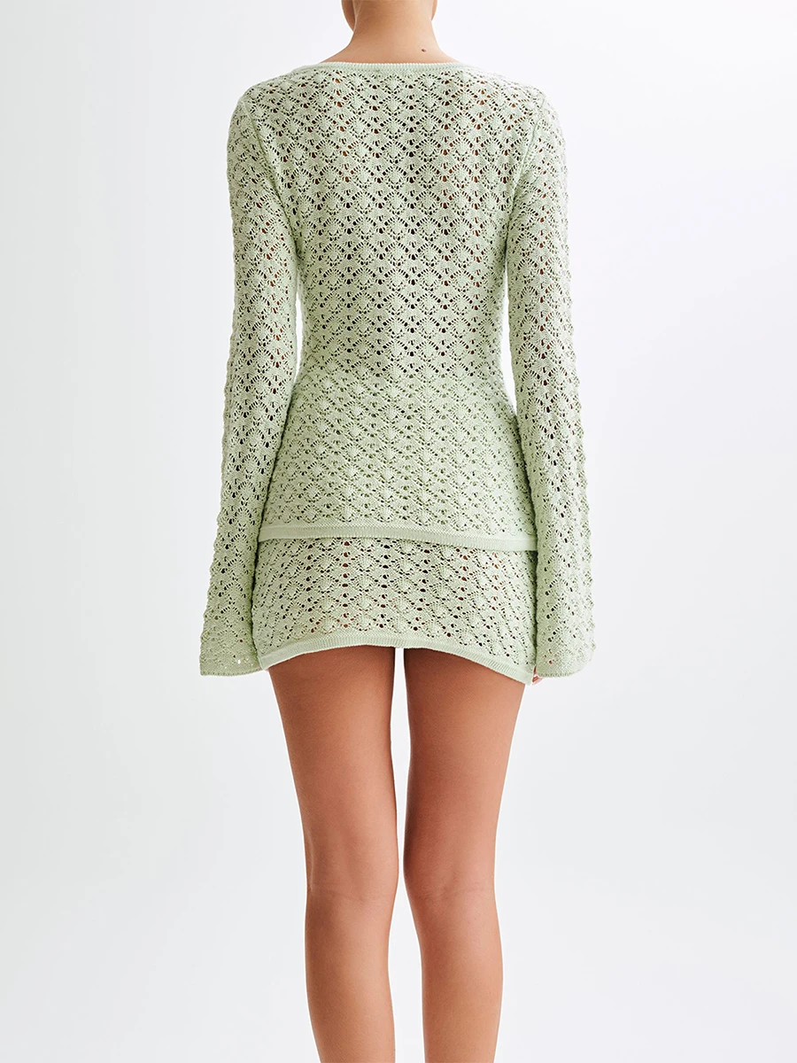 GETADME White Hollow Out Knit Skirts Sets for Women Bohemian Holidays Two Piece Sets Sexy Long Sleeve Cardigan Mini Skirts Suits 2025