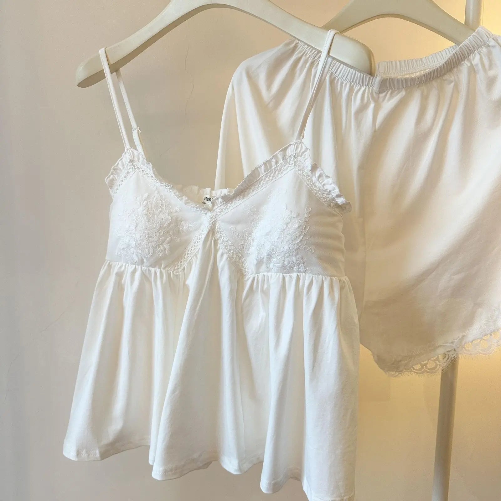 GETADME White Women Pajamas Summer Sleepwear Spaghetti Strap Shorts Sets 2 Pieces Padded Night Wears Korean Sleeping Lace Home Suit 2025