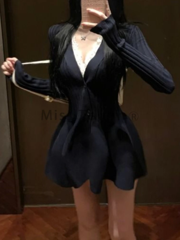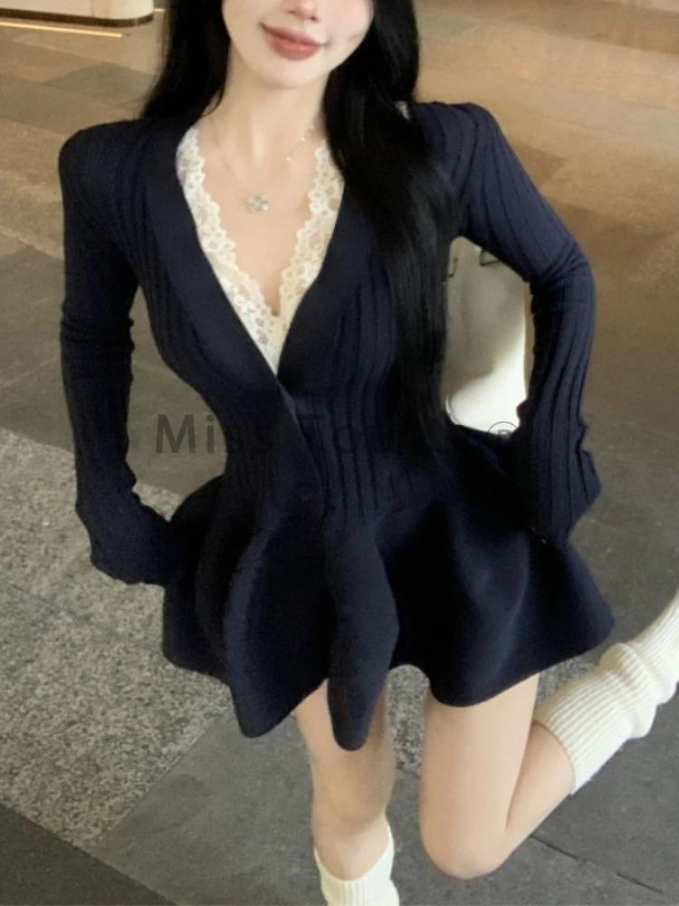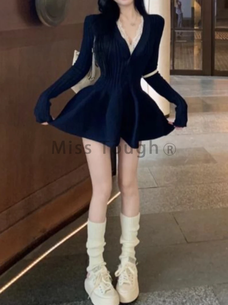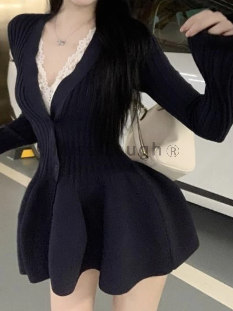 GETADME Winter Korean Fashion V Neck Knit Dress Women Designer Sweet Slim Sweater Dresses Female Retro Solid Y2k Knitted Dress New 2025