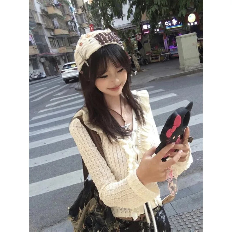 GETADME Deeptown Vintage Gothic Y2k Knit Shirts Women Aesthetic Long Sleeve Blouses V Neck Slim Grunge Harajuku Gyaru Japanese 2000s