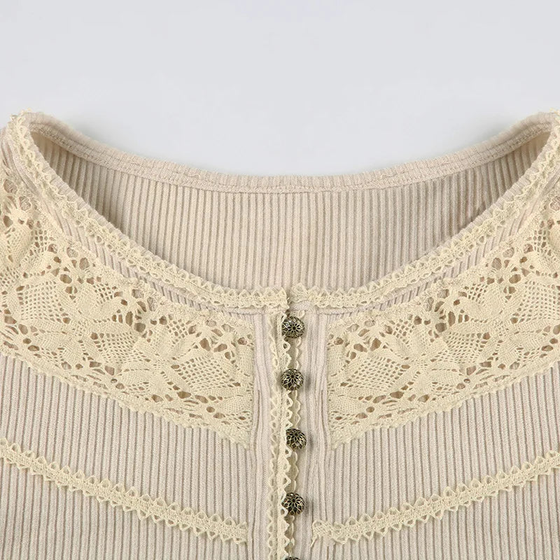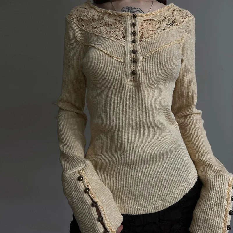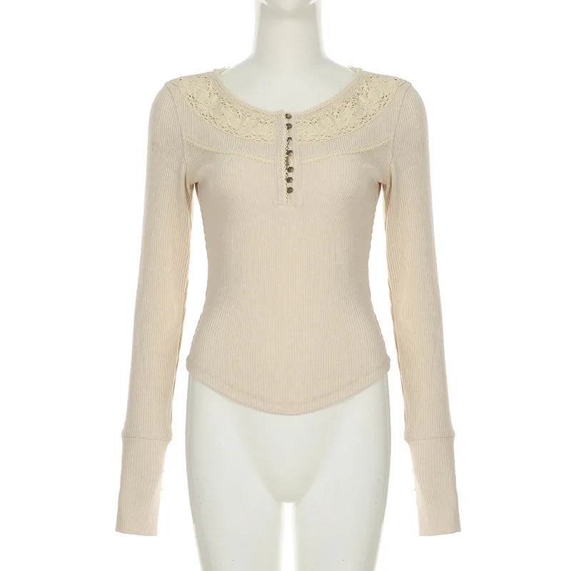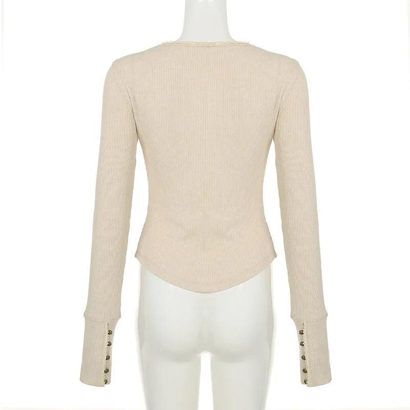 GETADME Hollow out Crop Tops y2k Aesthetic Round necked Fairy Grunge Women Knitted Button Long Sleeve Slim TShirts Harajuku Tees Clothes