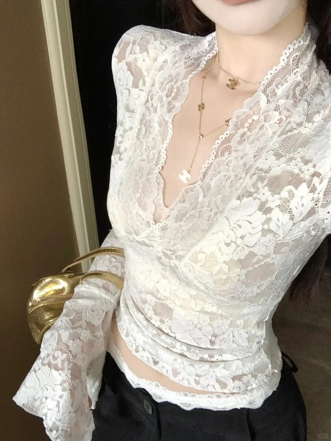 GETADME See Through Sexy T-Shirts Fashion Women Flare Long Sleeve Spring Summer Lace Beauty Crop Tops Casual Streetwear V-Neck Chic Tees