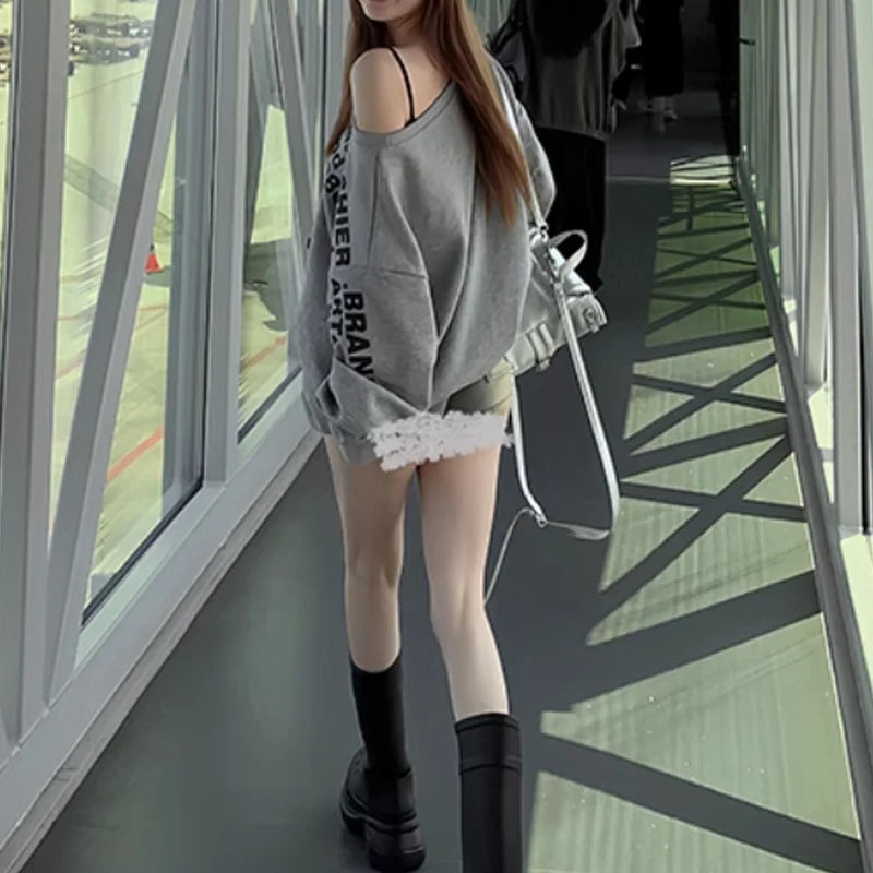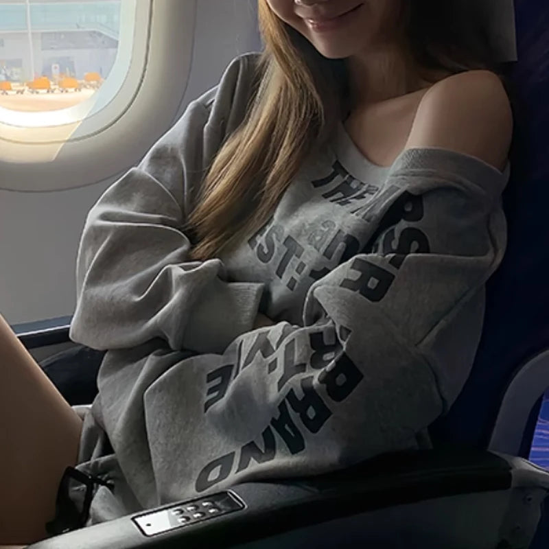 GETADME Spring Autumn New Skew Collar Long Sleeve Fashion Sweatshirts Women High Street Letter Printing Pullovers Elegant Loose Tops